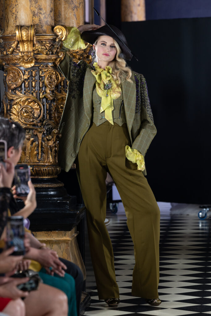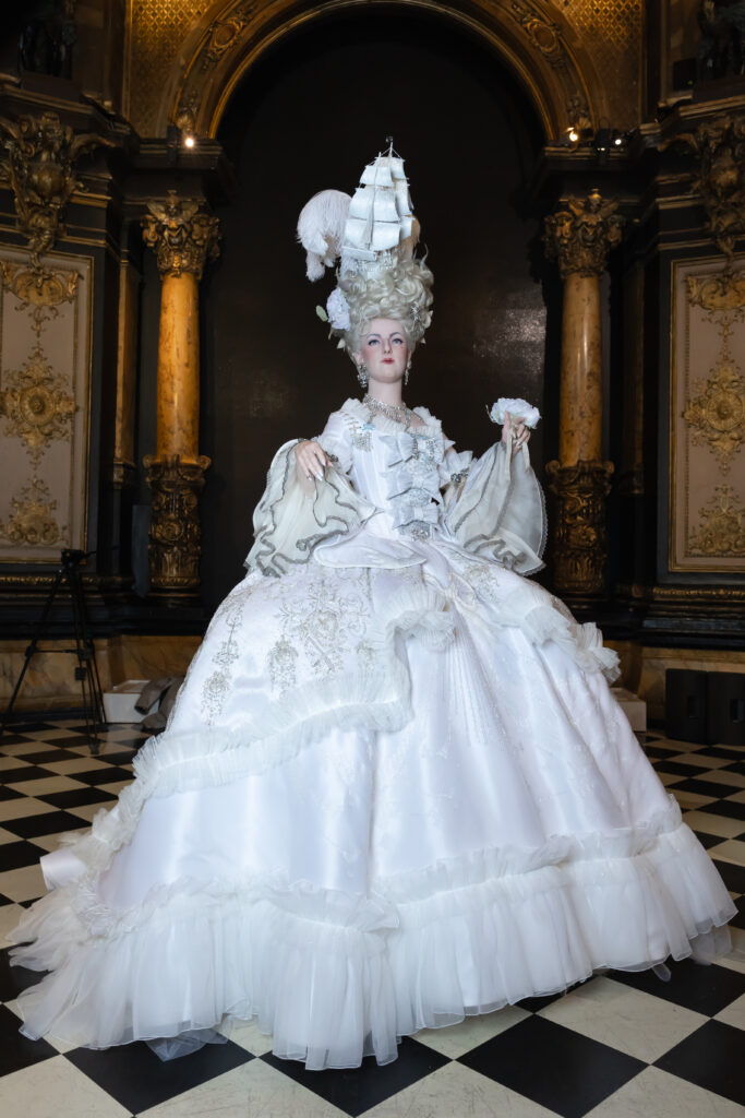 Julien Fournié a également été invité par le Musée Grévin à créer une tenue pour la statue de Marie-Antoinette. Cette œuvre magistrale présente un costume de cour avec un corset aiguilleté, une jupe et des manches volantées en triple organza de soie blanche. Les motifs de broderies en argent et or lune rappellent les symboles de la cour de France et les motifs de Versailles. La coiffure de la statue, ornée de rubans, plumes et perles, est surmontée d’un galion floqué étincelant, faisant écho aux armoiries royales de la reine.