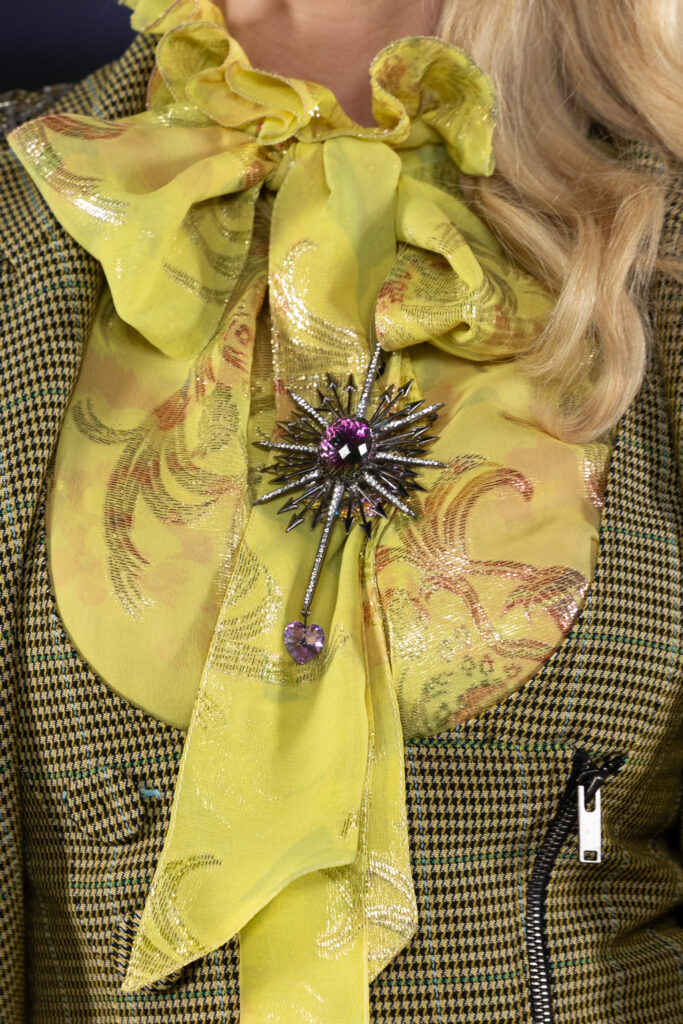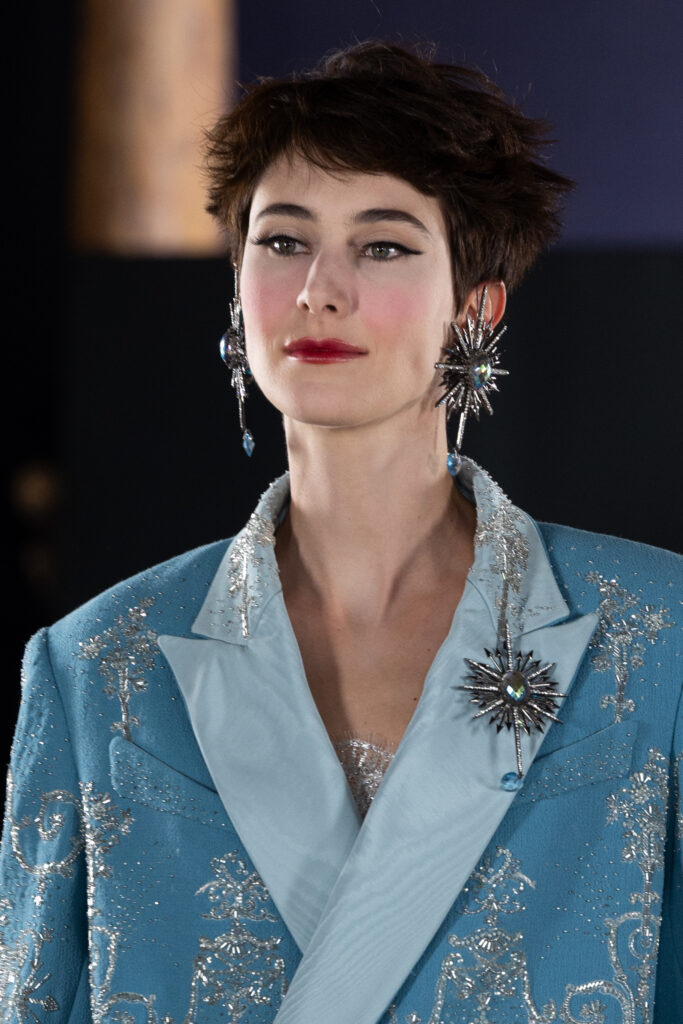 Parmi les créations, un trench-coat en soie lavée prune, brodé de motifs végétaux en argent vieilli, révèle un ensemble en cuir pastel avec des incrustations de fleurs-de-lys et des ornements de nœuds. Les accessoires, tels que les boucles d’oreilles et broches « Ex Voto », les cabas monogrammés et le nouveau sac « Big Bang », complètent ces tenues avec élégance.