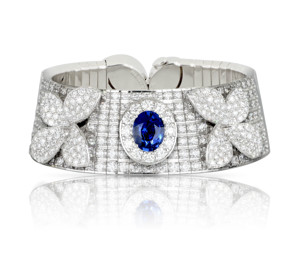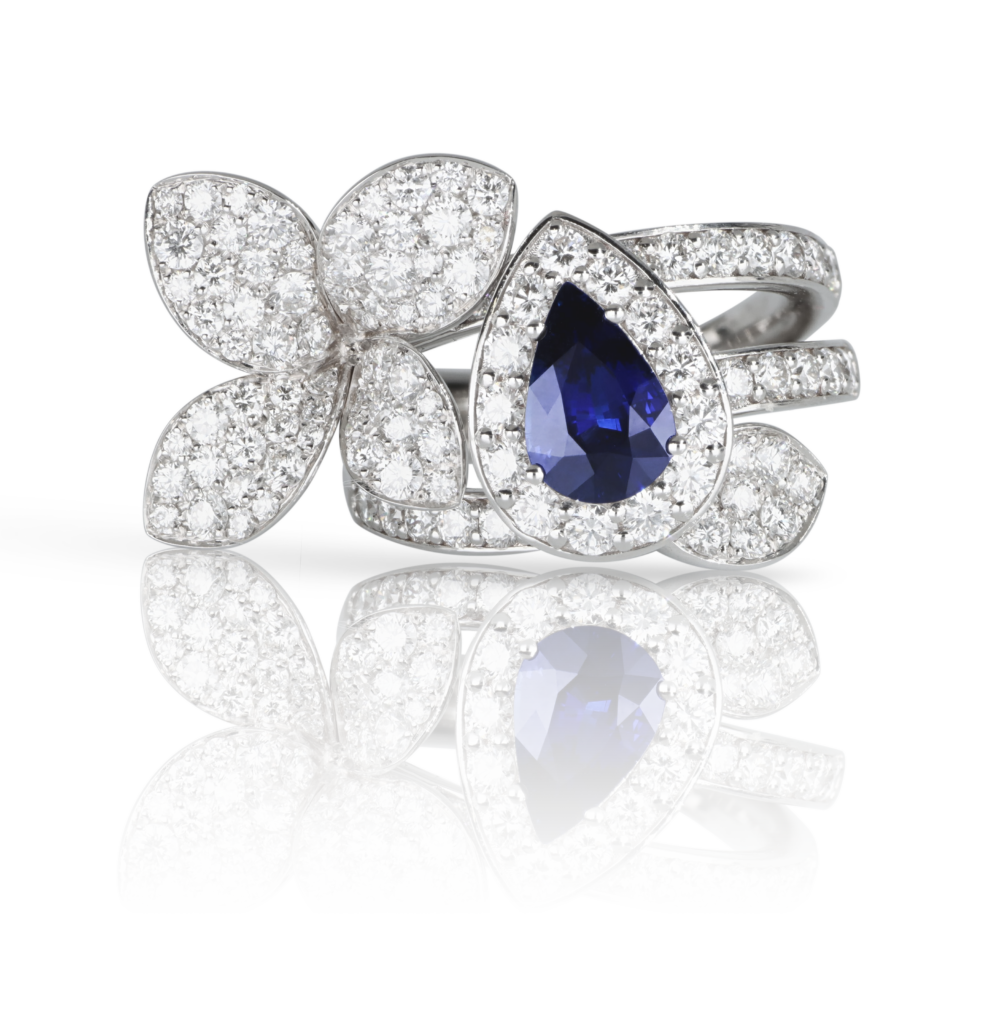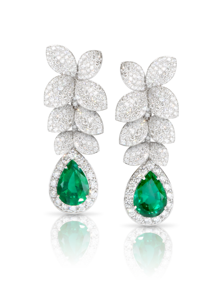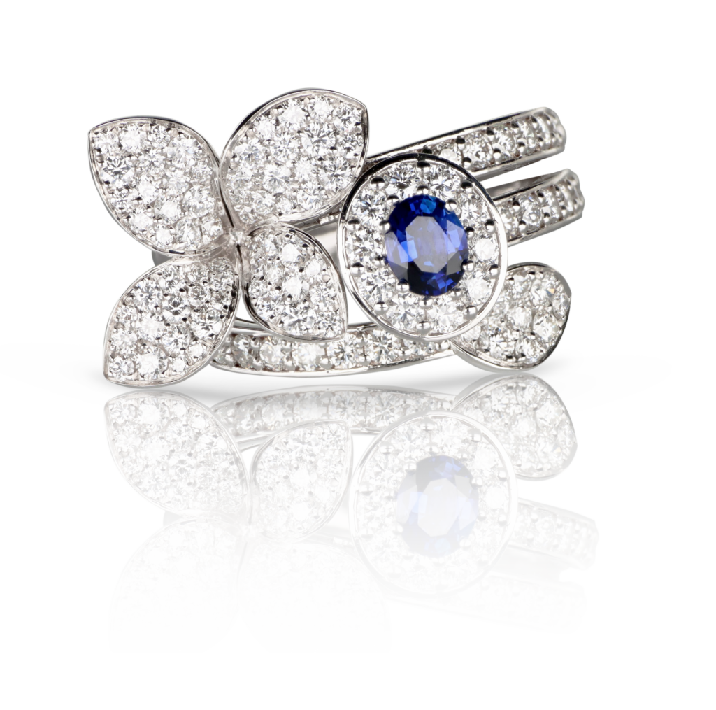 - Bagues et Boucles d’oreilles : Les bagues et boucles d’oreilles présentent des rubis, saphirs et émeraudes taillés en ovale, enchâssés dans des montures de diamants, symbolisant la passion, la vérité et la renaissance.