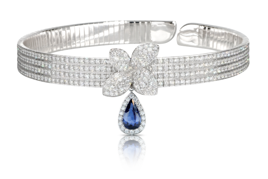 - Colliers : Les combinaisons de colliers en or blanc 18 carats, sertis de diamants et ornés de pendants en saphirs bleus, émeraudes ou rubis, incarnent l’élégance et l’évocation des éléments naturels.