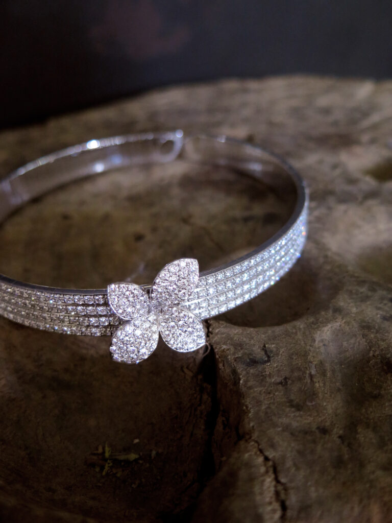 - Bracelets : Des bracelets en or blanc, agrémentés de diamants et de gemmes précieuses, offrent une allure raffinée et intemporelle.