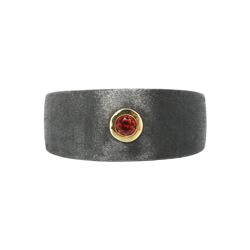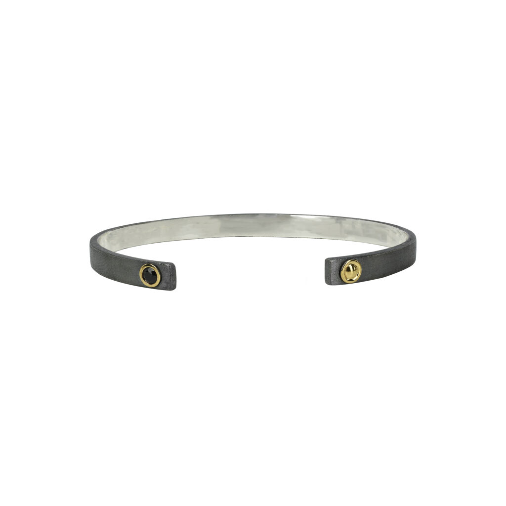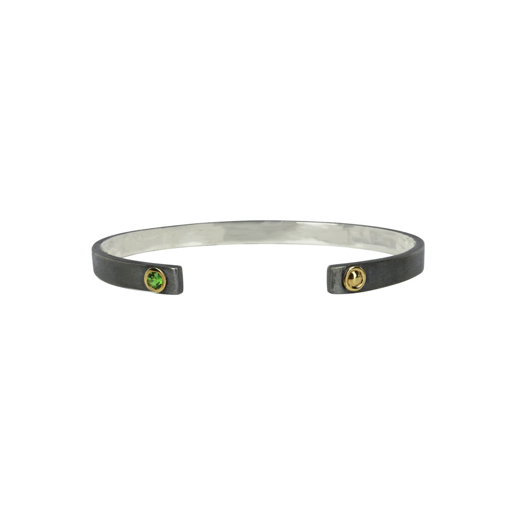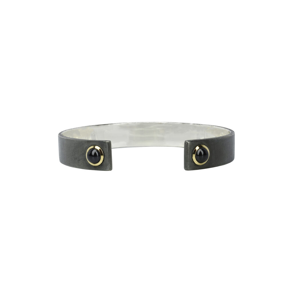 Les créations de cette collection sont sculptées dans un argent noirci mat, une matière qui confère aux pièces une allure résolument moderne et virile. Les contrastes des matériaux sont mis en exergue par l’usage de pierres précieuses, telles que des diopsides, des saphirs et des grenats, rehaussées d’un serti clos en or blanc, jaune ou rose. Ces éléments donnent vie à des bracelets et des bagues qui se déclinent en différentes largeurs, répondant aux goûts diversifiés des hommes modernes.