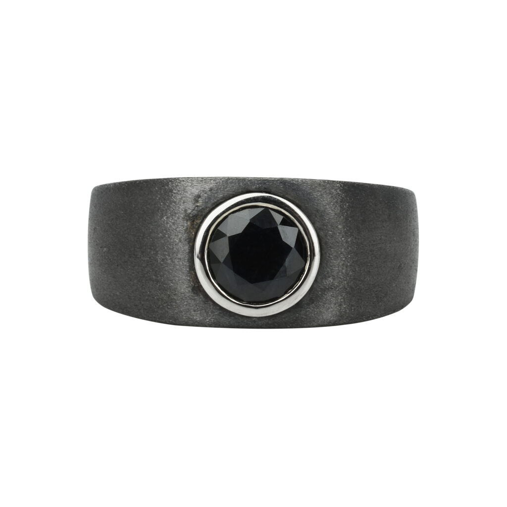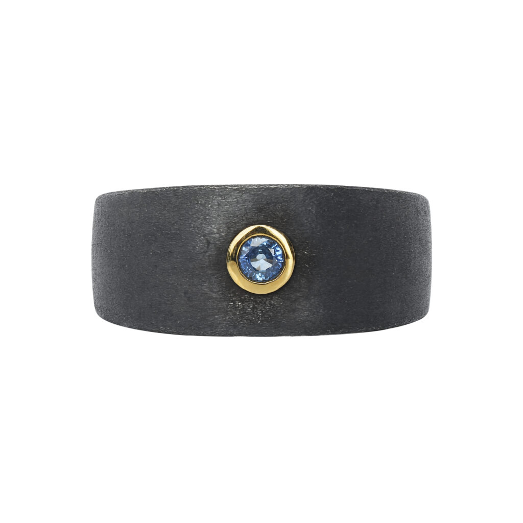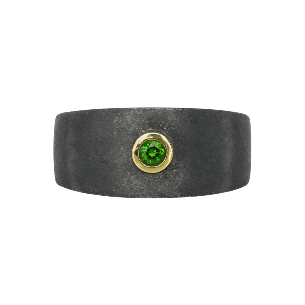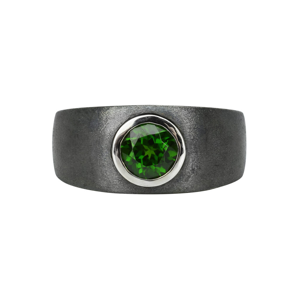 Les créations de cette collection sont sculptées dans un argent noirci mat, une matière qui confère aux pièces une allure résolument moderne et virile. Les contrastes des matériaux sont mis en exergue par l’usage de pierres précieuses, telles que des diopsides, des saphirs et des grenats, rehaussées d’un serti clos en or blanc, jaune ou rose. Ces éléments donnent vie à des bracelets et des bagues qui se déclinent en différentes largeurs, répondant aux goûts diversifiés des hommes modernes.