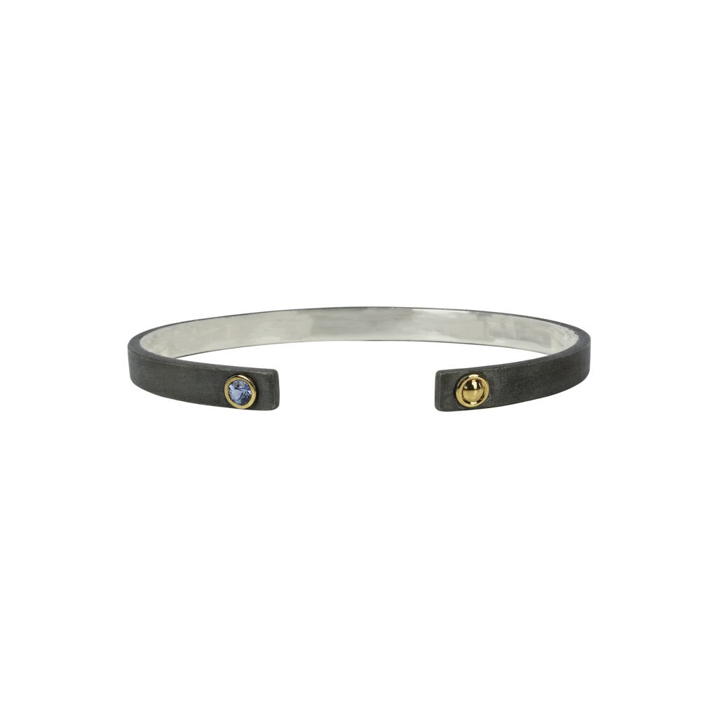 Parmi les pièces maîtresses de cette collection, le bracelet en argent noirci avec diopside serti et rivet en or jaune 750/1000e se distingue par son élégance sobre, proposé au prix de 540 euros. De même, le bracelet en argent noirci avec saphir bleu serti clos et rivet or jaune, vendu à 640 euros, reflète une finesse d’exécution et une attention aux détails qui sont la marque de fabrique de la maison Isabelle Langlois.