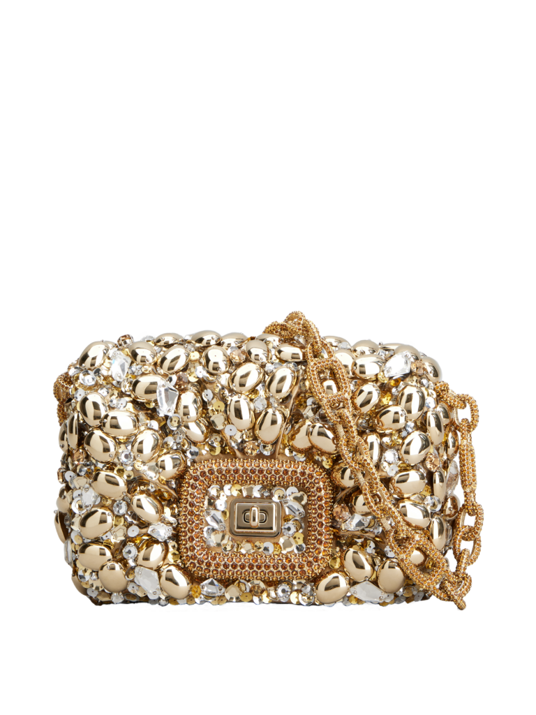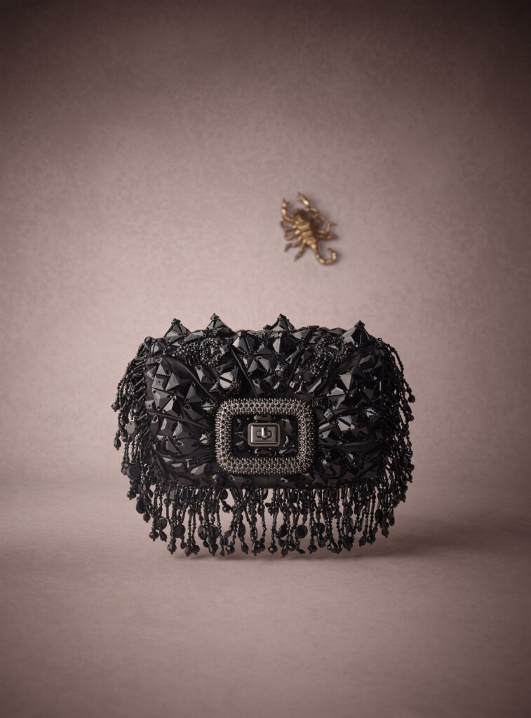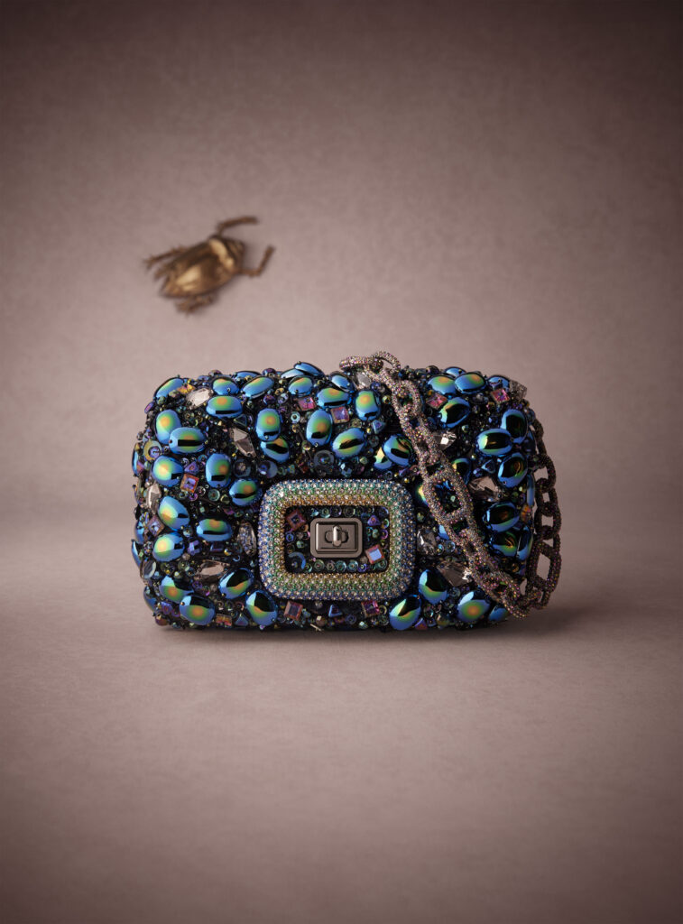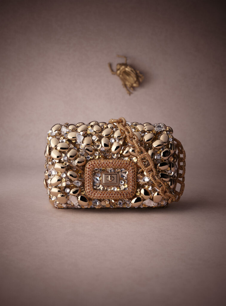 - ADELE et NEFERTITI : Ces sacs célèbrent le scarabée avec des pierres d’or, des strass ambre fumé, et des perles polychromes.