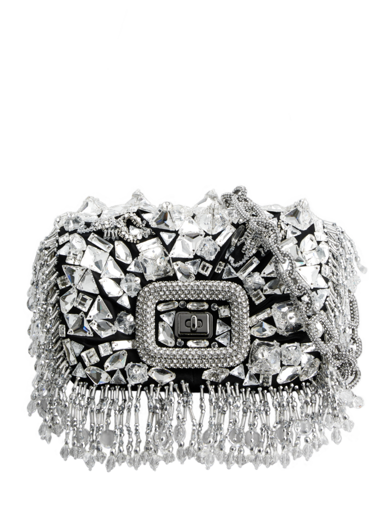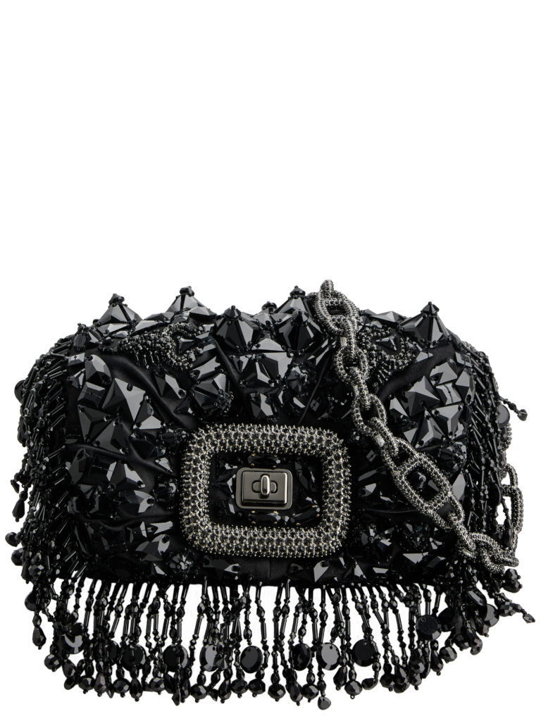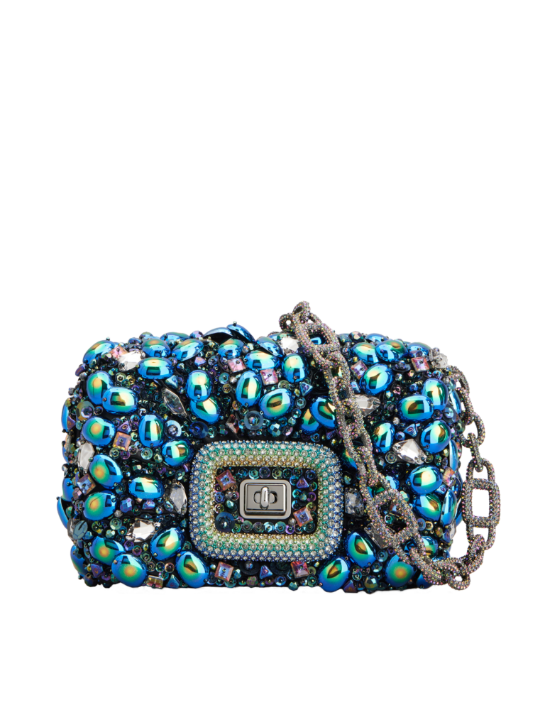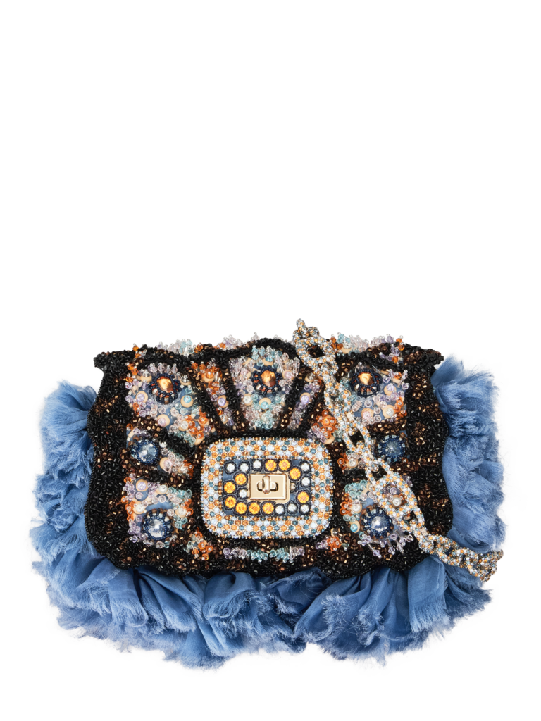 - ADELE et NEFERTITI : Ces sacs célèbrent le scarabée avec des pierres d’or, des strass ambre fumé, et des perles polychromes.
