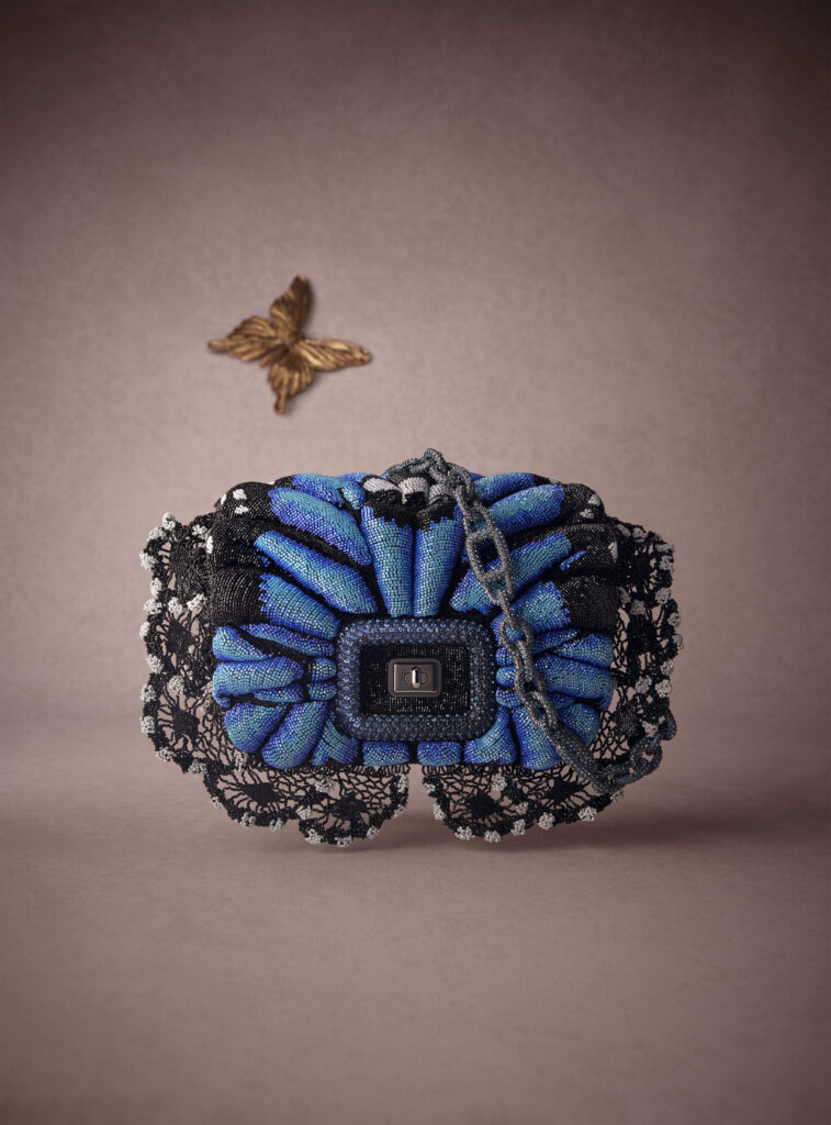 - ICARUS : Sur une base d’organza noir, les ailes d’un Argus bleu sont détaillées de strass noirs et bleus, créant une illusion de mouvement vivant.
