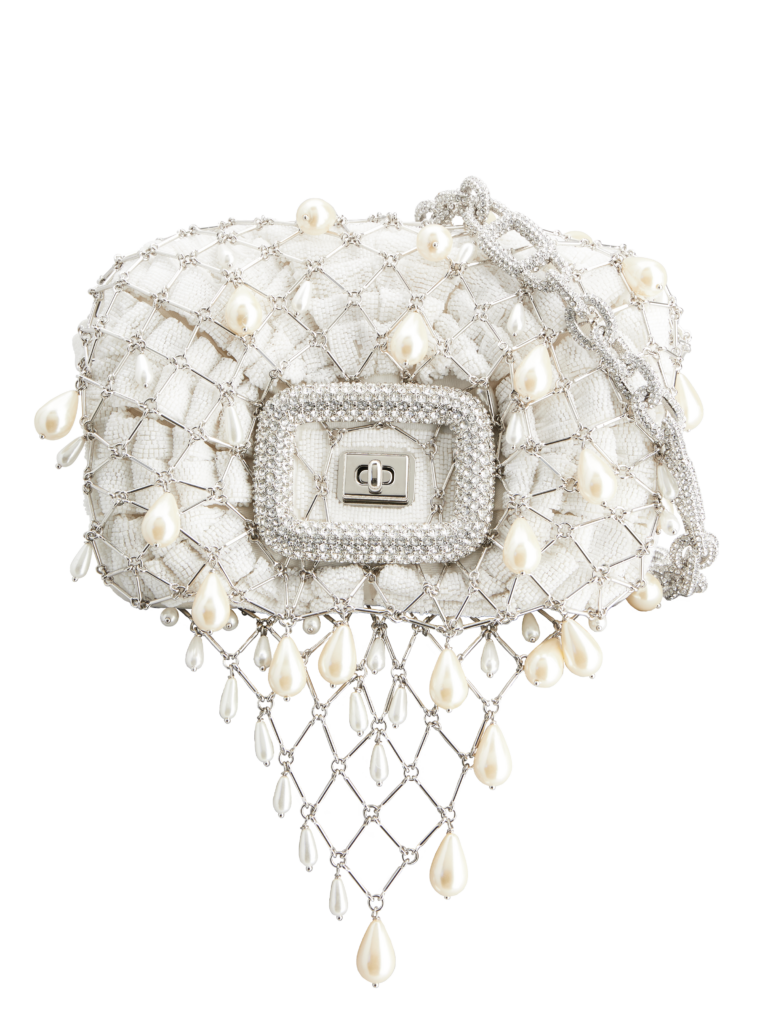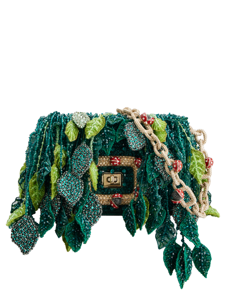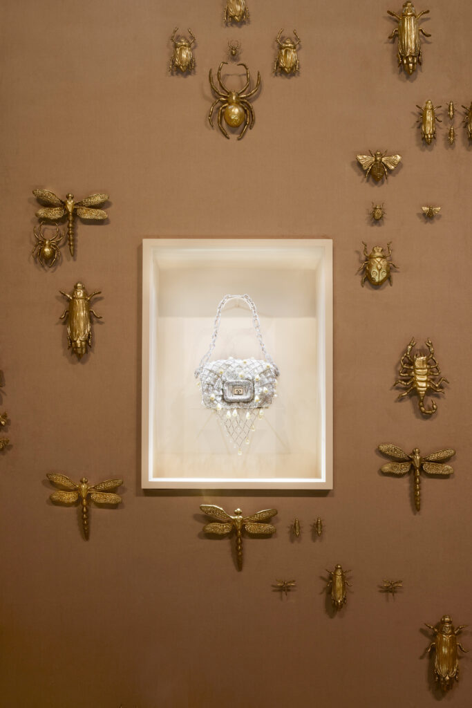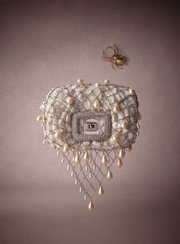 - TOILE PERLÉE et TOILE DE NUIT : Hommage à l’araignée, ces sacs utilisent des structures métalliques et des broderies en cristal pour imiter les toiles de la créature.