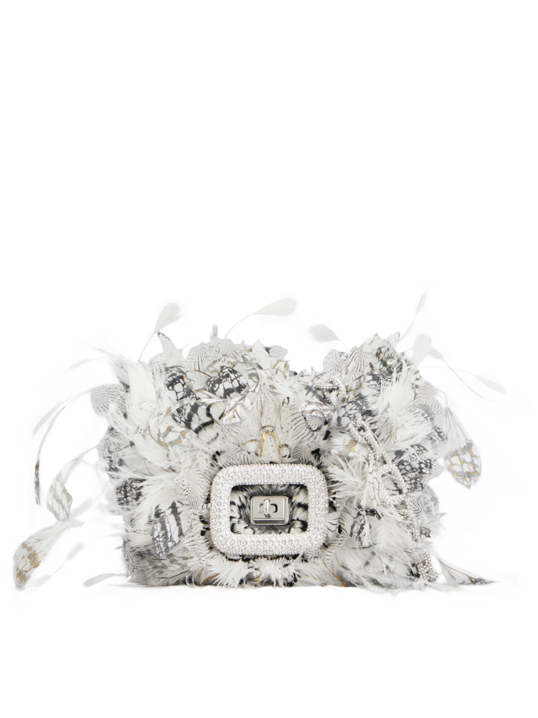 - APOLLO : Ce sac célèbre l’art du plumassier avec des plumes appliquées à la main, créant une mosaïque blanche immaculée.