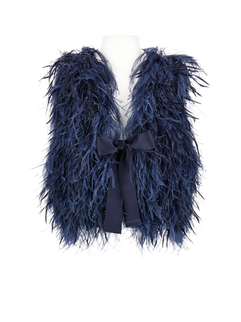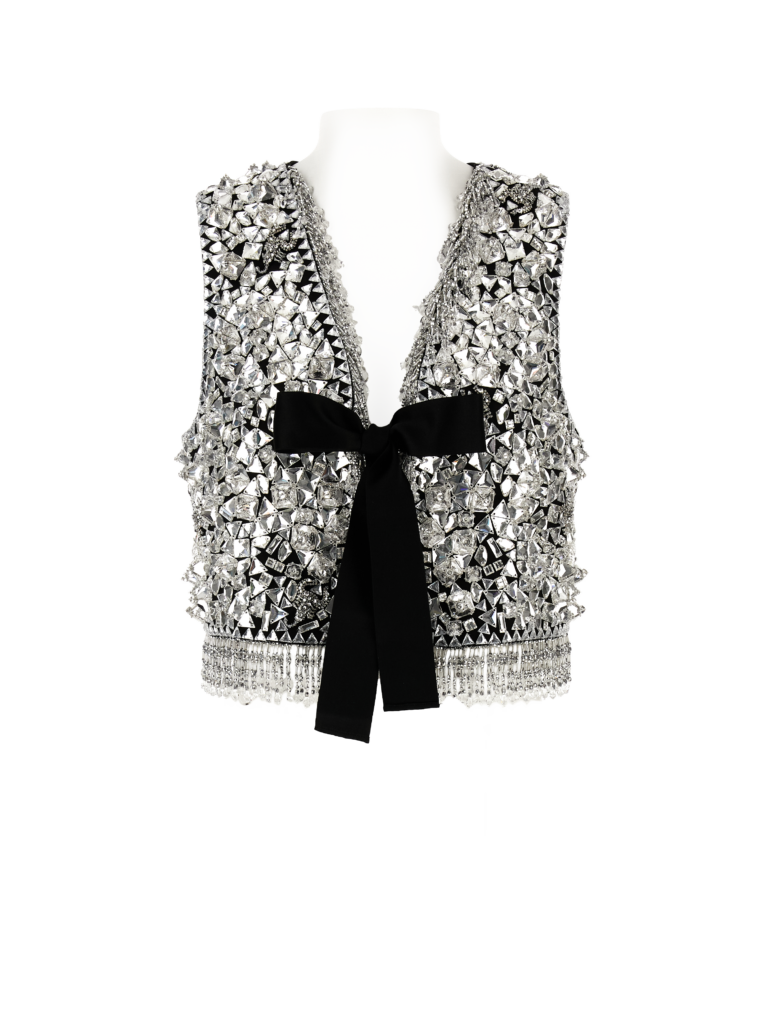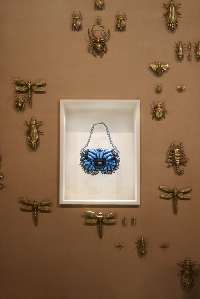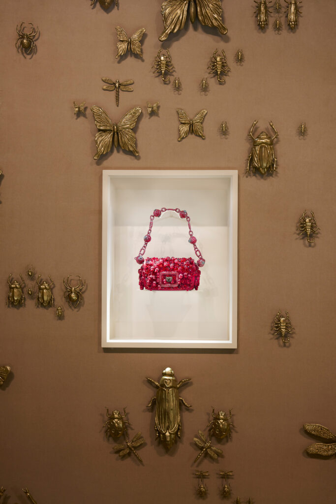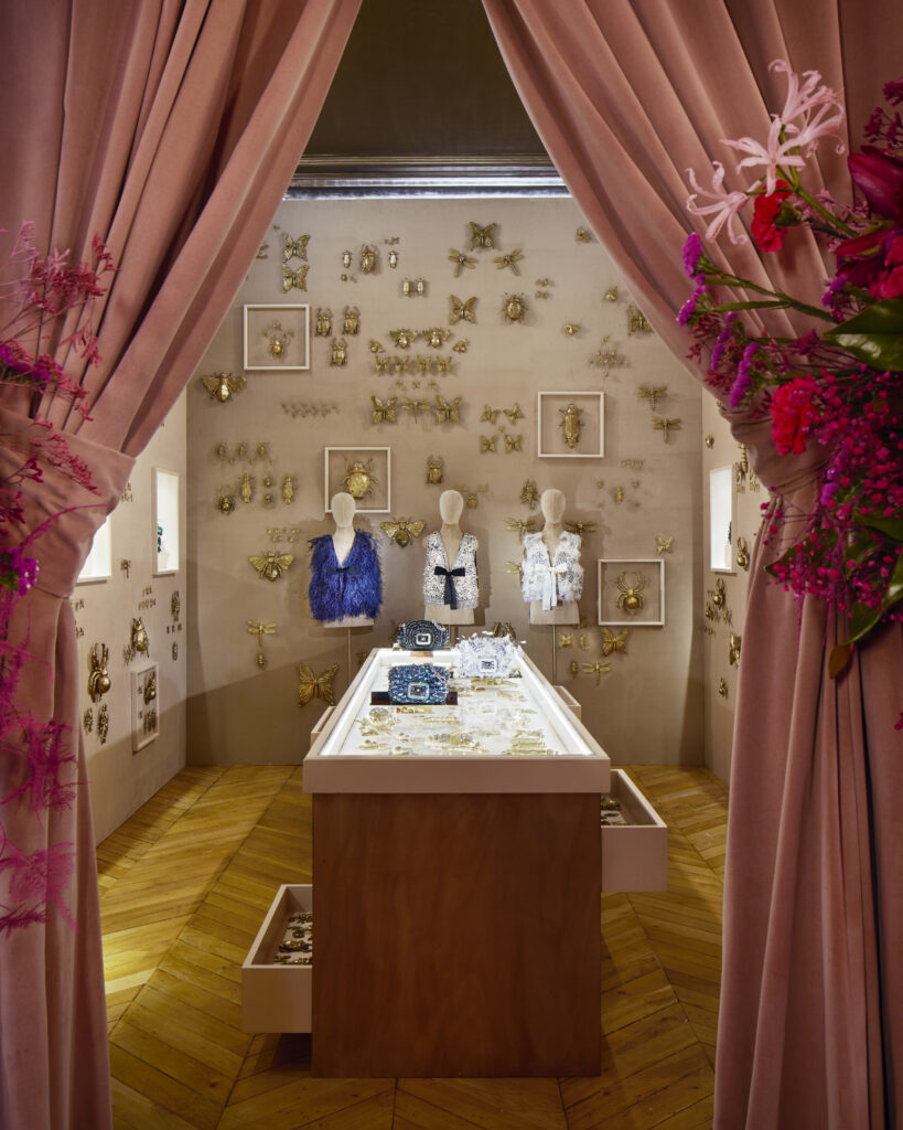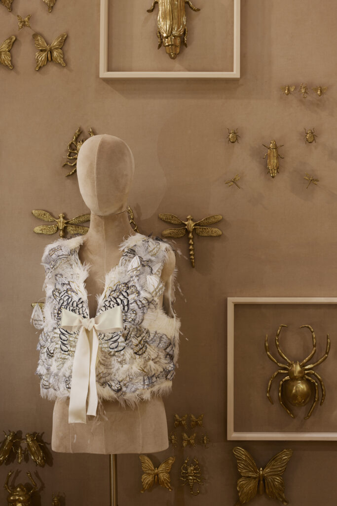 Les créations de Gherardo Felloni oscillent entre légèreté diaphane et une interprétation plus sombre de la beauté. Les pièces maîtresses de la collection comprennent des gilets ornés et des sacs à main, chaque modèle intégrant des techniques méticuleuses de broderie, de plumasserie, de métallurgie et de joaillerie. La Salle d’Argent, réimaginée comme un cabinet de curiosités, expose chaque création sur des murs de velours rose, entourée de constellations d’insectes dorés, fusionnant ainsi l’art de la couture avec l’émerveillement naturel.