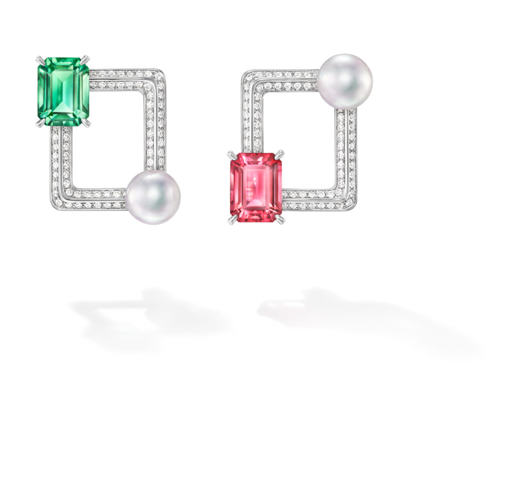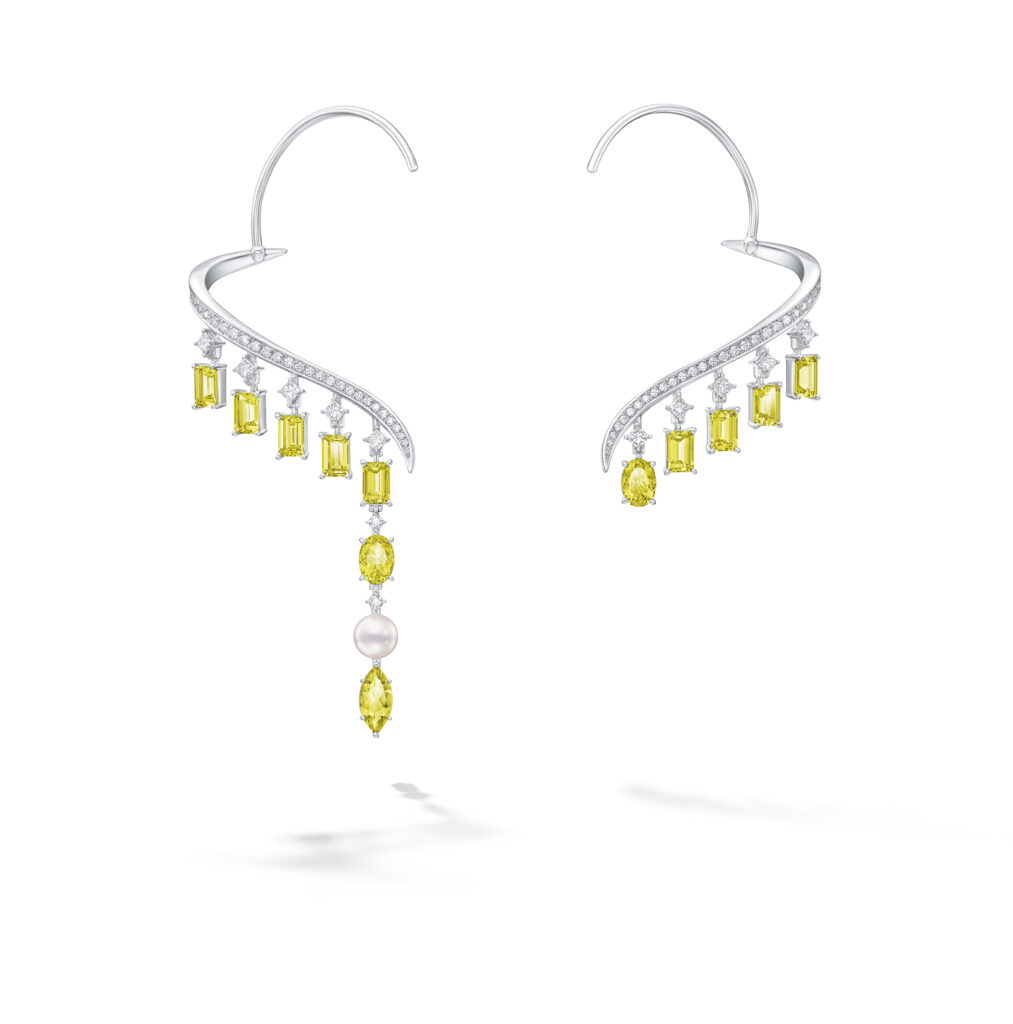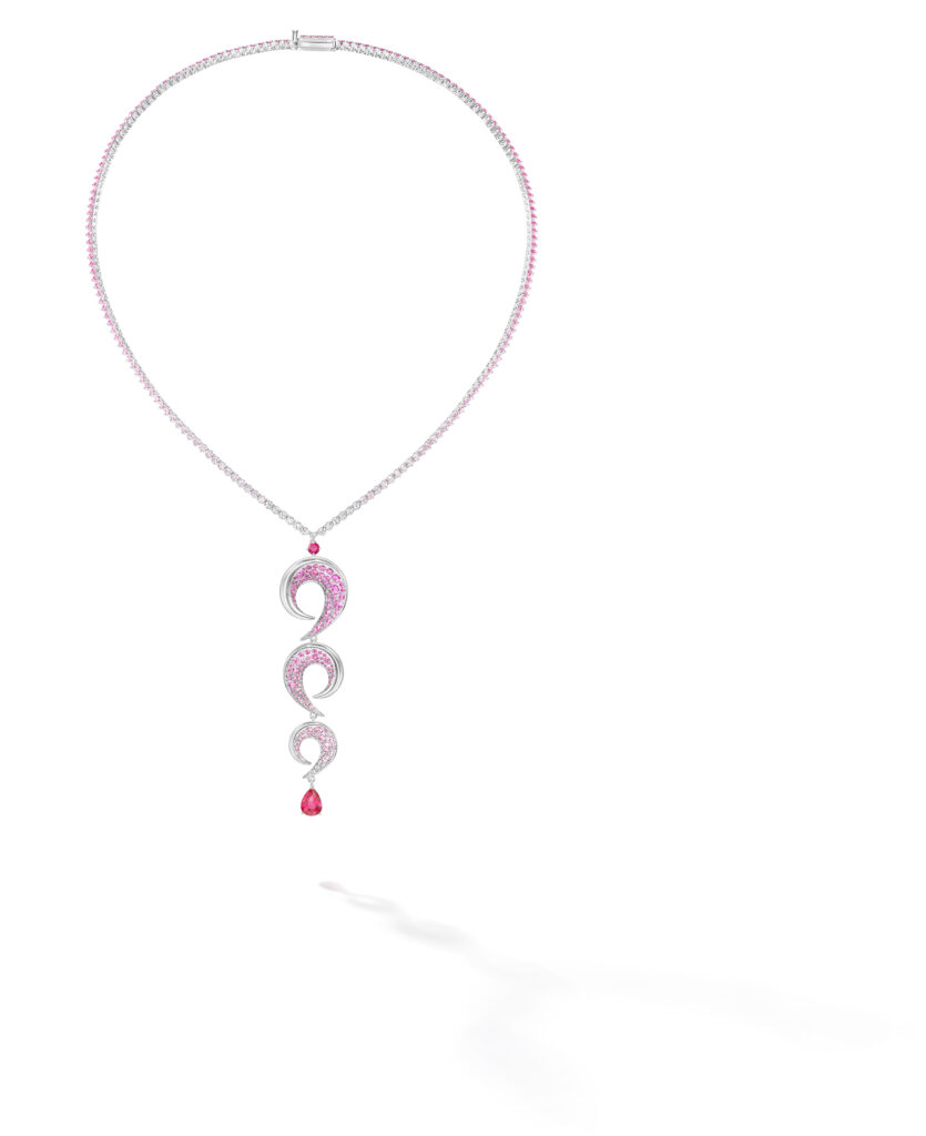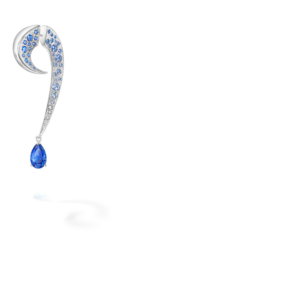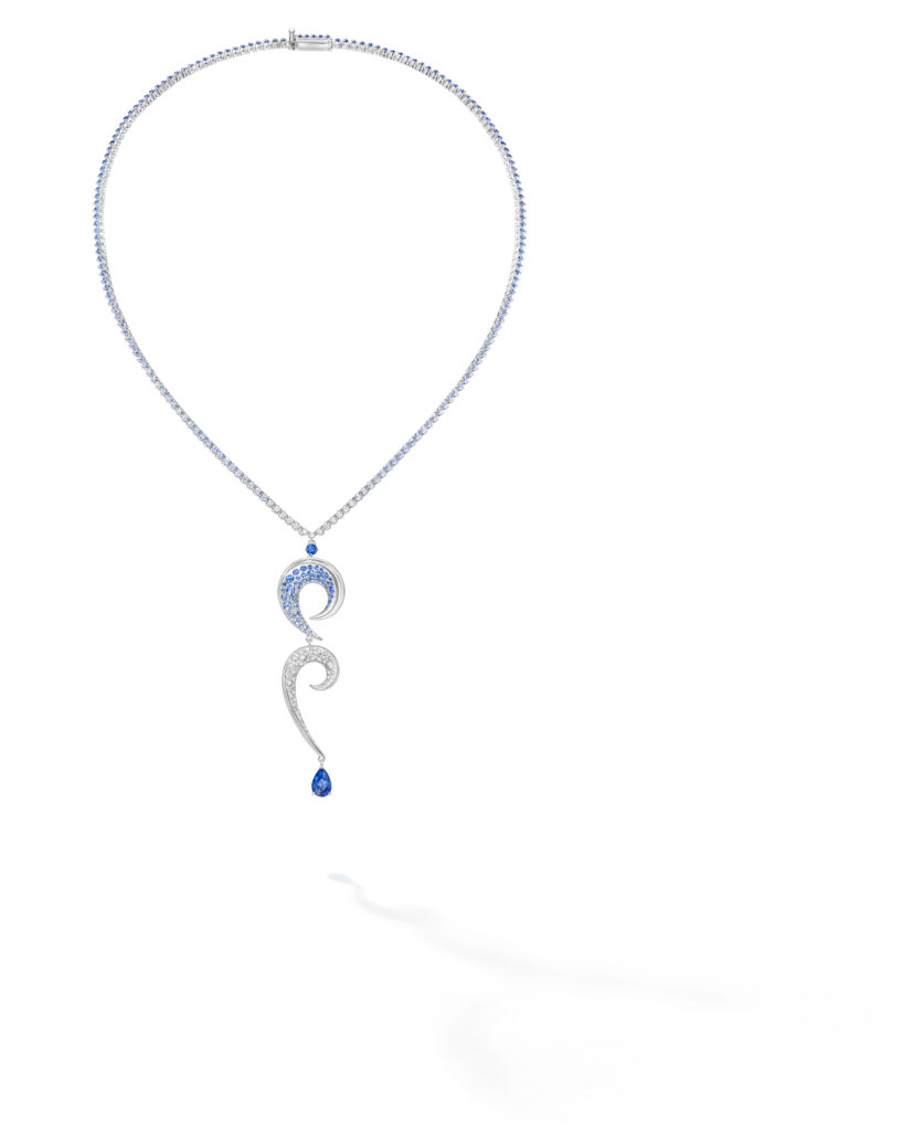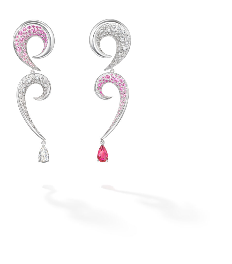 Le set « Cove » s’inspire des criques sculptées par les vagues, avec des pièces en or blanc, diamants et perles Akoya, représentant les embruns marins et la rondeur délicate des vagues. Les saphirs roses, grenats grossulaire et autres pierres de couleur ajoutent une touche de vivacité et de modernité à ces créations.