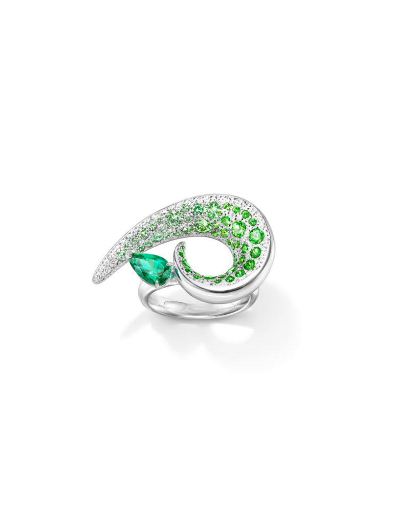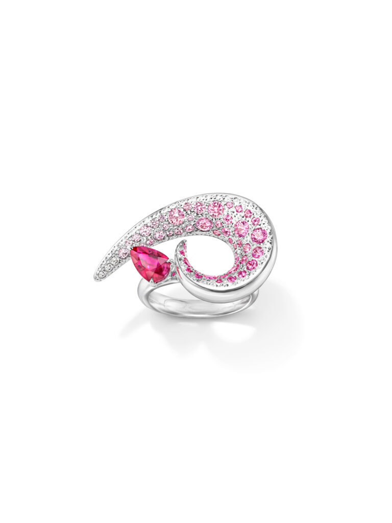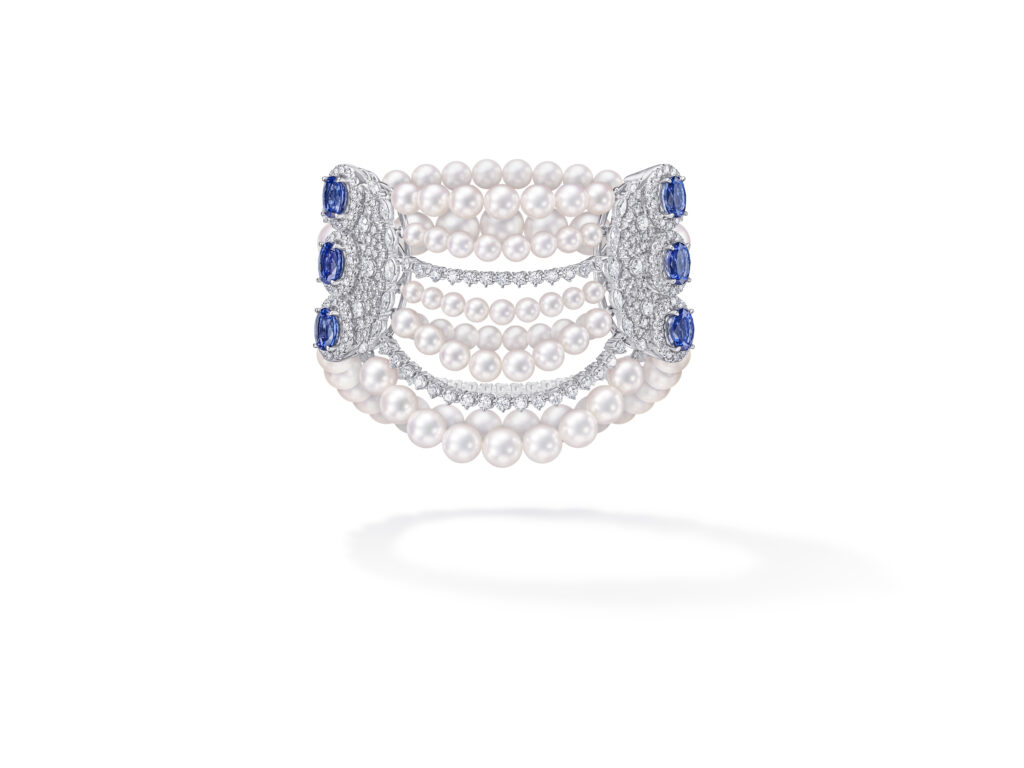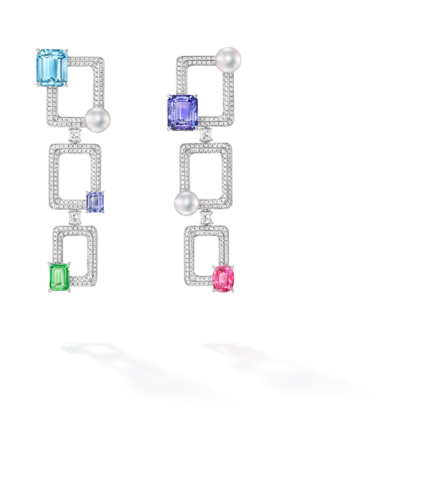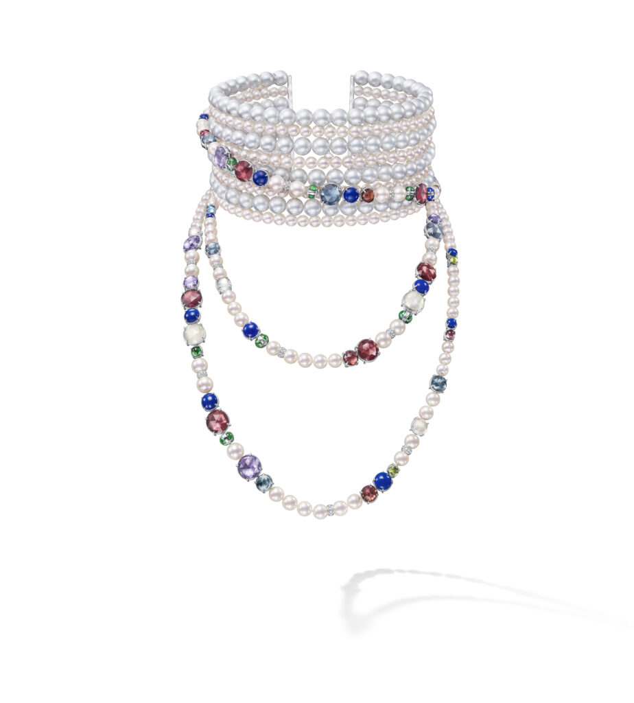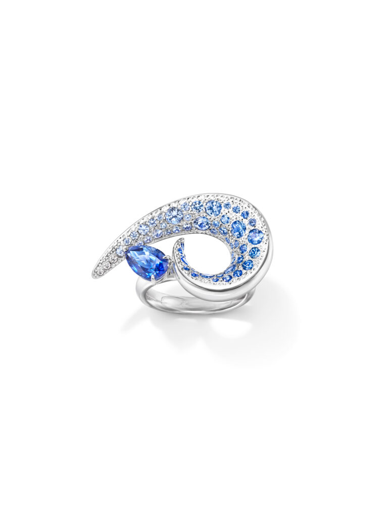 Le set « Cove » s’inspire des criques sculptées par les vagues, avec des pièces en or blanc, diamants et perles Akoya, représentant les embruns marins et la rondeur délicate des vagues. Les saphirs roses, grenats grossulaire et autres pierres de couleur ajoutent une touche de vivacité et de modernité à ces créations.