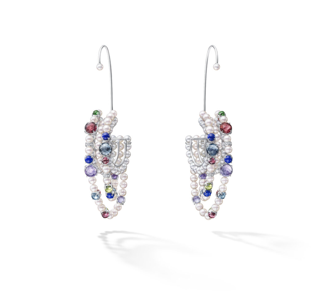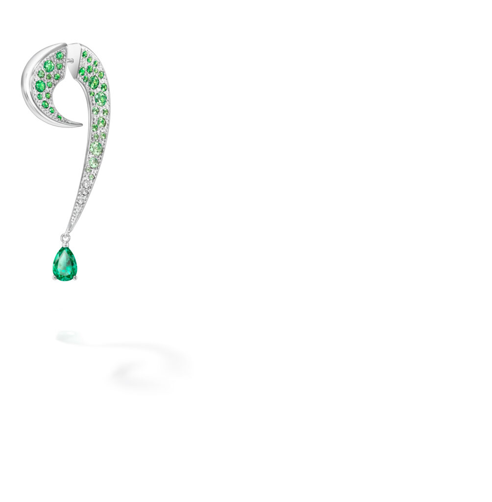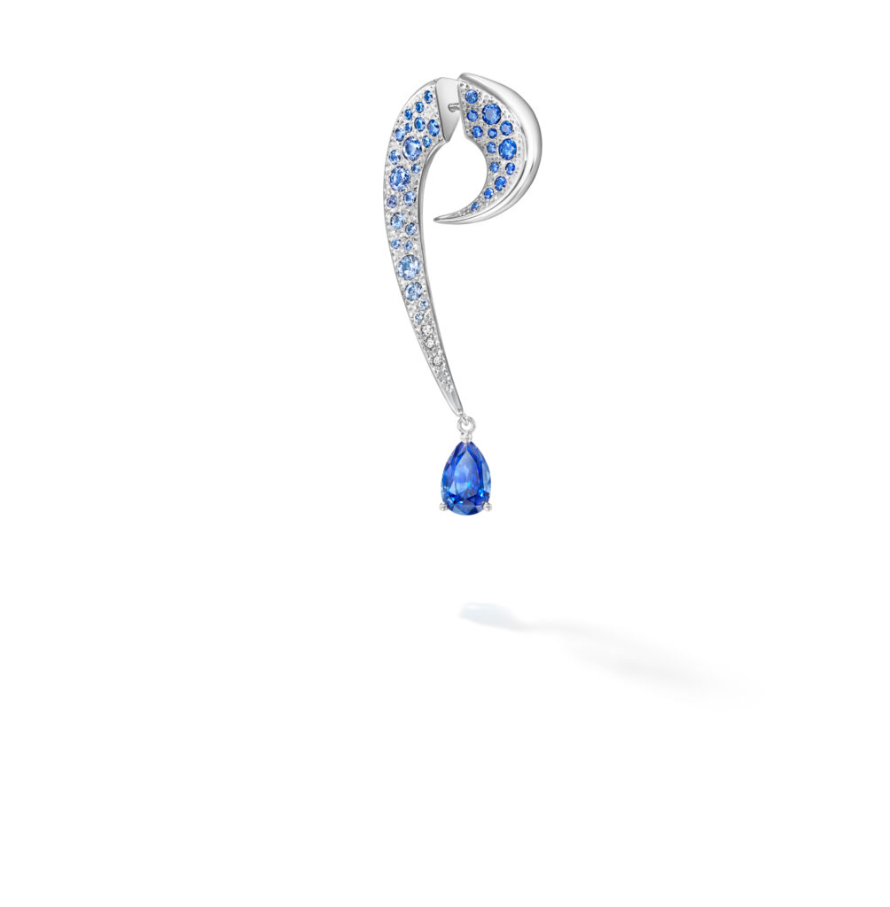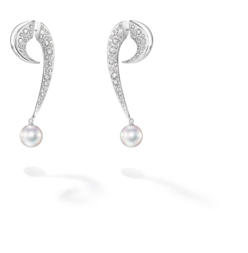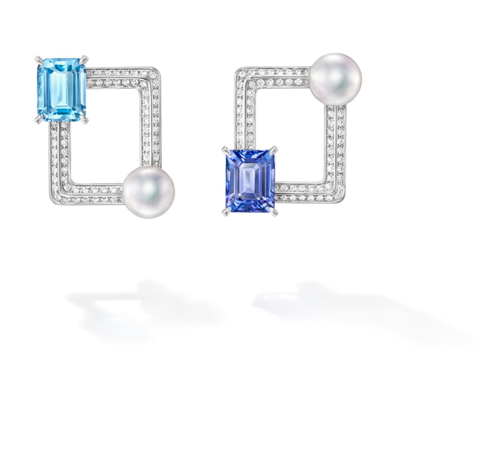 Le set « Cove » s’inspire des criques sculptées par les vagues, avec des pièces en or blanc, diamants et perles Akoya, représentant les embruns marins et la rondeur délicate des vagues. Les saphirs roses, grenats grossulaire et autres pierres de couleur ajoutent une touche de vivacité et de modernité à ces créations.