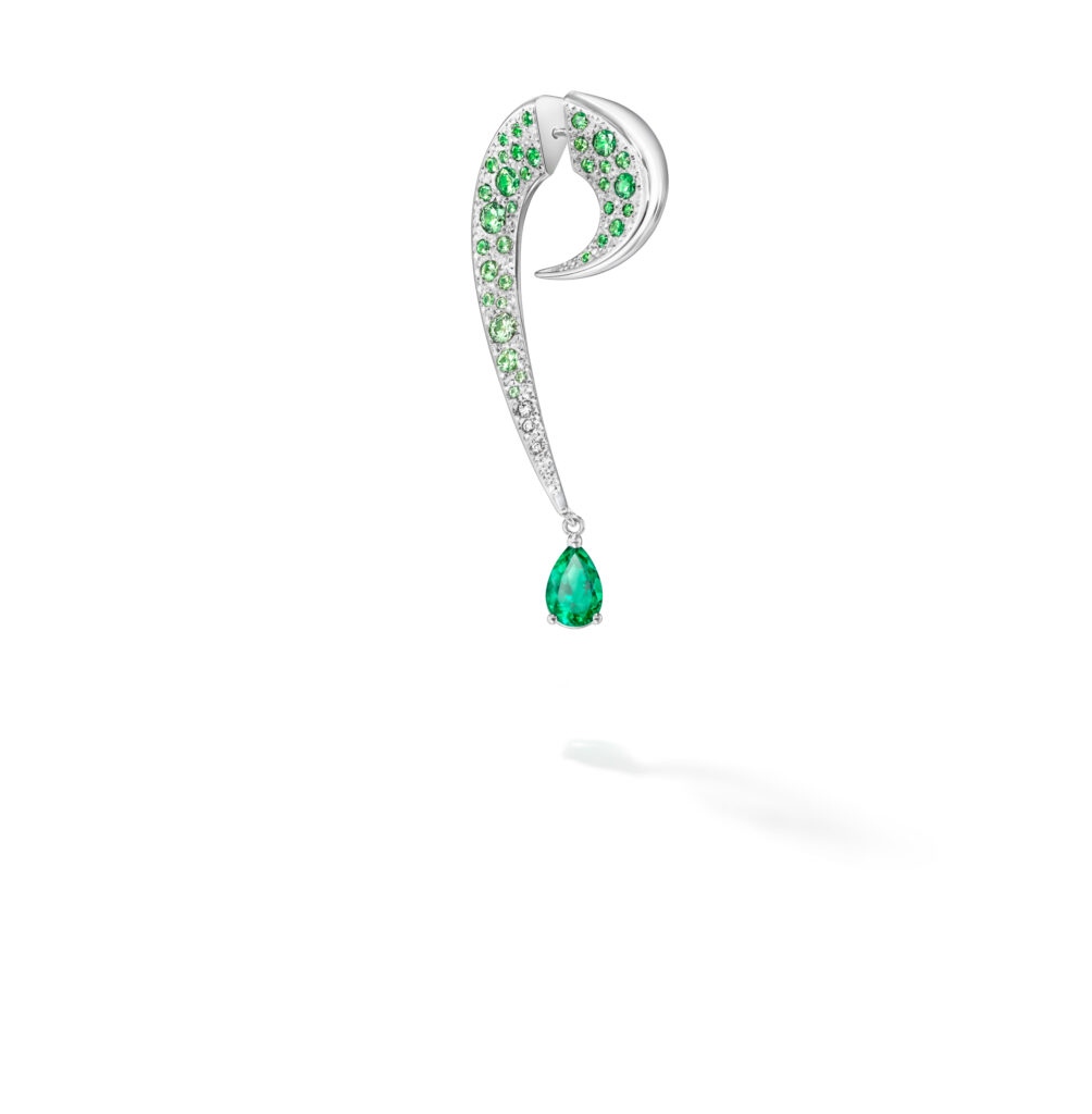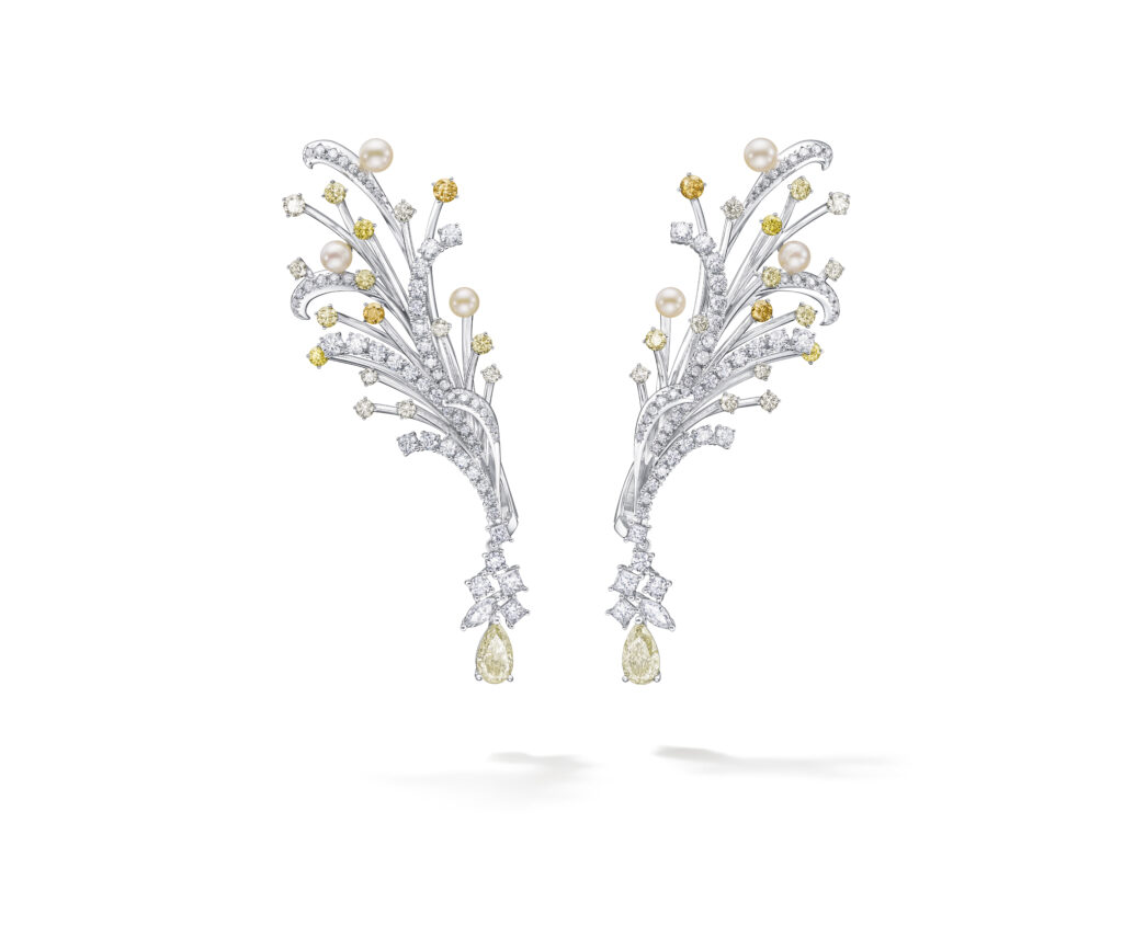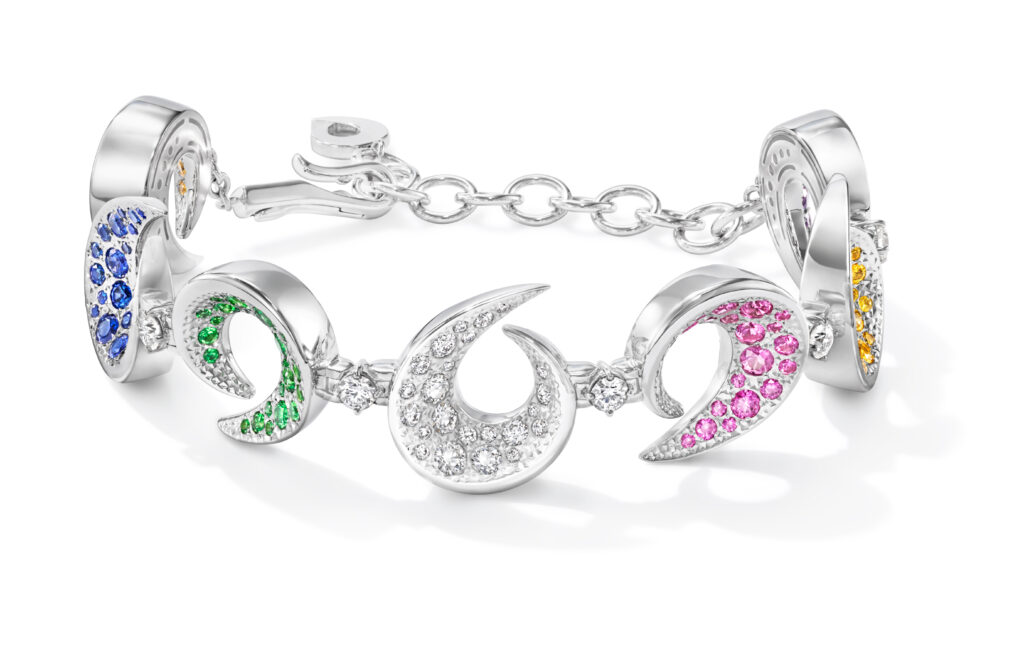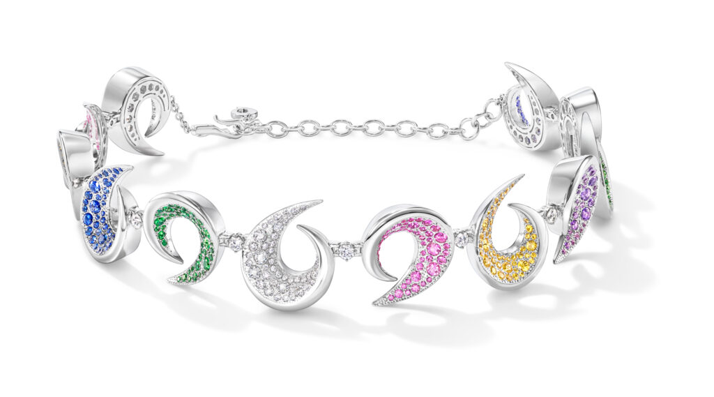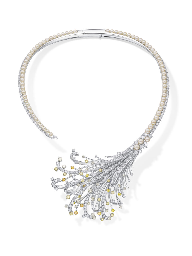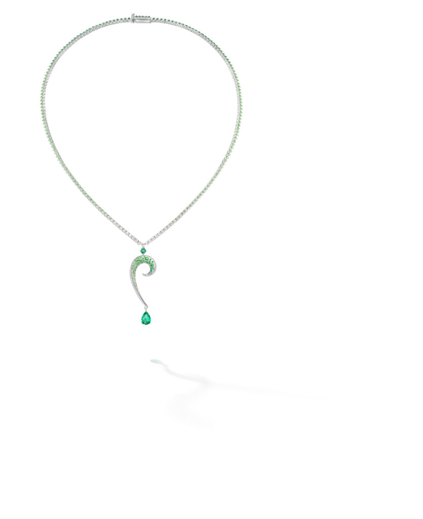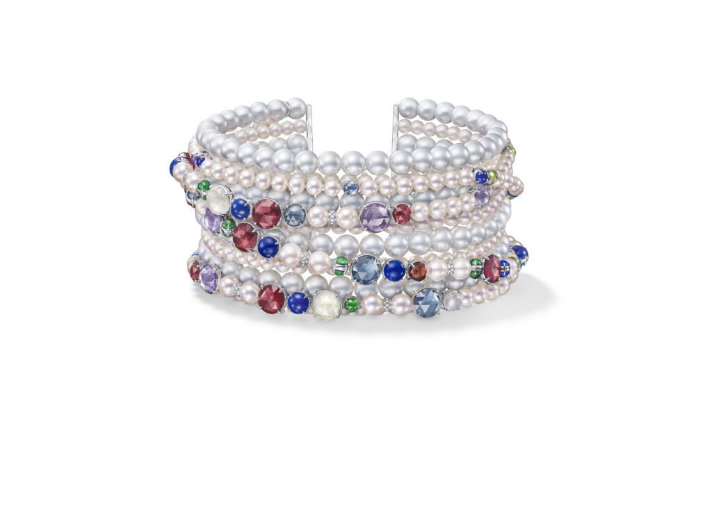 Le set « Cove » s’inspire des criques sculptées par les vagues, avec des pièces en or blanc, diamants et perles Akoya, représentant les embruns marins et la rondeur délicate des vagues. Les saphirs roses, grenats grossulaire et autres pierres de couleur ajoutent une touche de vivacité et de modernité à ces créations.