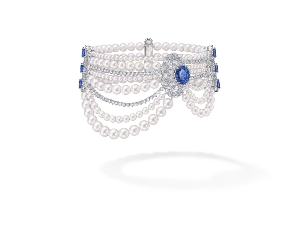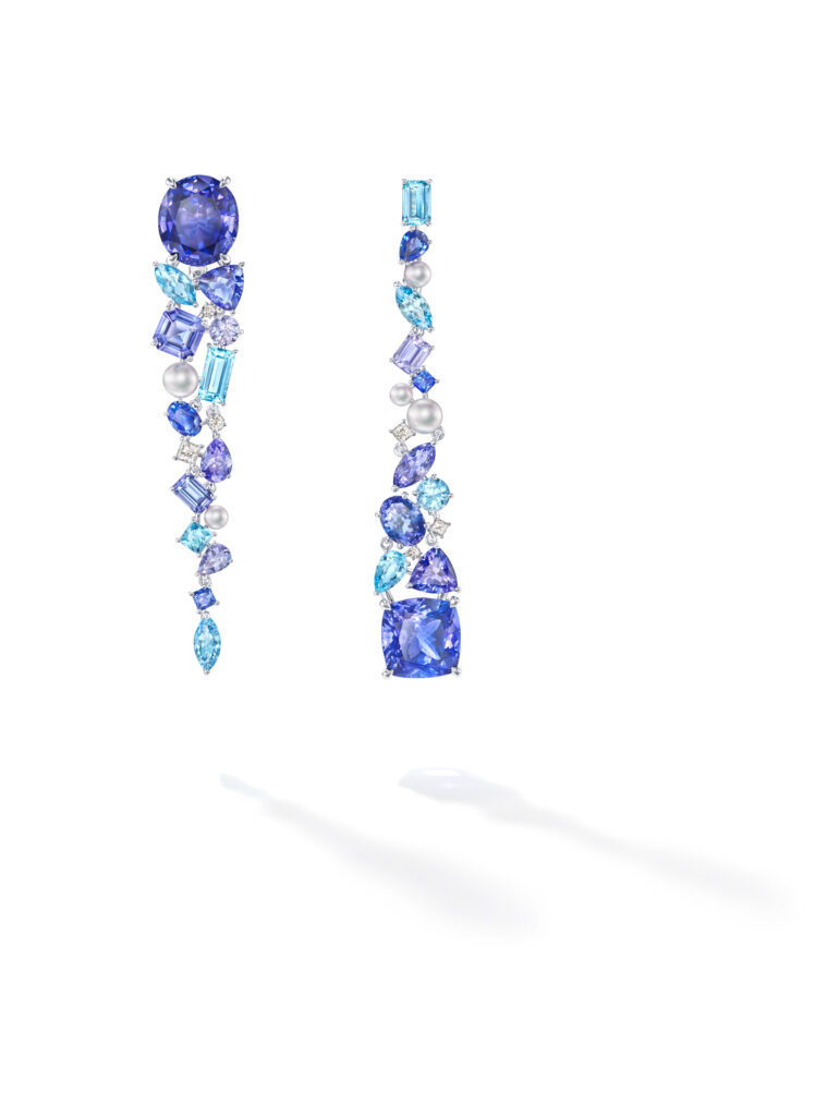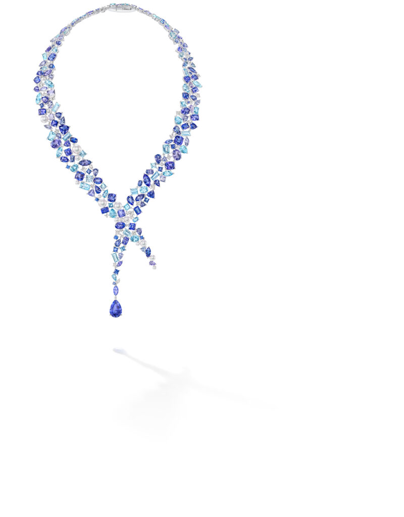 Le set « Serenity » capture la beauté de la mer avec des aigues-marines, des saphirs et des spinelles, évoquant les nuances bleues de l’océan. Le collier écharpe de cette collection, paré d’une tanzanite de 7,86 carats, incarne la sophistication et la créativité de TASAKI.