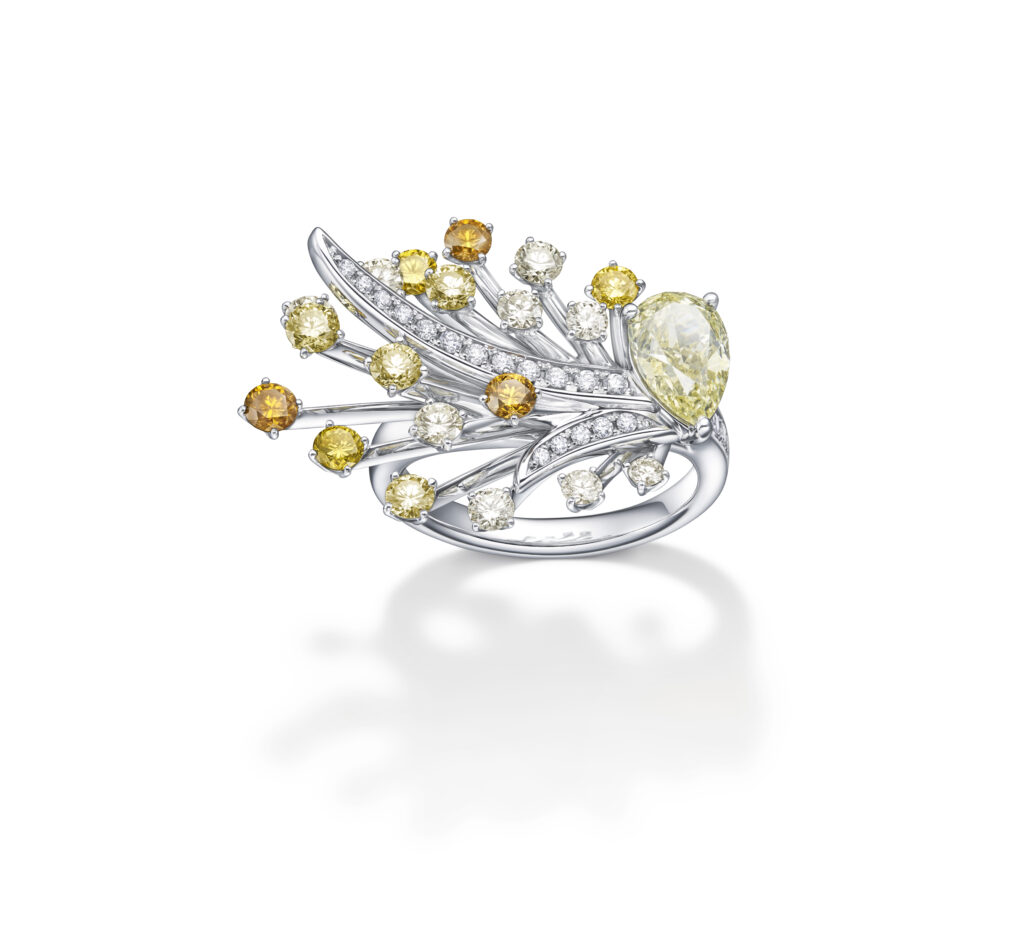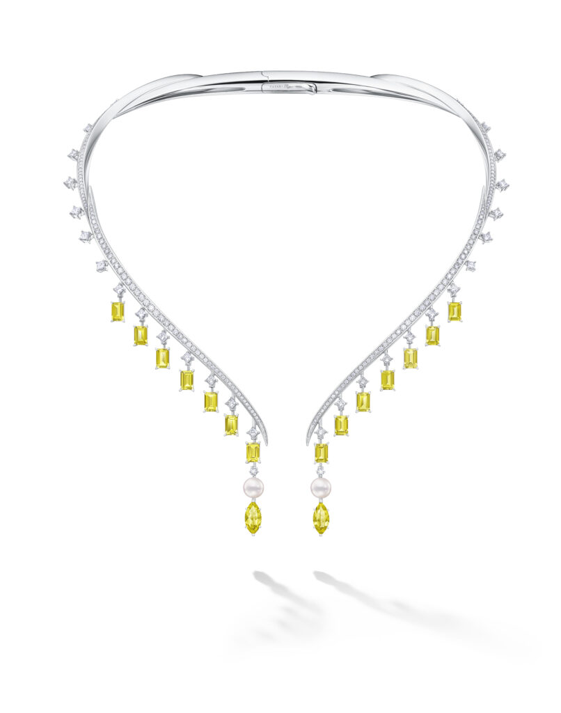 Parmi les créations phares, on trouve le set Lumineux, inspiré des somptueux bals de César Ritz, avec des pièces qui rappellent les flammes des bougies, les feux d’artifice et les bulles de champagne. La parure Scintillement, quant à elle, s’inspire de l’escalier incurvé emblématique du Ritz, avec des tourmalines canary et des diamants qui évoquent les marches et la splendeur architecturale de l’hôtel.