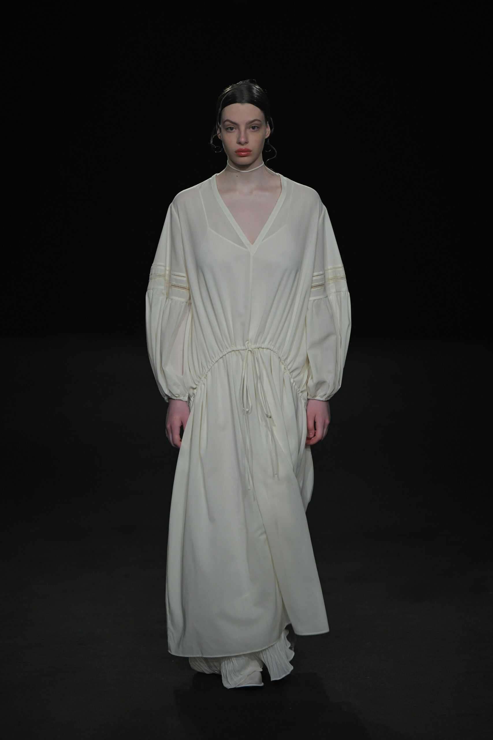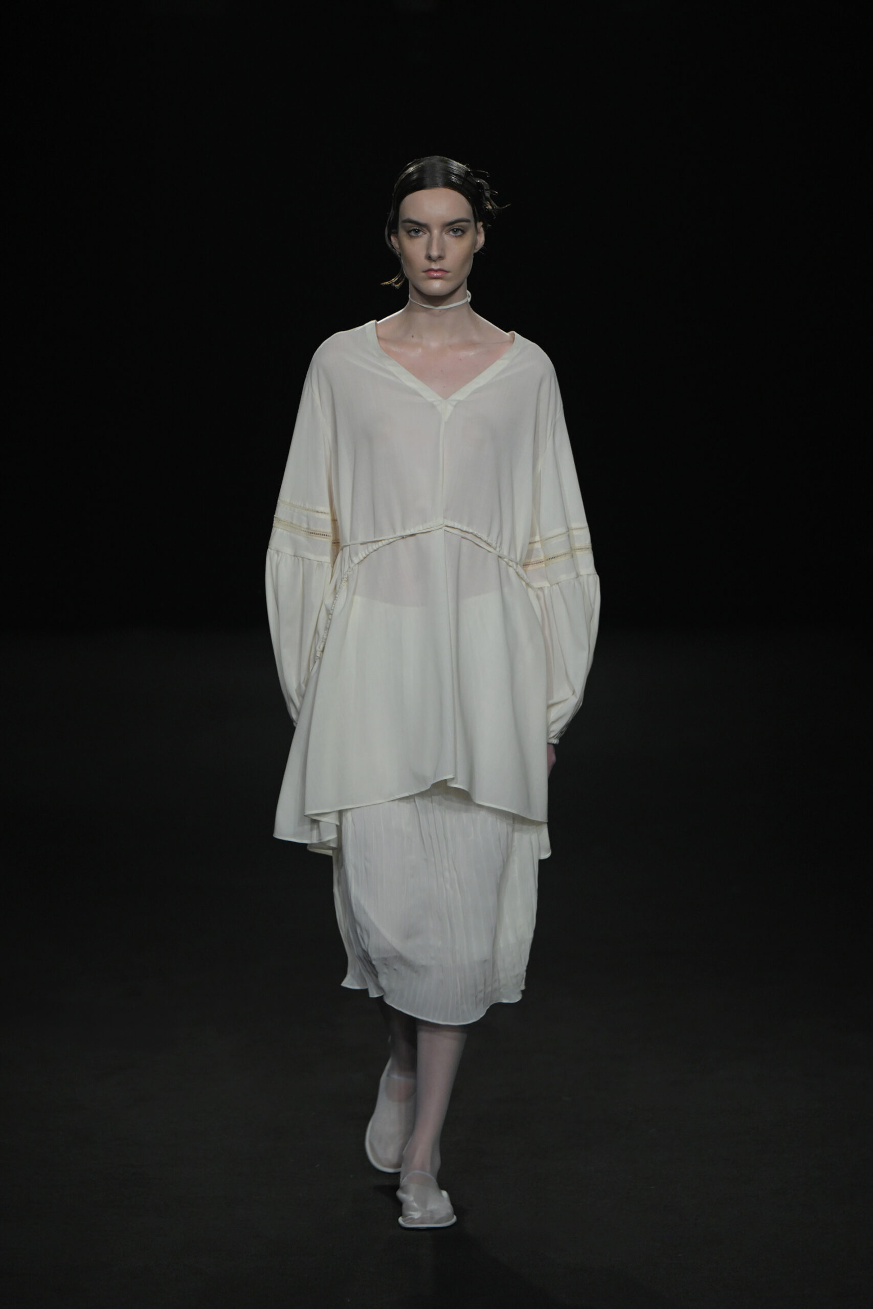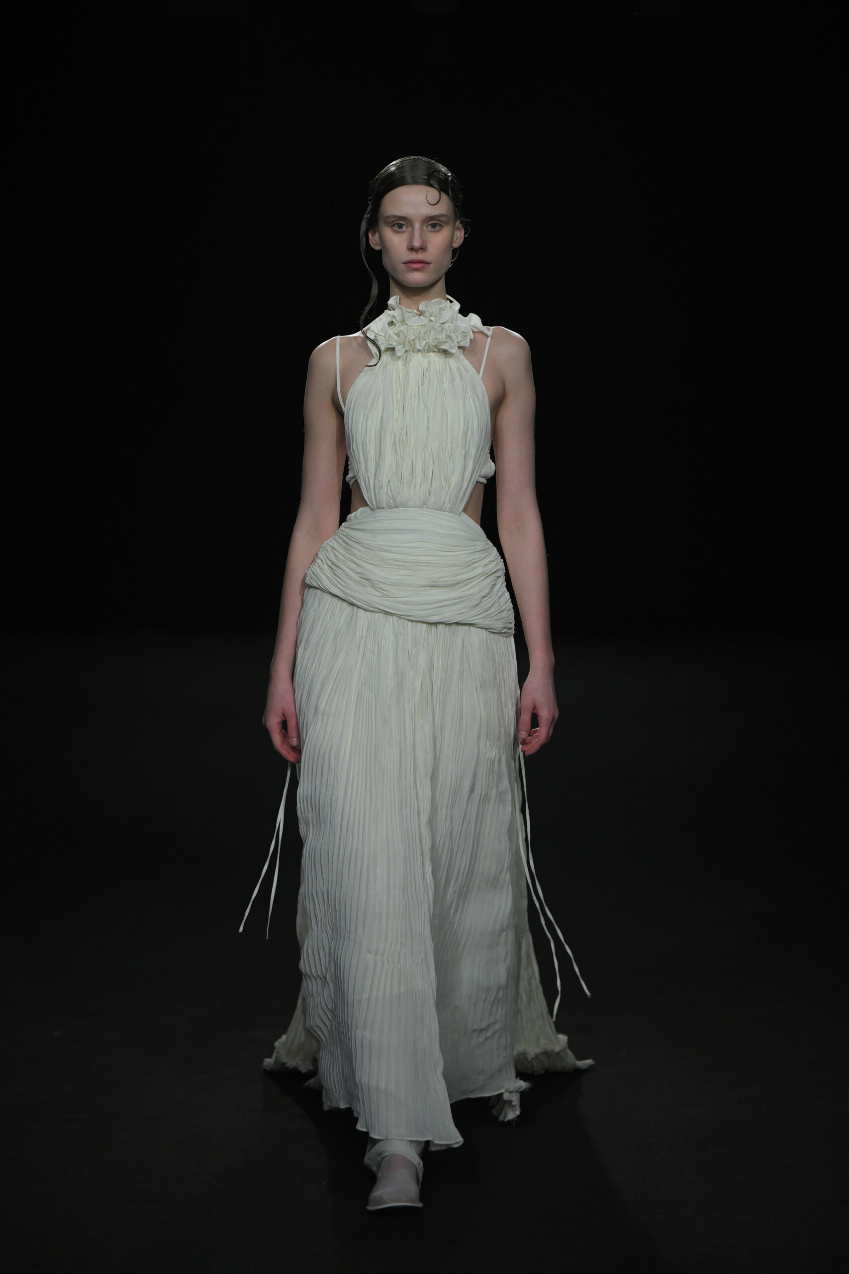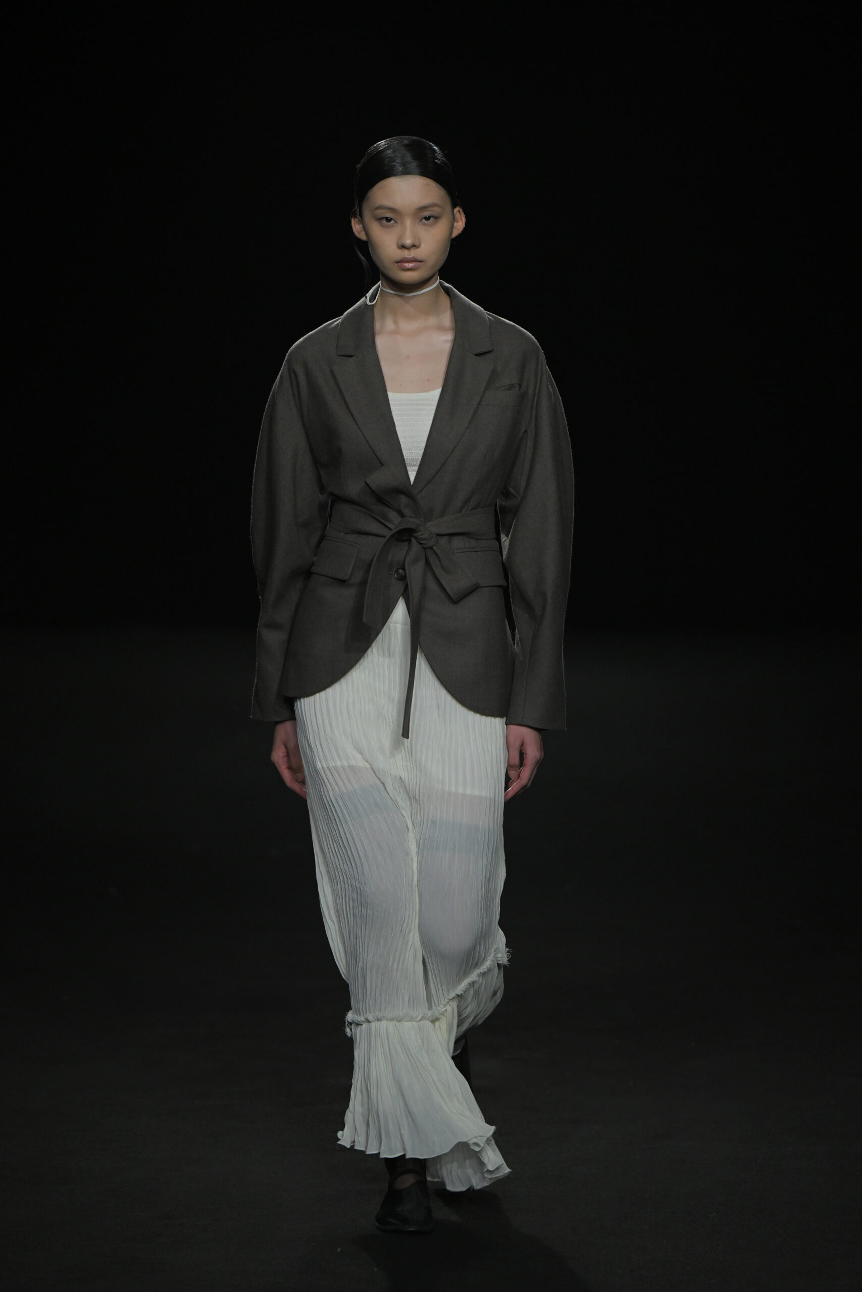 Contrairement à la collection précédente, qui évoquait une promenade ensoleillée le long de la côte Amalfitaine, cette nouvelle ligne invite à une exploration poétique des émotions humaines, marquée par un contraste saisissant de couleurs allant du blanc spectral aux gris sereins et aux roux profonds. L’utilisation emblématique des techniques de plissage signature d’ASSIGNMENTS, alliée à la transparence des tissus, confère à chaque pièce une légèreté éthérée, rappelant la silhouette fantomatique de Giselle.