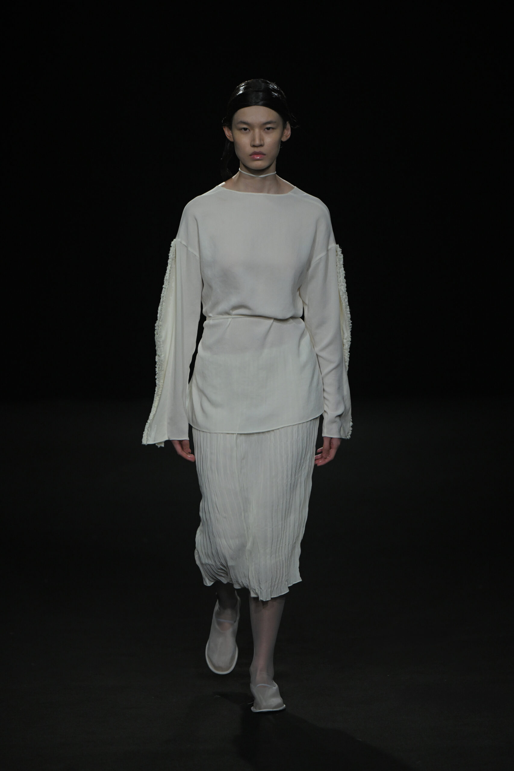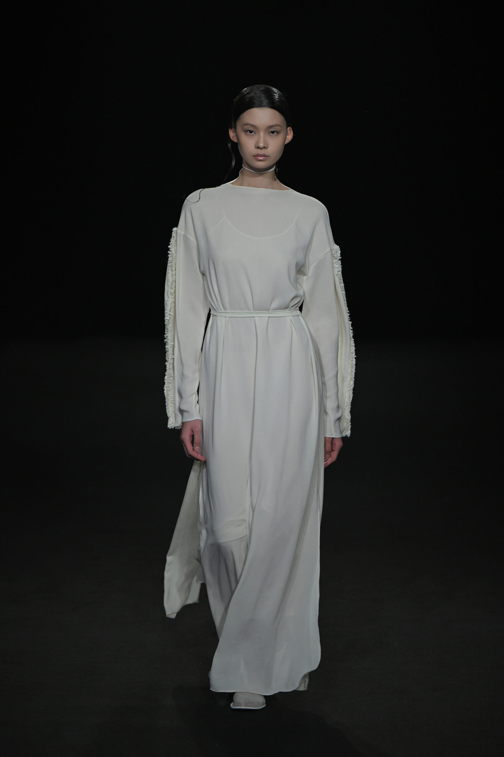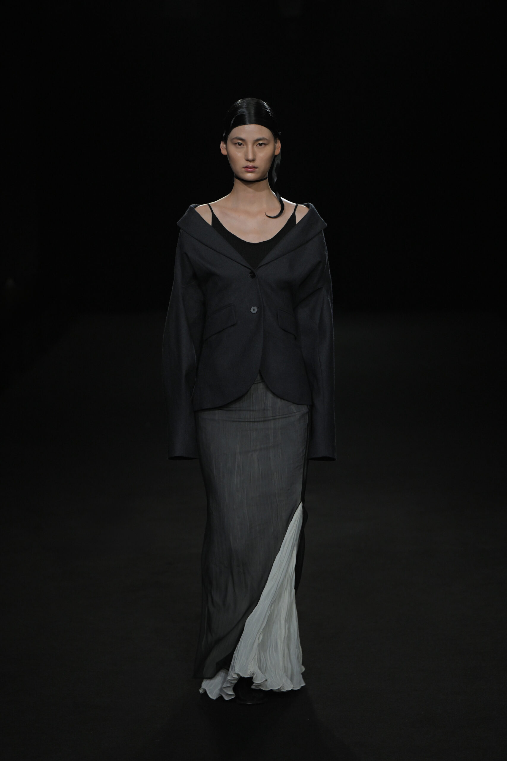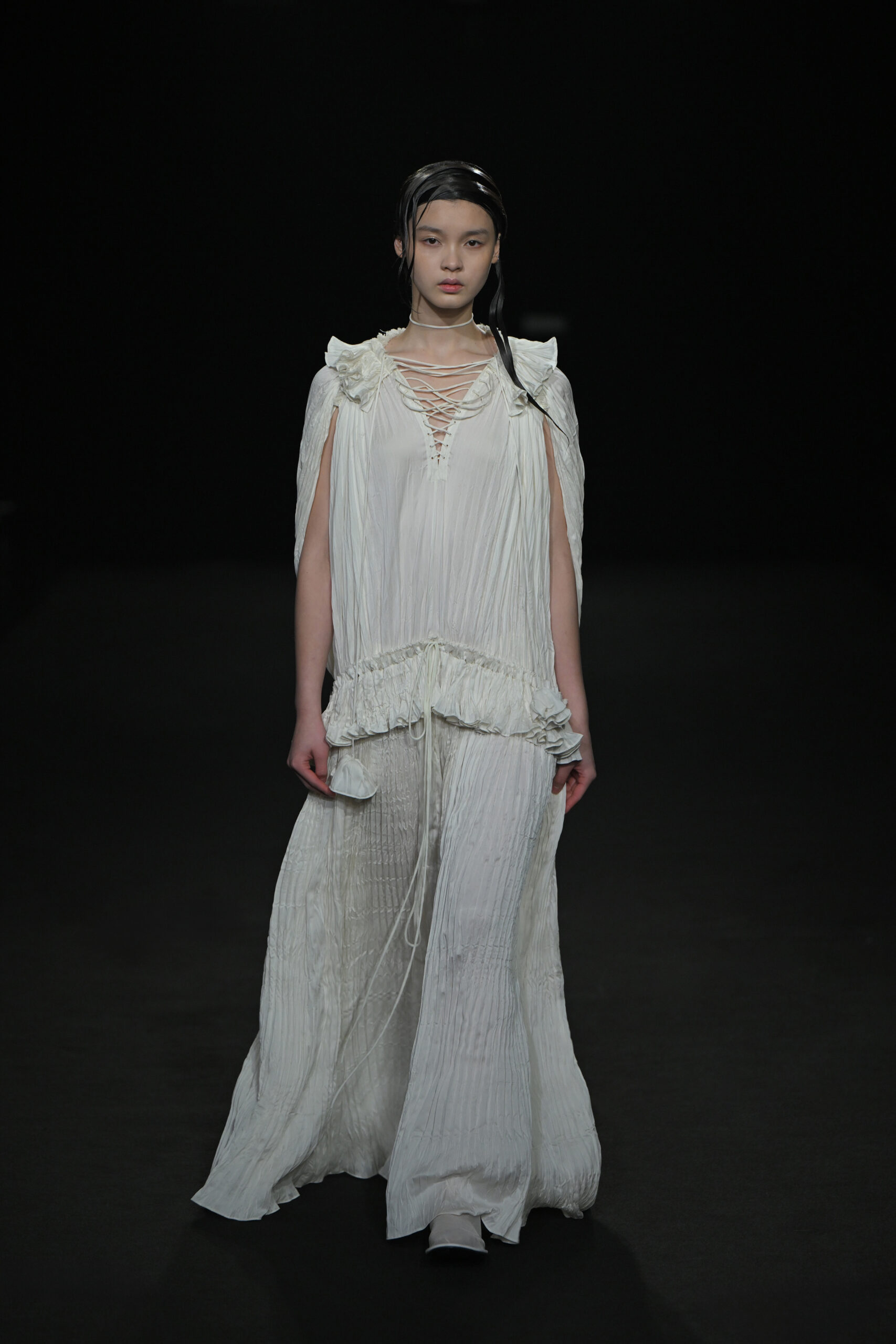 Contrairement à la collection précédente, qui évoquait une promenade ensoleillée le long de la côte Amalfitaine, cette nouvelle ligne invite à une exploration poétique des émotions humaines, marquée par un contraste saisissant de couleurs allant du blanc spectral aux gris sereins et aux roux profonds. L’utilisation emblématique des techniques de plissage signature d’ASSIGNMENTS, alliée à la transparence des tissus, confère à chaque pièce une légèreté éthérée, rappelant la silhouette fantomatique de Giselle.