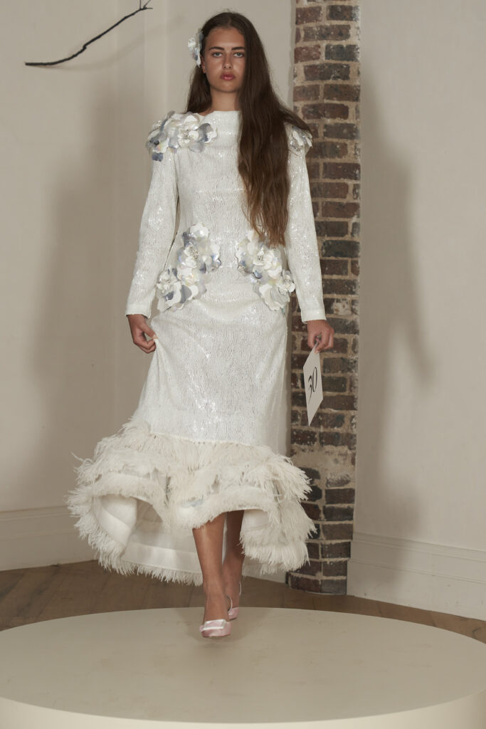 Les fleurs, symbole intemporel de la féminité, s’invitent dans la collection sous forme de tissus jacquard, de broderies et de volants. Elles reproduisent leurs corolles avec poésie, personnifiant les différentes étapes de la vie d’une femme. Ces motifs floraux délicats témoignent de la continuité et de l’évolution des histoires personnelles à travers le temps, inscrivant la mode de Julie de Libran dans une perspective durable et empreinte de sens.