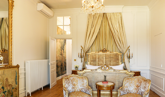 Au premier et au second étage, les suites vont-elles aussi vous faire tourner la tête. On imagine aisément que les propriétaires ont aimé choisir pour celle-ci un papier- peint de la maison Pierre Frey ou Zuber, pour celle-là une soierie Manuel Canovas ou un tissu spécialement dessiné par Jean-Paul Gautier. Elles racontent toute une histoire dans des tons de damassé bleu, grâce à une délicate toile de Jouy pastel, des parquets en point de Hongrie, des hauteurs de plafond de 4,50 mètres, des sols en marbre dans les salles de bains, des baldaquins dorés ou des murs lambrissés en bleu de France. Les vues sur les jardins sont spectaculaires et les hautes fenêtres laissent pénétrer les lumières éclatantes de l’été. Pas de télévision, pas de minibar, l’eau est servie dans une carafe en cristal, … Un panier de gourmandises est déposé avant votre arrivée, composé des délices de la boulangerie du village, d’un pot de confiture maison à la rhubarbe et d’une bouteille de vin de Loir.