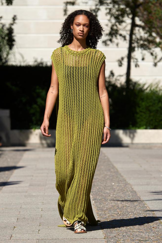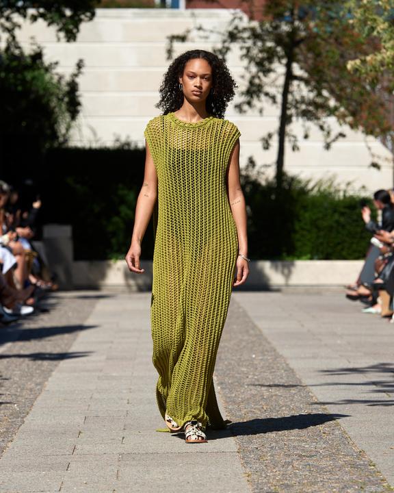 L’essence esthétique de la collection réside dans l’interaction des textures. Présentant des superpositions tonales, des nœuds et des cordes inspirés des œuvres de Hesse, invitant à une connexion tactile et à un sens de la découverte avec chaque pièce. Inspirés par ses œuvres en boîte et sa préoccupation pour les grilles, nous incorporons des éléments structurés, améliorant la forme sculpturale de la collection. Les tissus clés tels que le viscose compact et la soie de coton évoquent la transparence et la fluidité des aquarelles de Hesse, tandis que l’utilisation de textiles innovants tels que l’acétate Naia, produit à partir de pin et de bois d’eucalyptus, souligne notre engagement à promouvoir des pratiques durables.