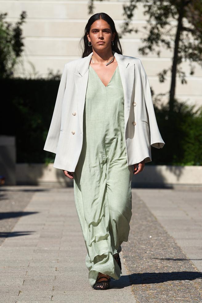 Renommée pour son utilisation de matériaux simples et industriels et son exploration des associations organiques, l’art de Hesse transforme les objets quotidiens en pièces expressives. En embrassant cette expérimentation avec le quotidien, nous avons intégré l’essence des uniformes de travail, fusionnant le brut avec le raffiné, et l’occasionnel avec l’ordinaire. Avoir la nature tactile des matériaux de Hesse reflète nos choix de tissus, allant du popeline légère en coton bleu et du lin au tencel transparent et à la laine d’agneau douce, créant une transition fluide du travail à la tenue de soirée. La palette de couleurs saisonnières peint un paysage clair, tonal et calme avec des nuances de blé, de vanille, de vert et un imprimé dip-dye aquarelle pâle.