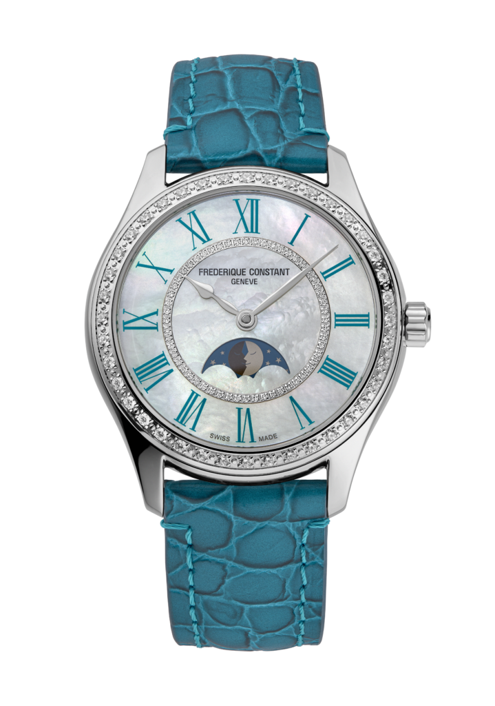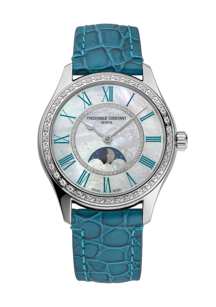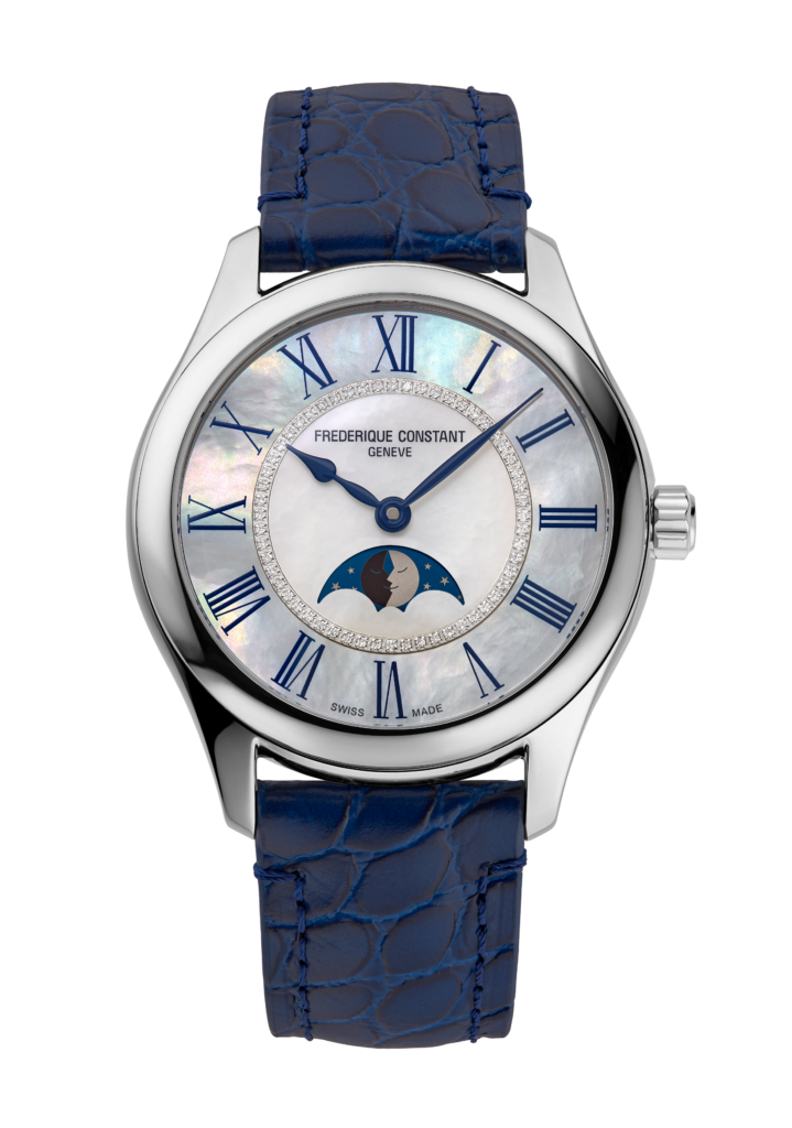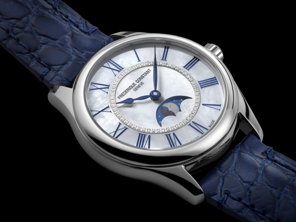 Le disque de lune, développé exclusivement pour Frederique Constant, oscille entre des nuances de gris clairs et foncés, symbolisant la rencontre de deux moitiés qui s’unissent dans une tendre étreinte. Cette phase de lune occupe une place centrale à 6 heures, ajoutant une dimension rêveuse et charmante à la montre.