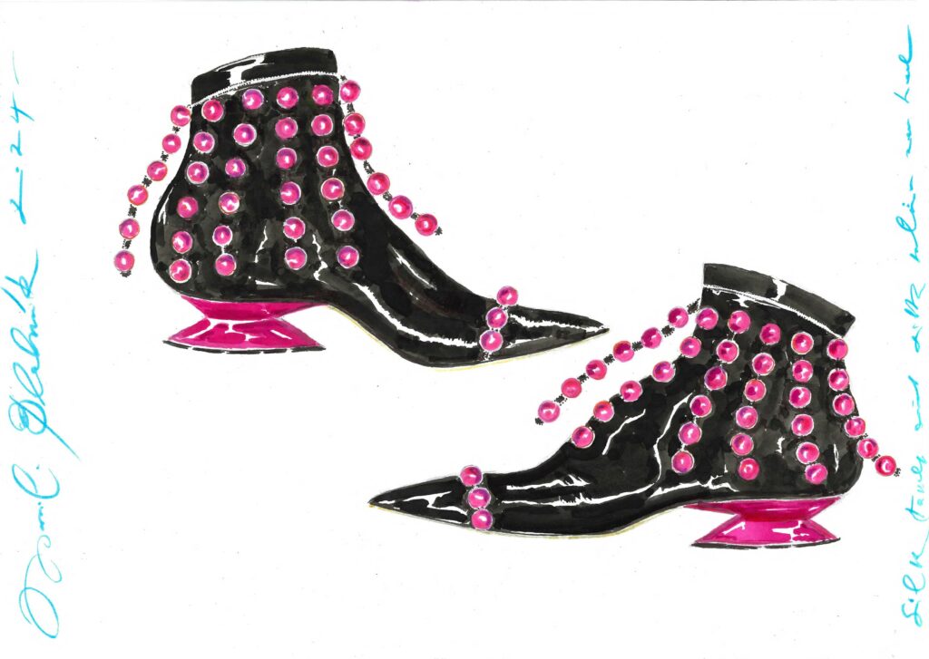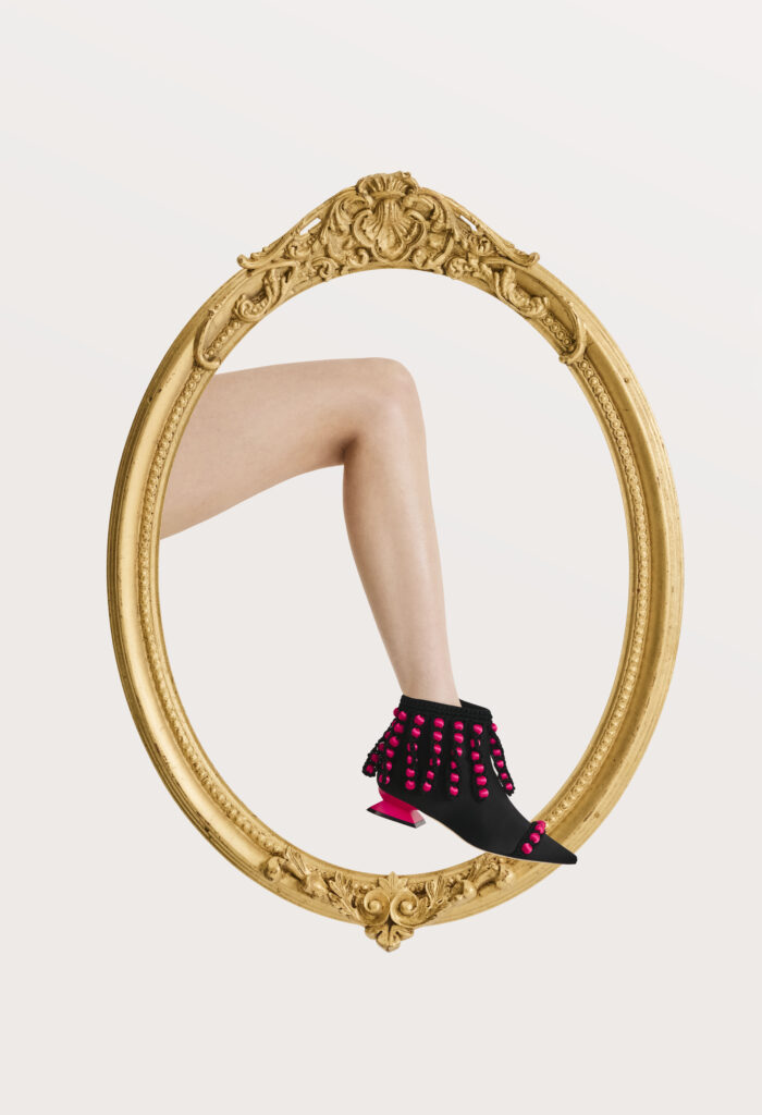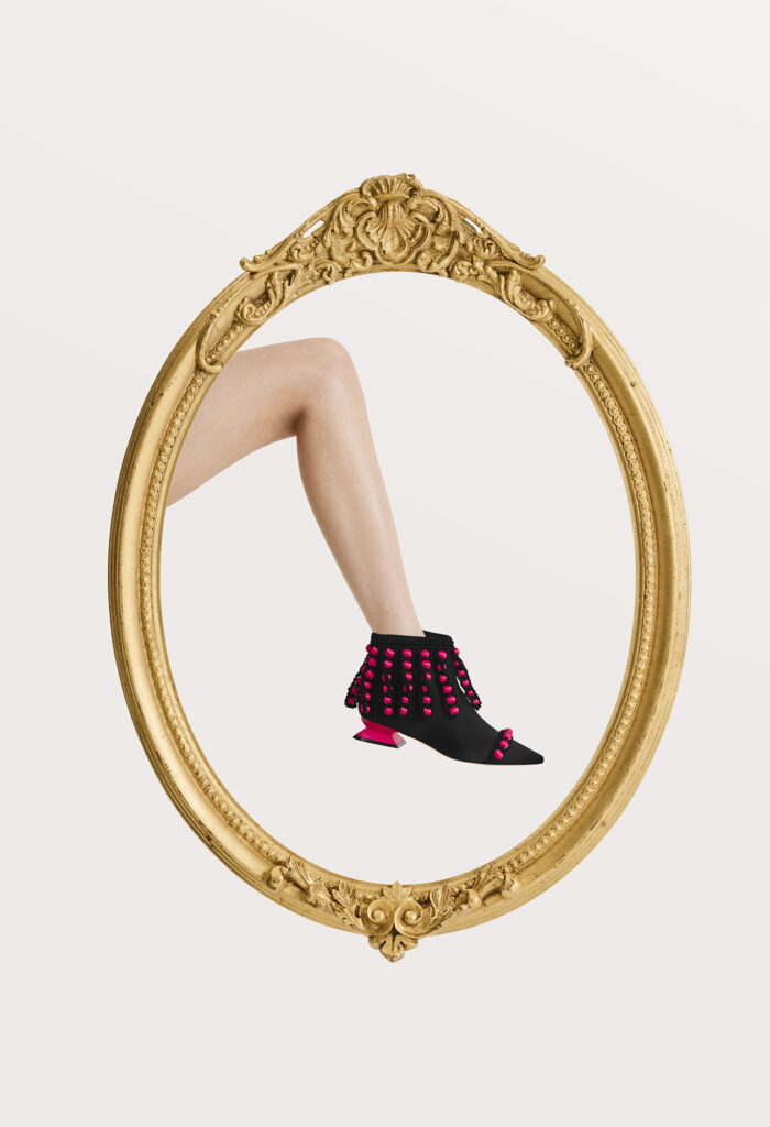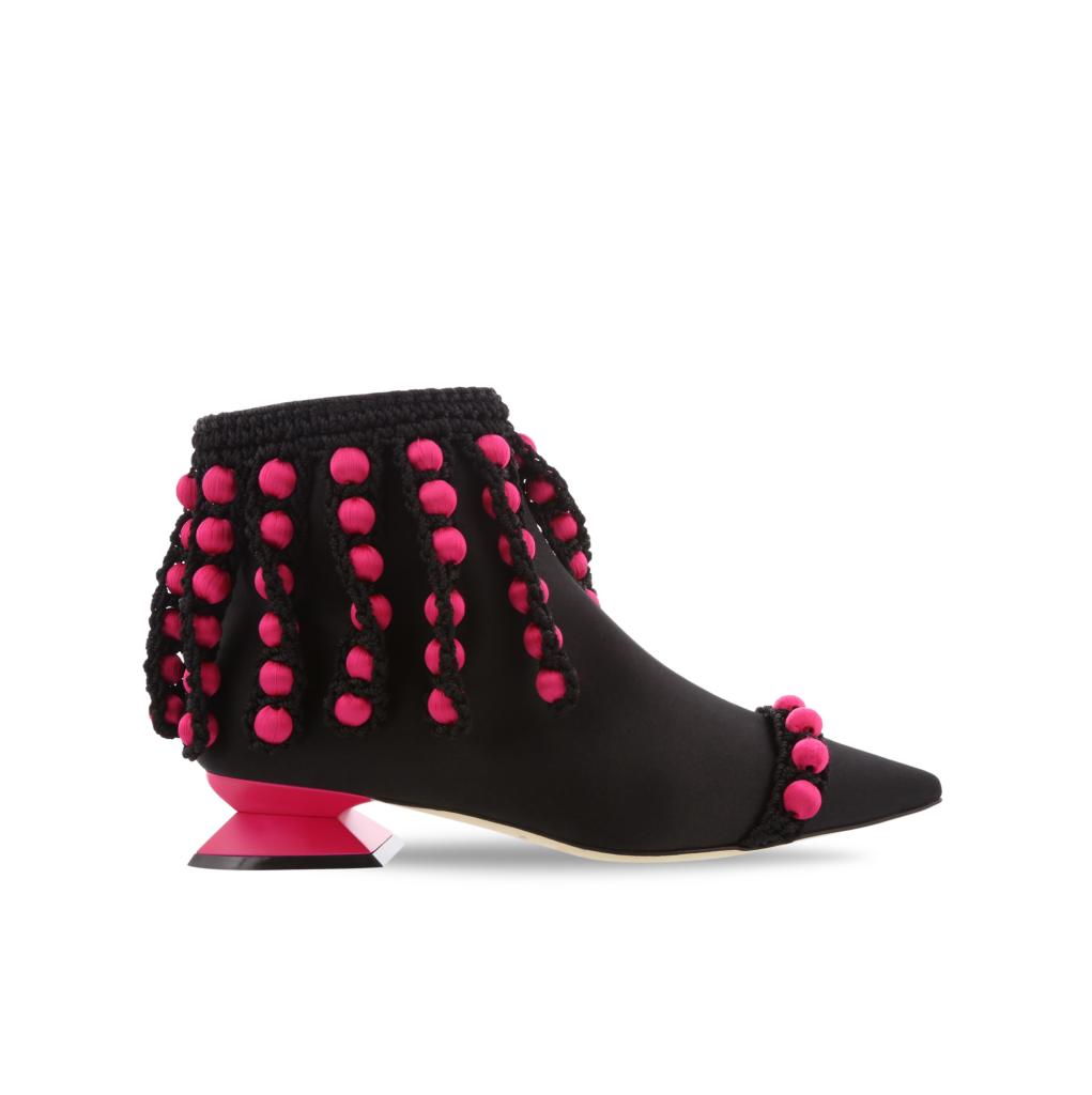 Pour inaugurer cette édition collector, Manolo Blahnik présente « SENE », une bottine en satin noir disponible à partir du 13 mai 2024. Ce modèle incarne parfaitement l’essence du raffinement et de la modernité. La bottine se distingue par un talon sculptural rose vif et des pompons délicats, ajoutant une touche audacieuse et contemporaine à une silhouette classique.