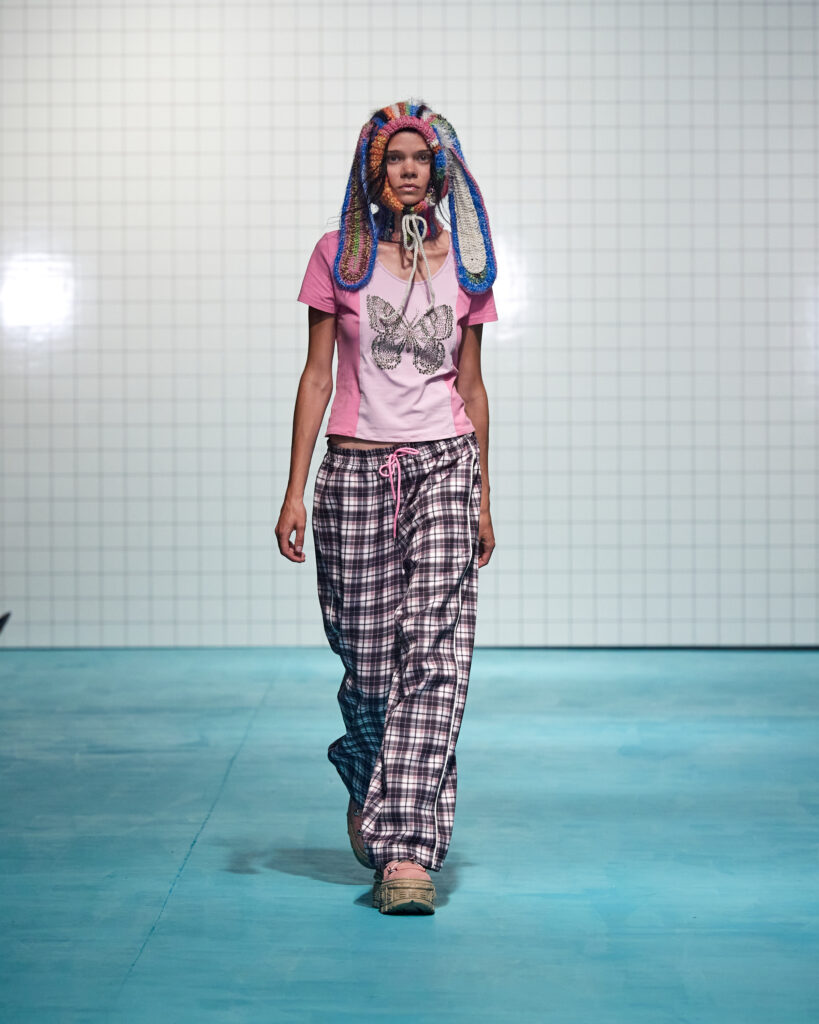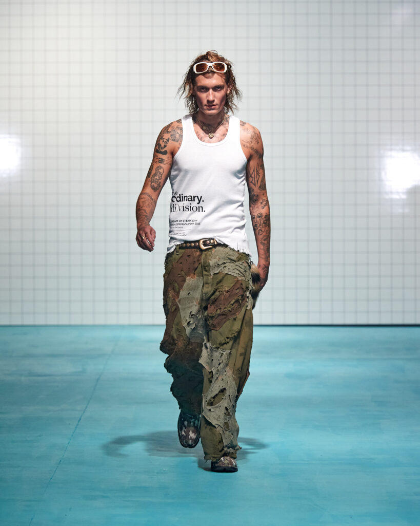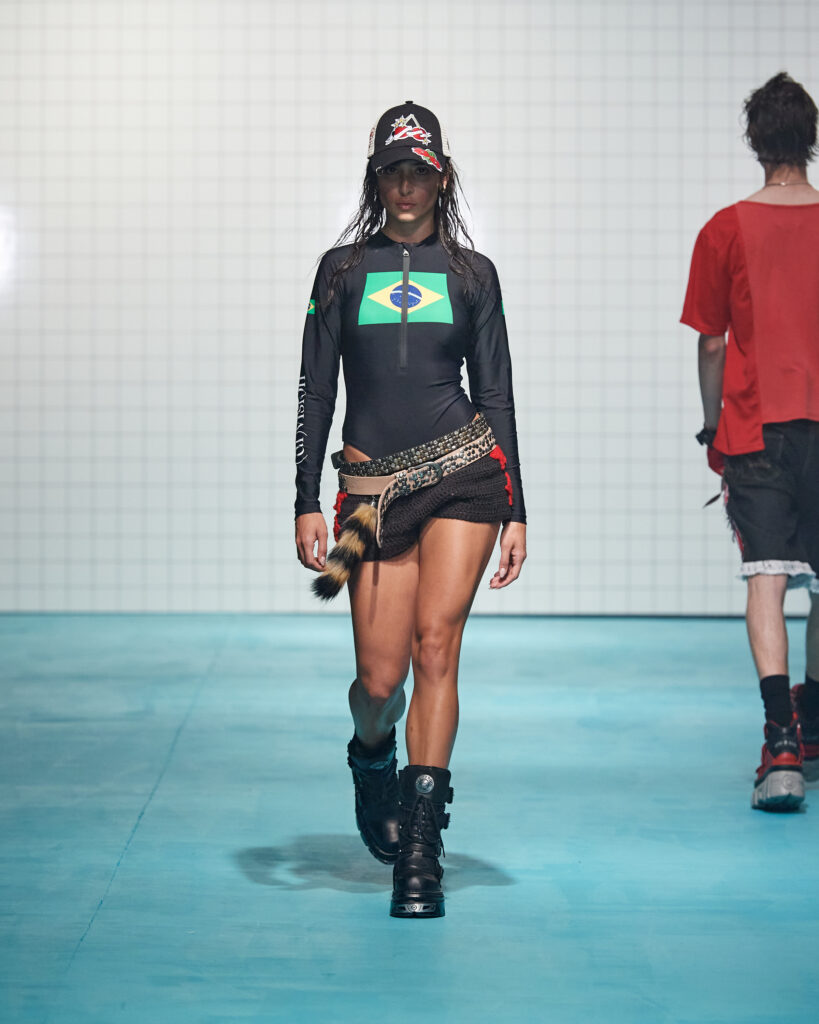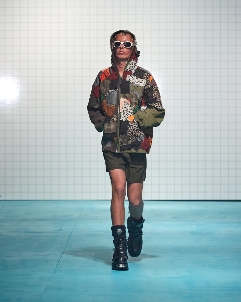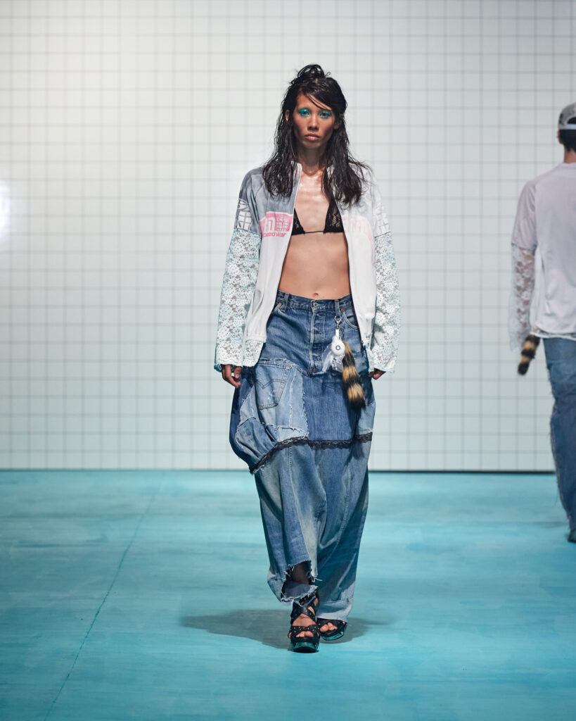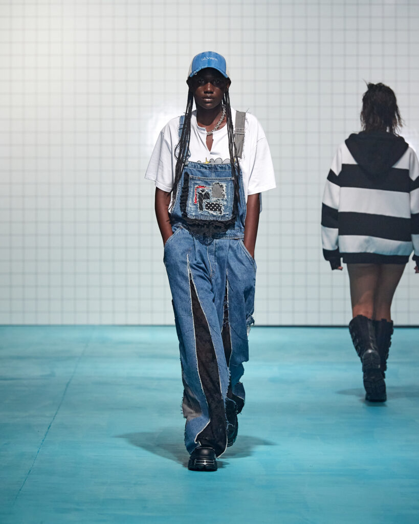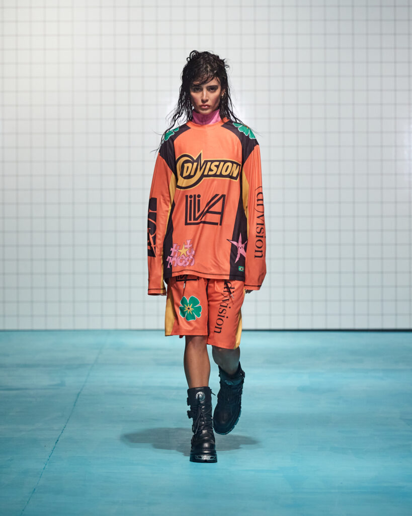La collection SS25 de (di)vision présente un mélange éclectique de vêtements masculins et féminins, mettant en avant des pièces uniques upcyclées et des designs collaboratifs. Inspirée par le maximalisme urbain et les jeux vidéo, elle combine le « fairy grunge » à la nostalgie de la mode tokyoïte. Les superpositions et le recyclage sont essentiels pour des ensembles visuellement saisissants. Le denim vintage, la dentelle, le jersey et le cuir sont réutilisés pour leur caractère et leur impact. Les imprimés animaliers, les motifs à carreaux et les accessoires inspirés des années 2000 ajoutent une touche d’éclat, tandis que le « happy grunge » réinterprète le grunge avec des couleurs vives et des imprimés ludiques. De plus, la collection comprend une capsule créée en collaboration avec la brésilienne branchée Livia, également vedette de la campagne AW23 de (di)vision.