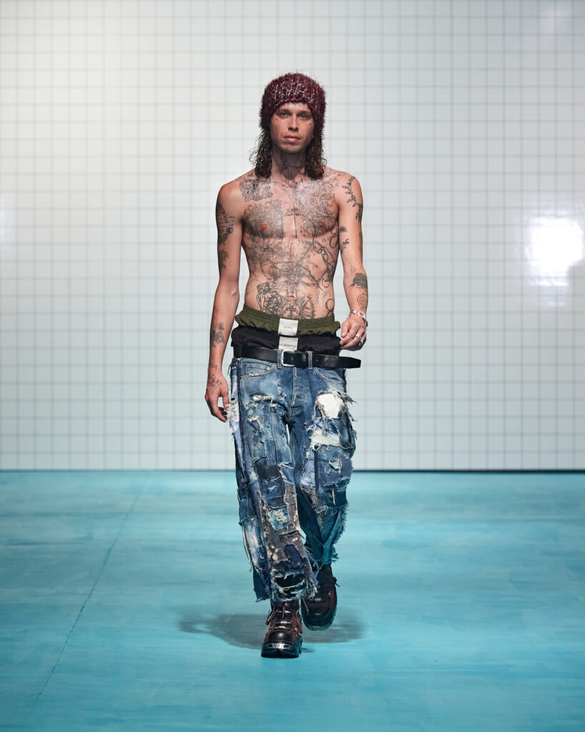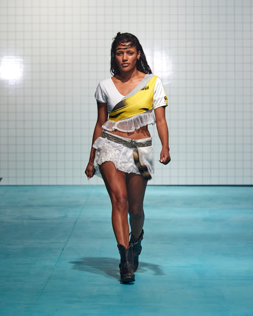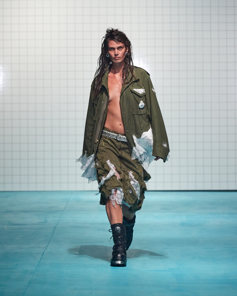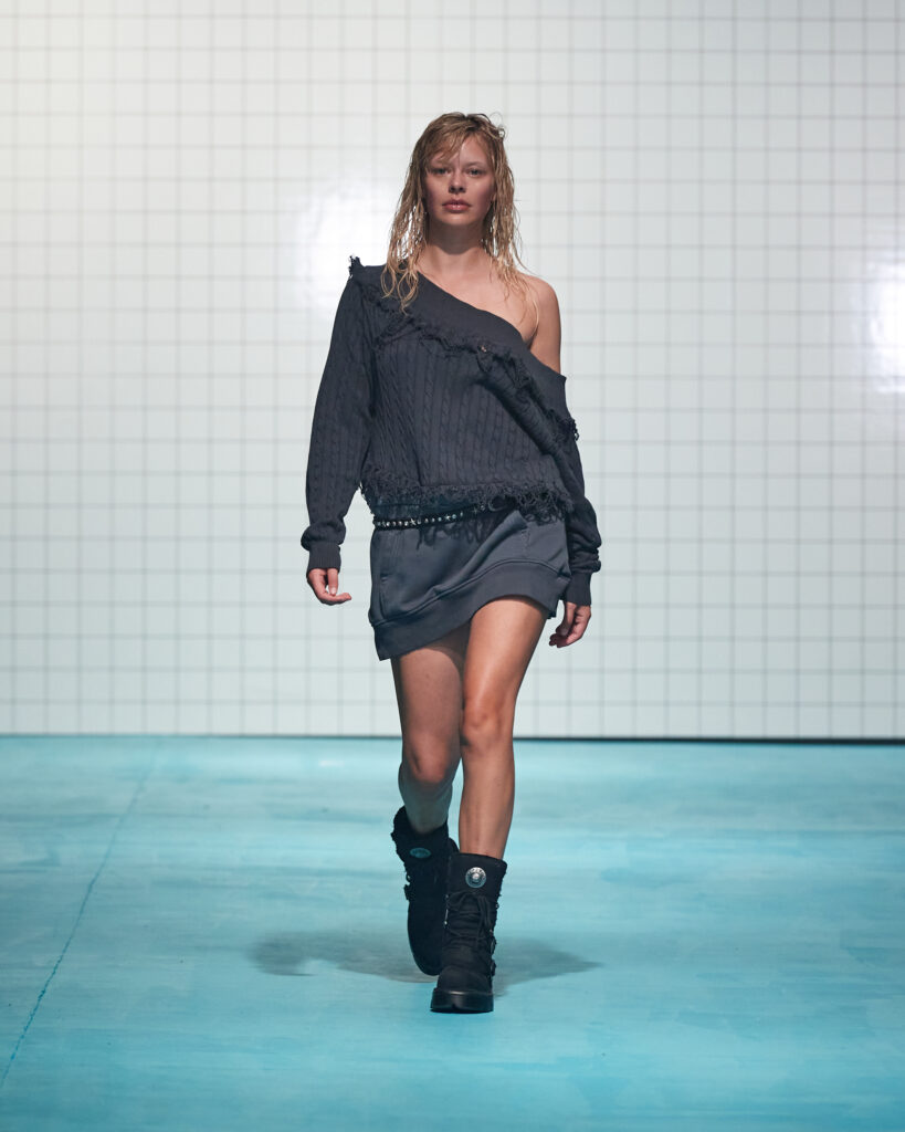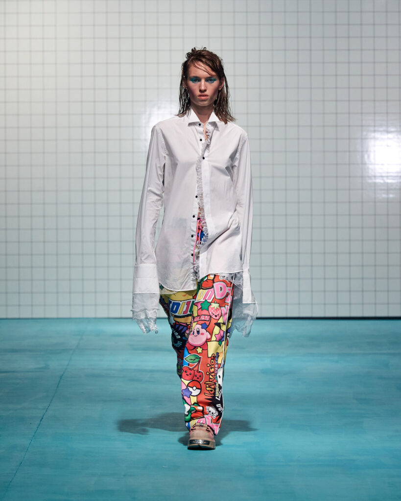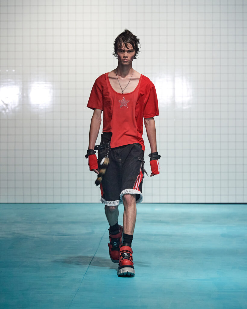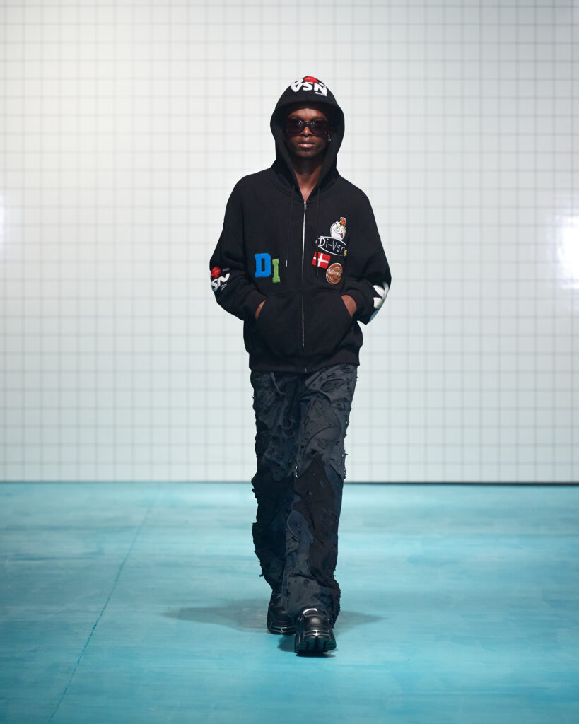 La collection SS25 de (di)vision présente un mélange éclectique de vêtements masculins et féminins, mettant en avant des pièces uniques upcyclées et des designs collaboratifs. Inspirée par le maximalisme urbain et les jeux vidéo, elle combine le « fairy grunge » à la nostalgie de la mode tokyoïte. Les superpositions et le recyclage sont essentiels pour des ensembles visuellement saisissants. Le denim vintage, la dentelle, le jersey et le cuir sont réutilisés pour leur caractère et leur impact. Les imprimés animaliers, les motifs à carreaux et les accessoires inspirés des années 2000 ajoutent une touche d’éclat, tandis que le « happy grunge » réinterprète le grunge avec des couleurs vives et des imprimés ludiques. De plus, la collection comprend une capsule créée en collaboration avec la brésilienne branchée Livia, également vedette de la campagne AW23 de (di)vision.