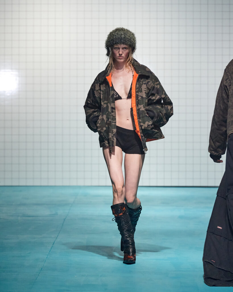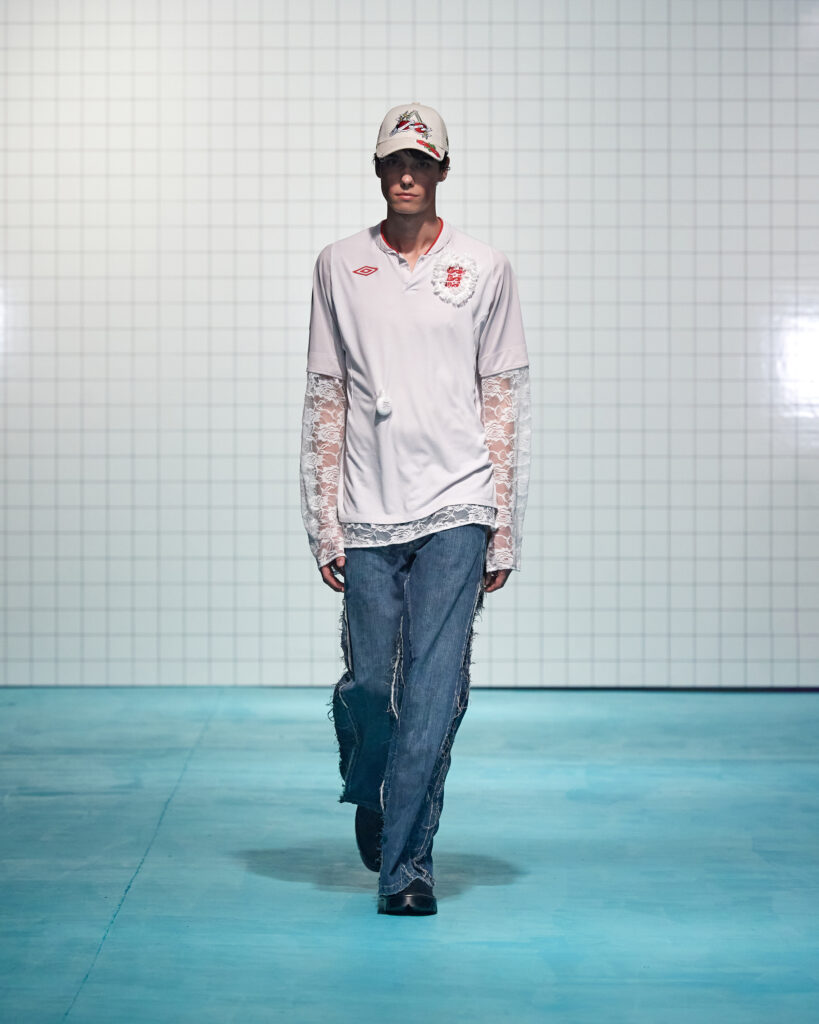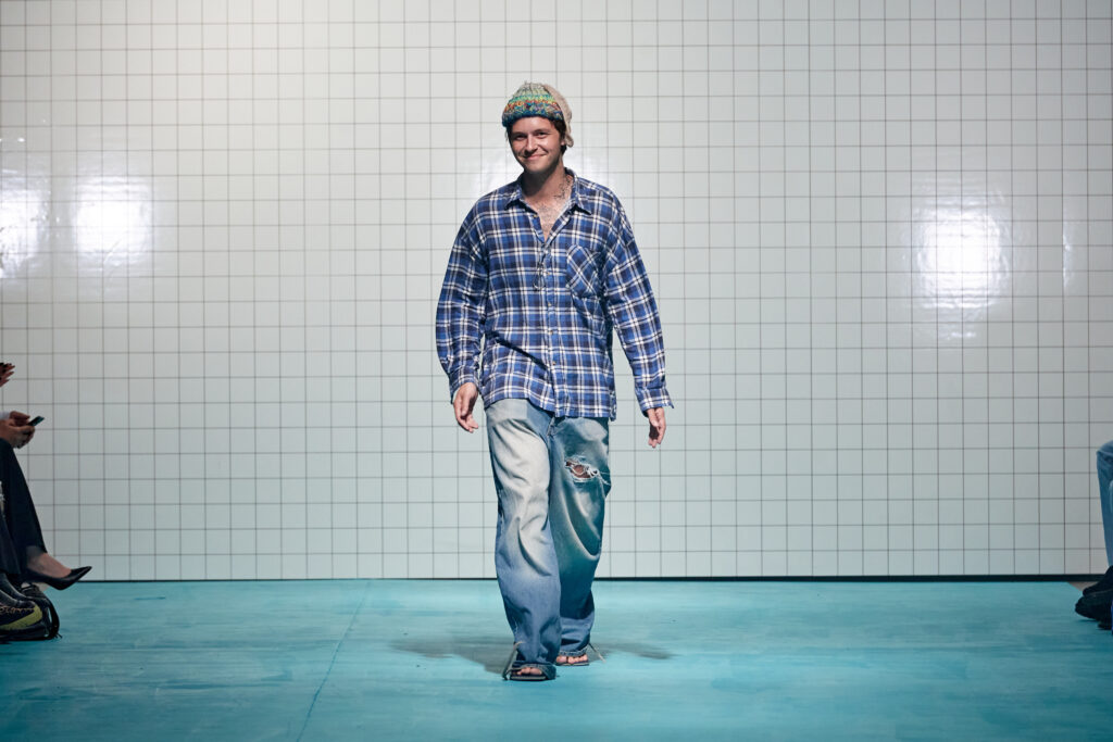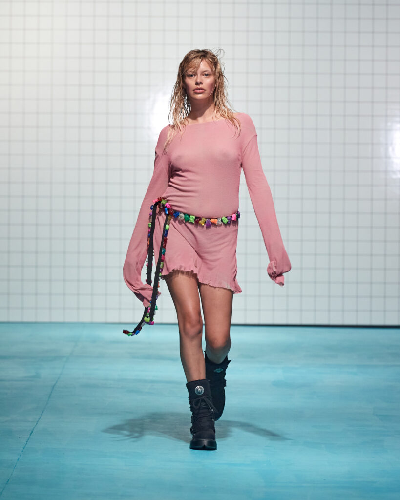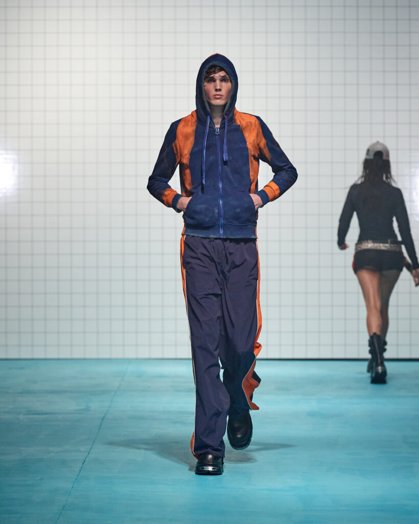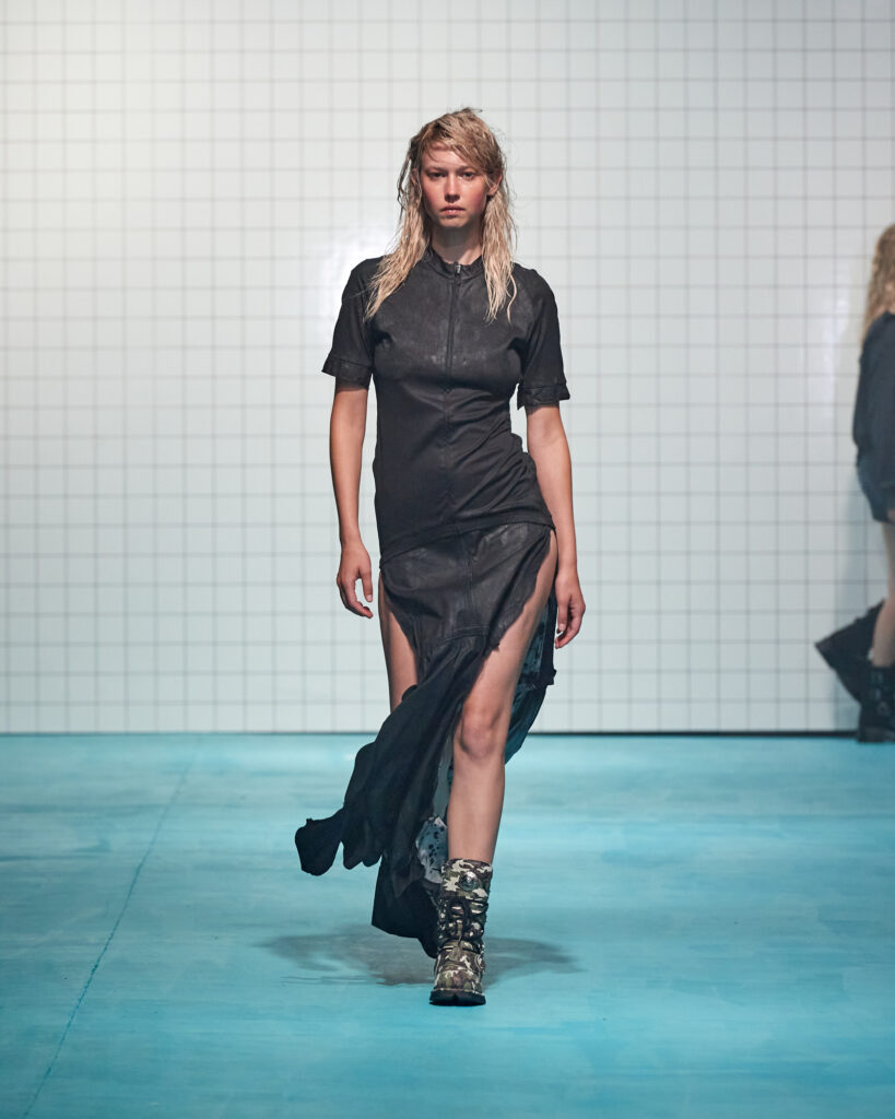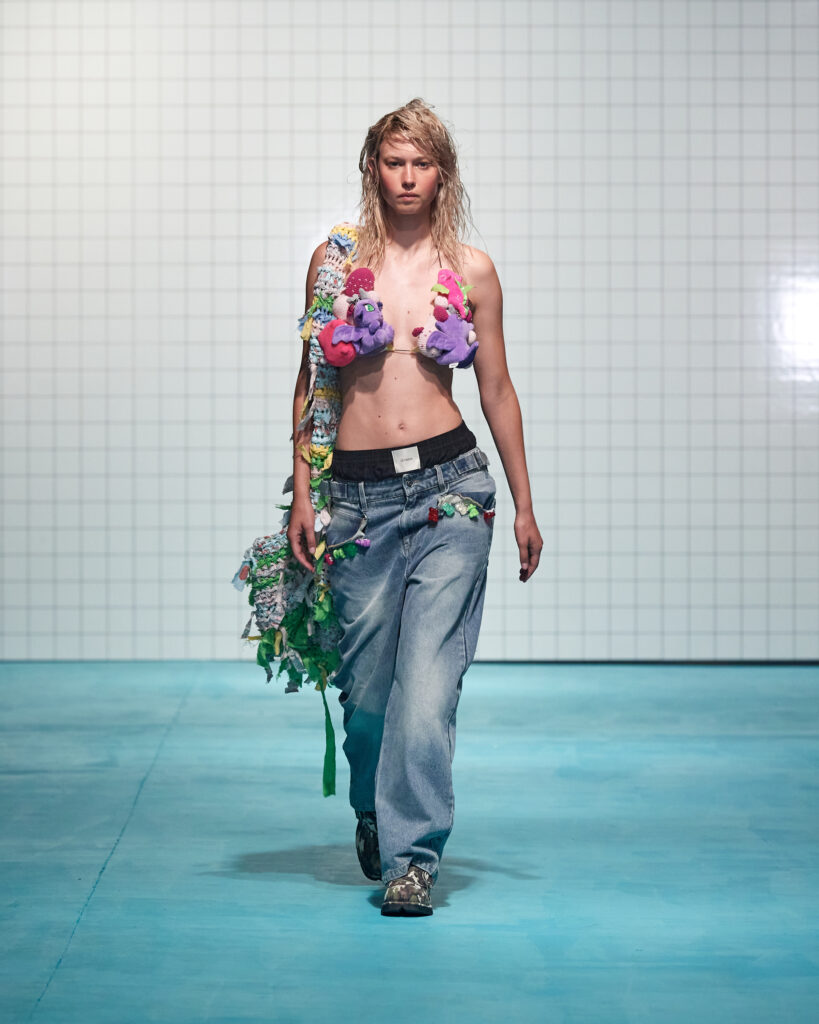 La collection SS25 de (di)vision présente un mélange éclectique de vêtements masculins et féminins, mettant en avant des pièces uniques upcyclées et des designs collaboratifs. Inspirée par le maximalisme urbain et les jeux vidéo, elle combine le « fairy grunge » à la nostalgie de la mode tokyoïte. Les superpositions et le recyclage sont essentiels pour des ensembles visuellement saisissants. Le denim vintage, la dentelle, le jersey et le cuir sont réutilisés pour leur caractère et leur impact. Les imprimés animaliers, les motifs à carreaux et les accessoires inspirés des années 2000 ajoutent une touche d’éclat, tandis que le « happy grunge » réinterprète le grunge avec des couleurs vives et des imprimés ludiques. De plus, la collection comprend une capsule créée en collaboration avec la brésilienne branchée Livia, également vedette de la campagne AW23 de (di)vision.