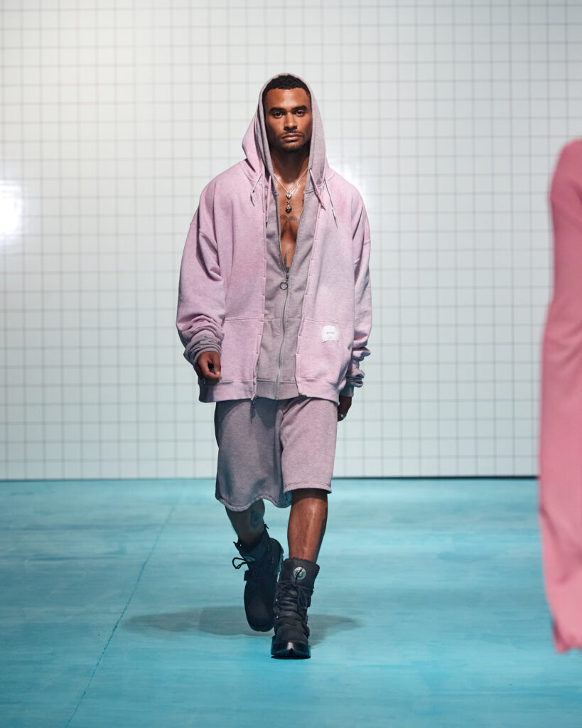 Simon Wick, co-fondateur et directeur créatif de (di)vision, explique : « J’ai toujours pensé que l’upcycling fonctionne mieux quand il est visuel. The Ordinary a été la force motrice derrière l’univers du décor du défilé. Je voulais travailler avec quelqu’un que je respecte, qui représente un univers simple et épuré, pour contraster avec mon univers coloré et stimulant. Steam City est le résultat de la combinaison de (di)vision et The Ordinary. »
