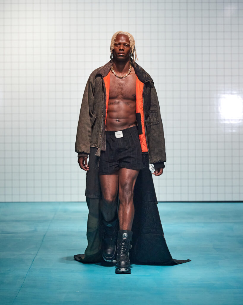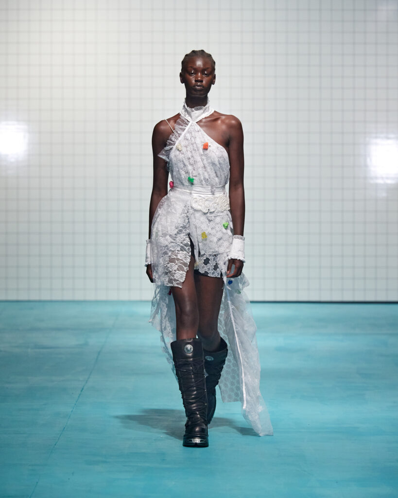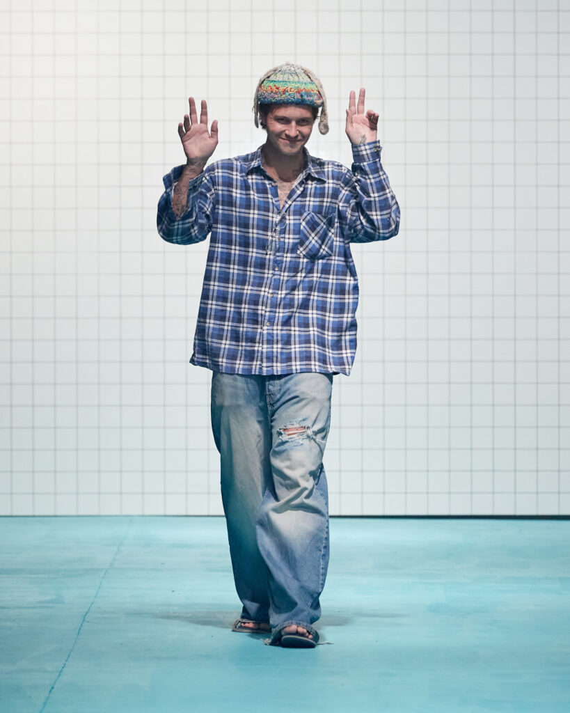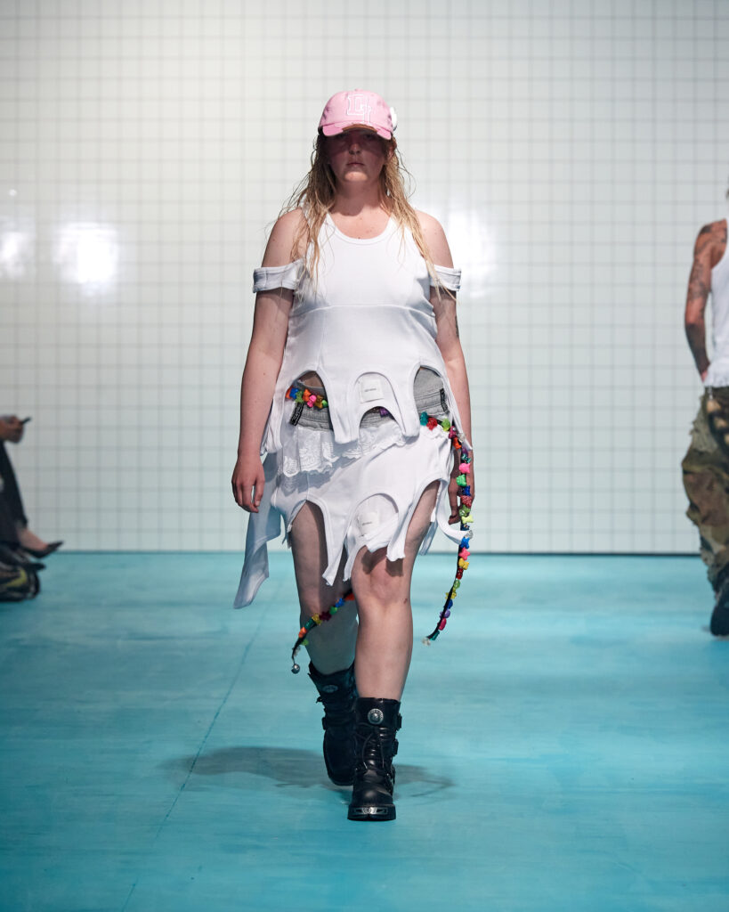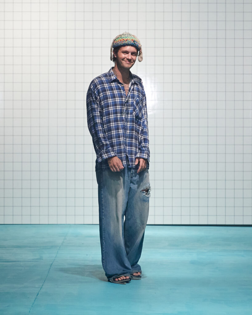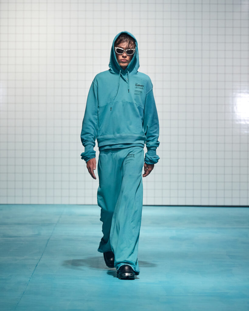 Le défilé a présenté une gamme de designs frappants, incluant un look entièrement en bleu signature de The Ordinary et un autre entièrement conçu à partir de matériaux d’emballage de la marque. Cet ensemble unique témoignait de l’ingéniosité de (di)vision et du dévouement de The Ordinary à l’éco-responsabilité, faisant une déclaration puissante sur le potentiel de la mode upcyclée.