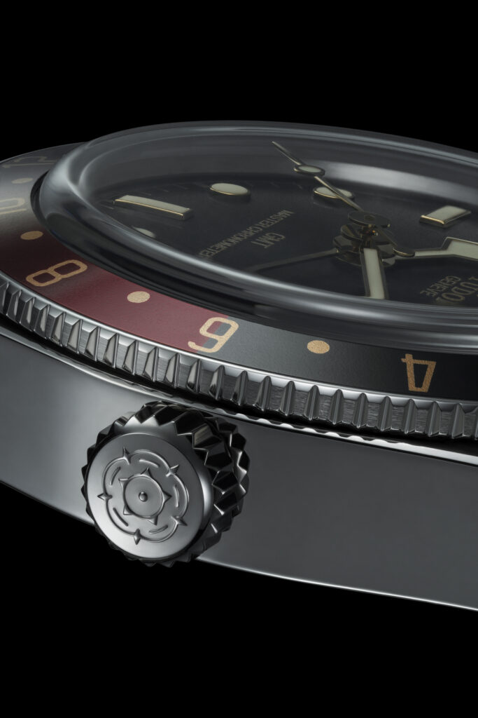 Cette montre est équipée d’une fonction GMT, idéale pour les voyageurs fréquents. L’aiguille GMT, associée à une graduation 24 heures, permet de suivre un second fuseau horaire. La couronne de remontoir en acier vissée, ornée de la rose Tudor en relief, assure une étanchéité jusqu’à 200 mètres, faisant de cette montre un compagnon parfait pour toutes les aventures, terrestres ou maritimes.