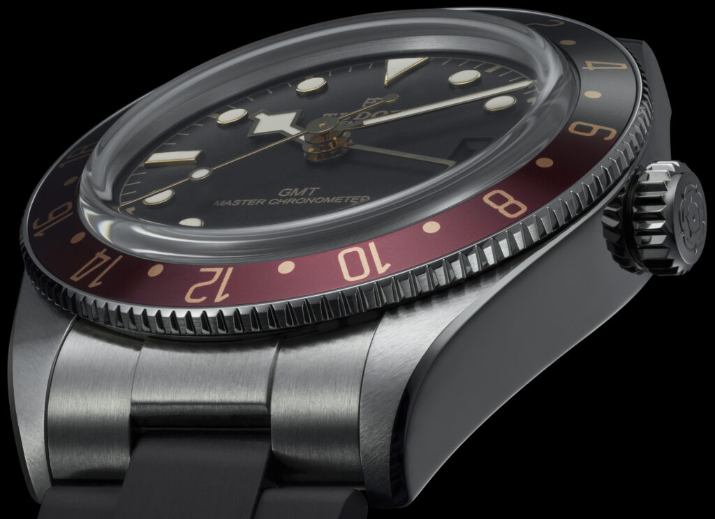 La Black Bay 58 GMT arbore un boîtier en acier de 39 mm, fidèle aux proportions des années 1950. Sa lunette bidirectionnelle en bordeaux et noir, ornée de touches dorées, évoque les teintes chaudes et sophistiquées de cette époque. Le cadran noir mat, légèrement bombé, est subtilement rehaussé de détails dorés et d’index appliqués, conférant à la montre une allure à la fois vintage et contemporaine.
