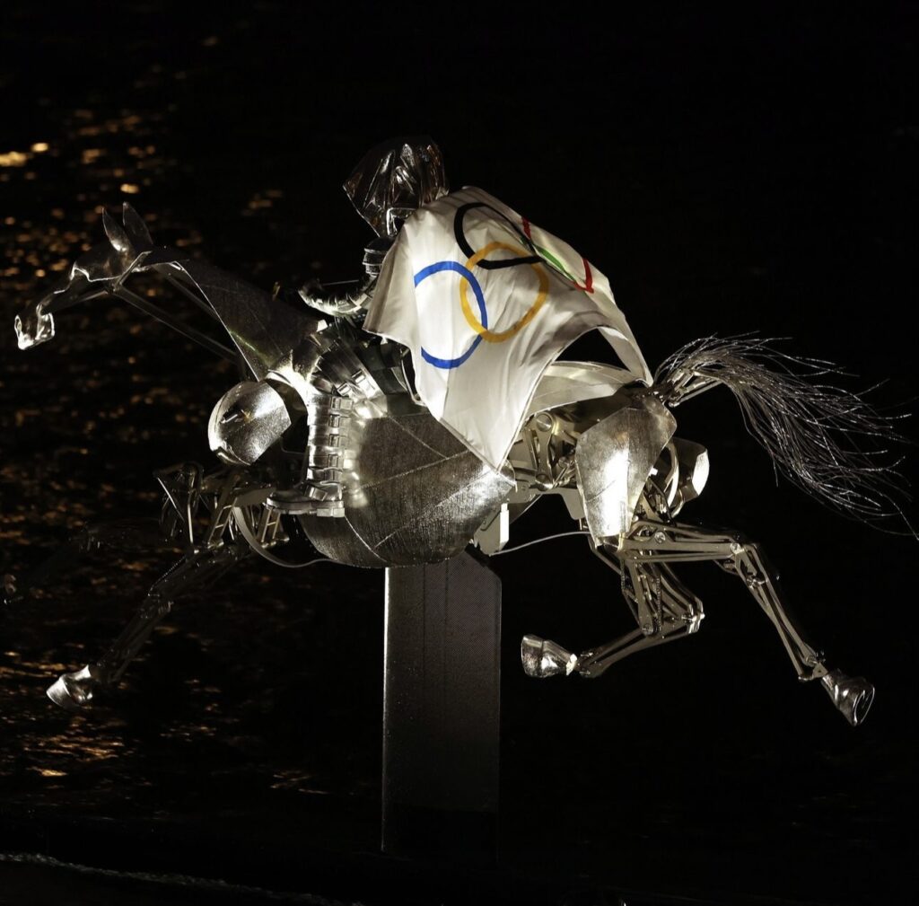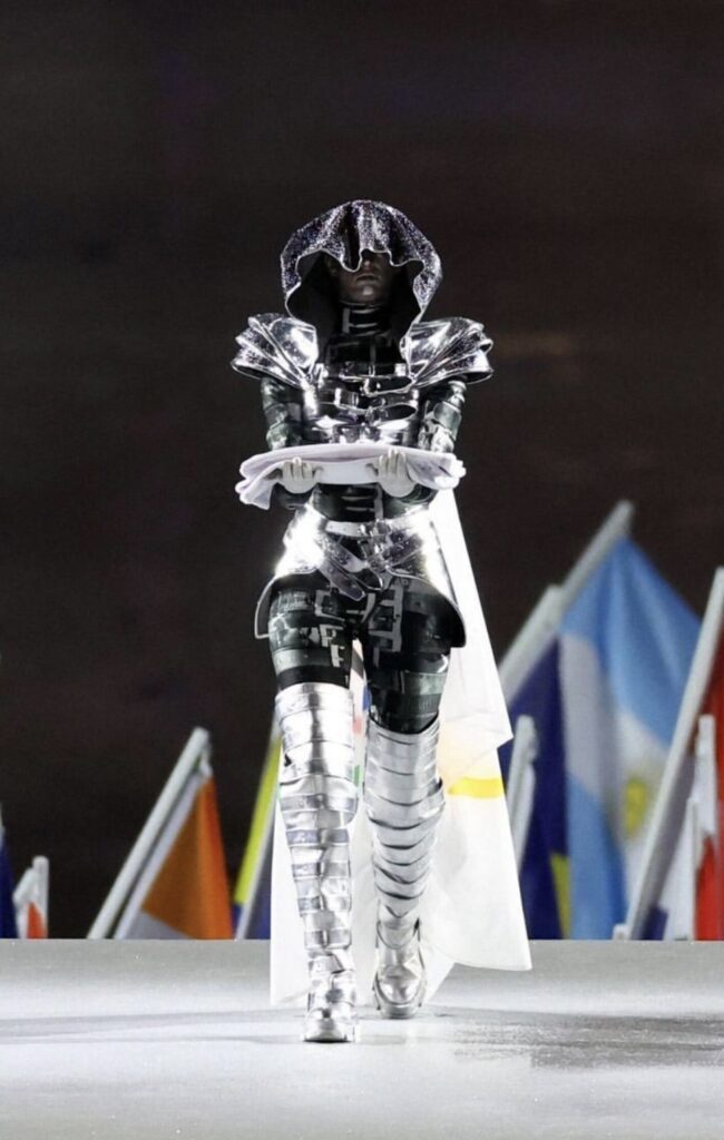 Jeanne d’Arc, figure historique de la France, se voit ici réinterprétée sous un jour résolument moderne et progressiste. Le choix de cette héroïne pour ouvrir les Jeux Olympiques de Paris 2024 ne relève pas du hasard. Symbole de courage, de liberté et d’innovation, elle incarne désormais une France tournée vers l’avenir, ancrée dans les enjeux sociétaux actuels. La tenue signée Jeanne Friot, qui accompagne ces bottes, est un hommage aux valeurs de force et de détermination que cette nouvelle Jeanne d’Arc porte avec fierté à travers les rues de Paris, du Pont d’Austerlitz au Trocadéro.