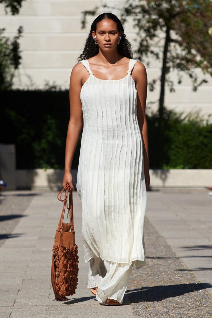 Les formes sculpturales et les éléments structurés soulignent la connexion avec les œuvres de Hesse, créant une sensation de découverte dans chaque tenue. Présentée à la Copenhagen Fashion Week, la collection illustre une transition fluide entre la journée de travail et les événements du soir, brouillant les frontières entre la vie professionnelle et personnelle. La palette de couleurs discrète, incluant des teintes de blé, de vanille et de vert, confère à la collection une élégance sereine. L’accent mis sur des matériaux innovants et durables, tels que l’acétate Naia, souligne l’engagement de la marque en faveur d’un avenir de la mode responsable.