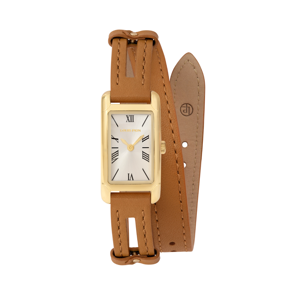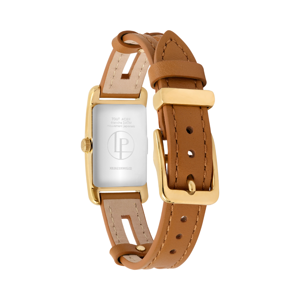 - Boîtier acier doré clair, bracelet en cuir camel double tour : 150 €
