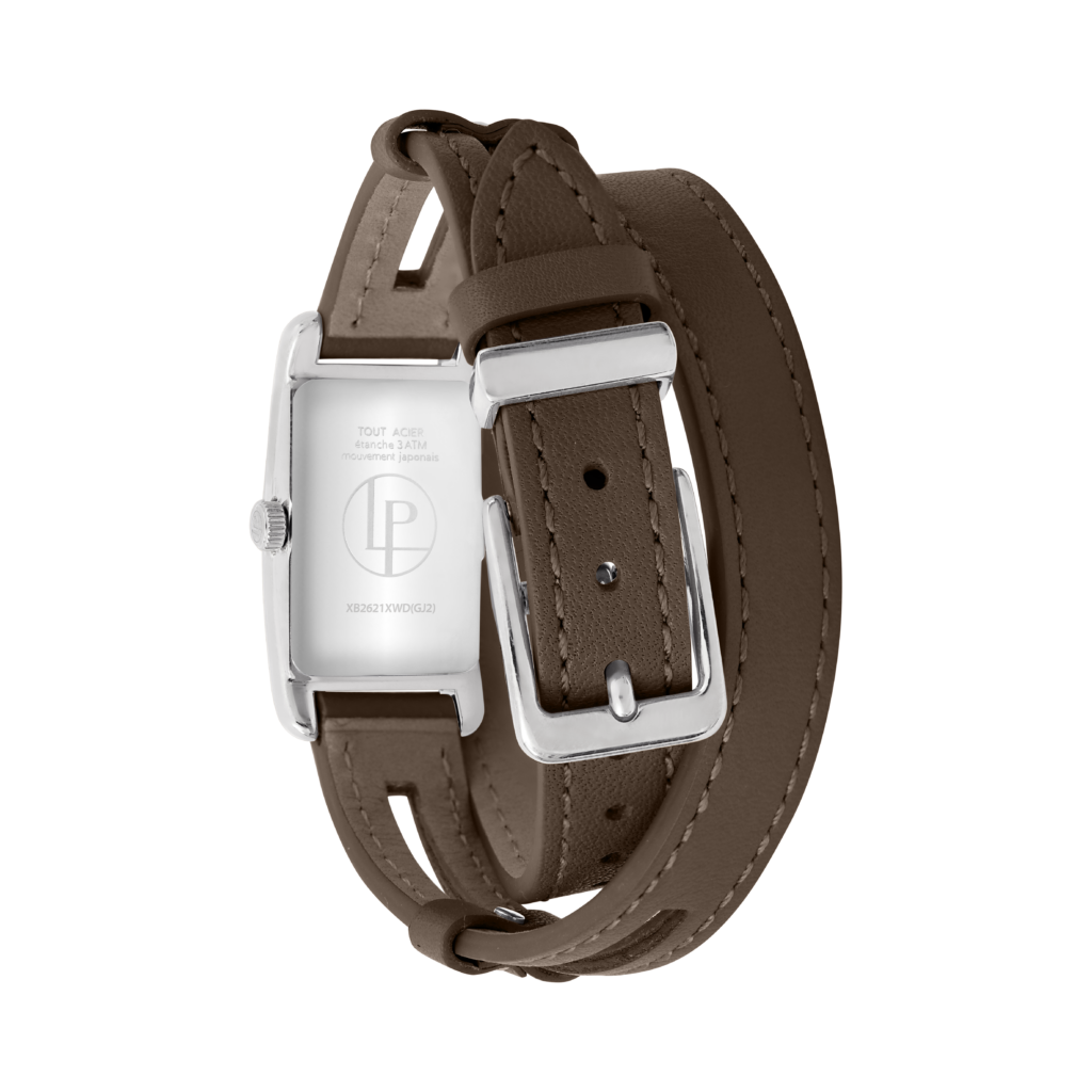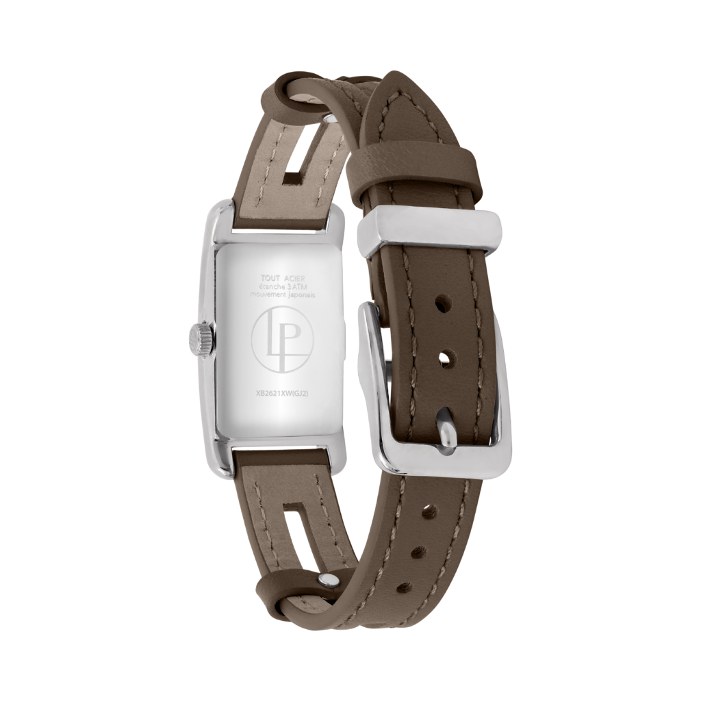 - Boîtier acier argenté, bracelet en cuir taupe double tour : 140 €