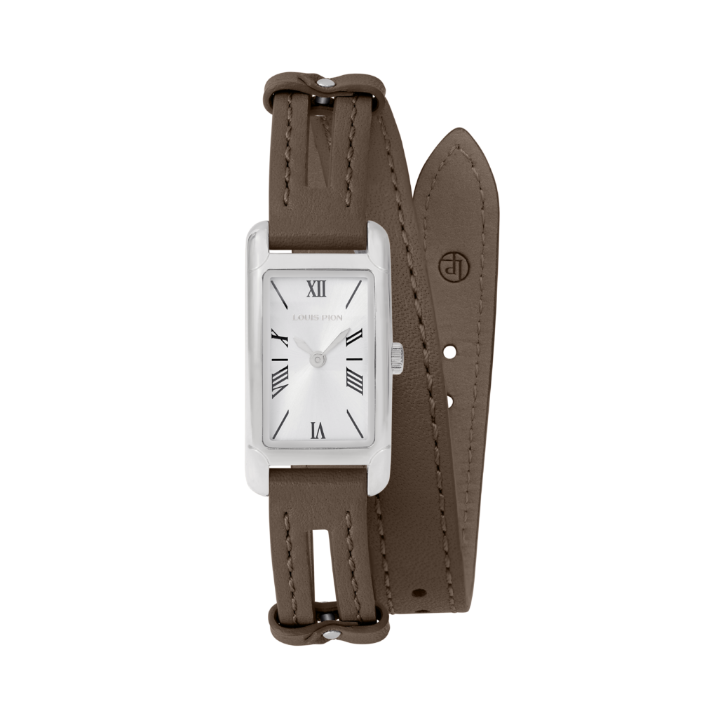 La version double tour de la PHILIPPINE révèle un caractère plus affirmé et moderne. Elle offre deux modes de port : un porté croisé où le cuir passe derrière le boîtier et un porté parallèle où le cuir se place à côté du boîtier. Ce design innovant permet à chaque utilisateur de personnaliser son style selon ses préférences.