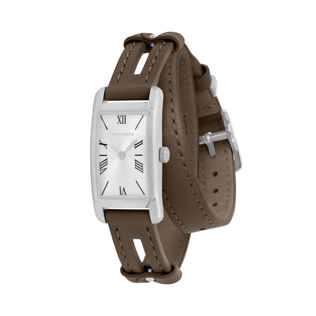 - Boîtier acier argenté, bracelet en cuir taupe simple tour : 120 €