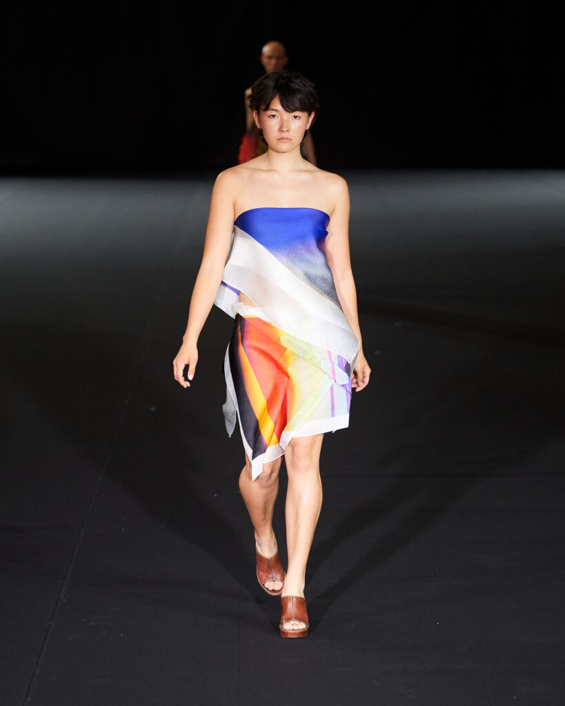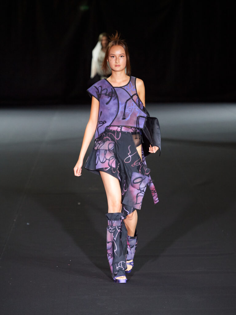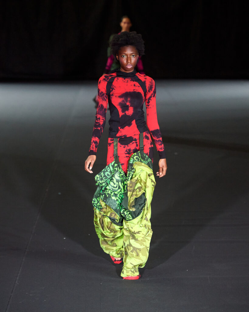 1. Mai Sakamoto : Originaire de Tokyo, Mai Sakamoto réinvente la mode avec sa collection de fin d’études intitulée « Lovebomb ». Utilisant des uniformes militaires de stock mort, elle transforme ces objets culturels destructeurs en générateurs de compassion pour les écosystèmes planétaires et les sociétés futures. Sa collection utilise des expérimentations textiles audacieuses et des couleurs vives pour inspirer la transformation et la guérison dans notre futur commun.