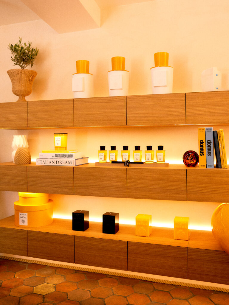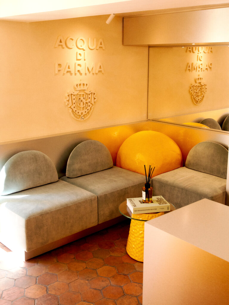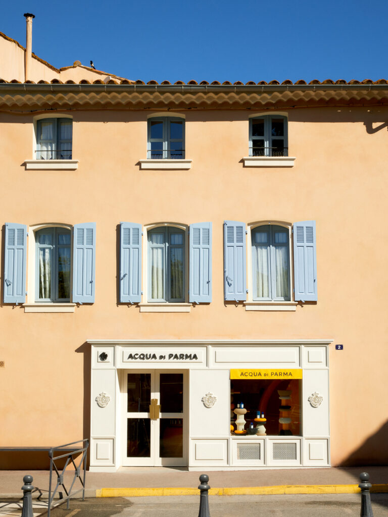 L’architecture de la boutique rend hommage au style provençal tout en intégrant des éléments distinctifs de la marque. Les portes vitrées, ornées de poignées en métal brossé doré, évoquent subtilement la forme Art Déco des emblématiques flacons de parfum Colonia. Cette attention aux détails témoigne de la volonté d’Acqua di Parma de créer une expérience immersive, où chaque élément raconte une histoire.