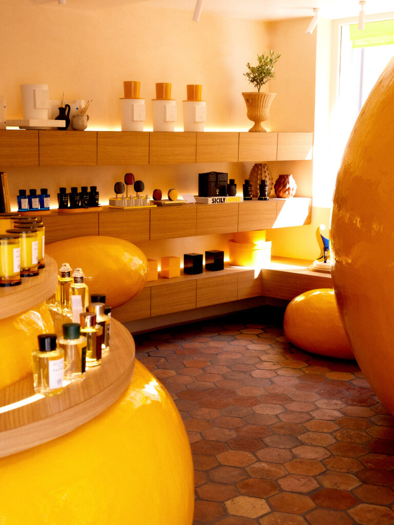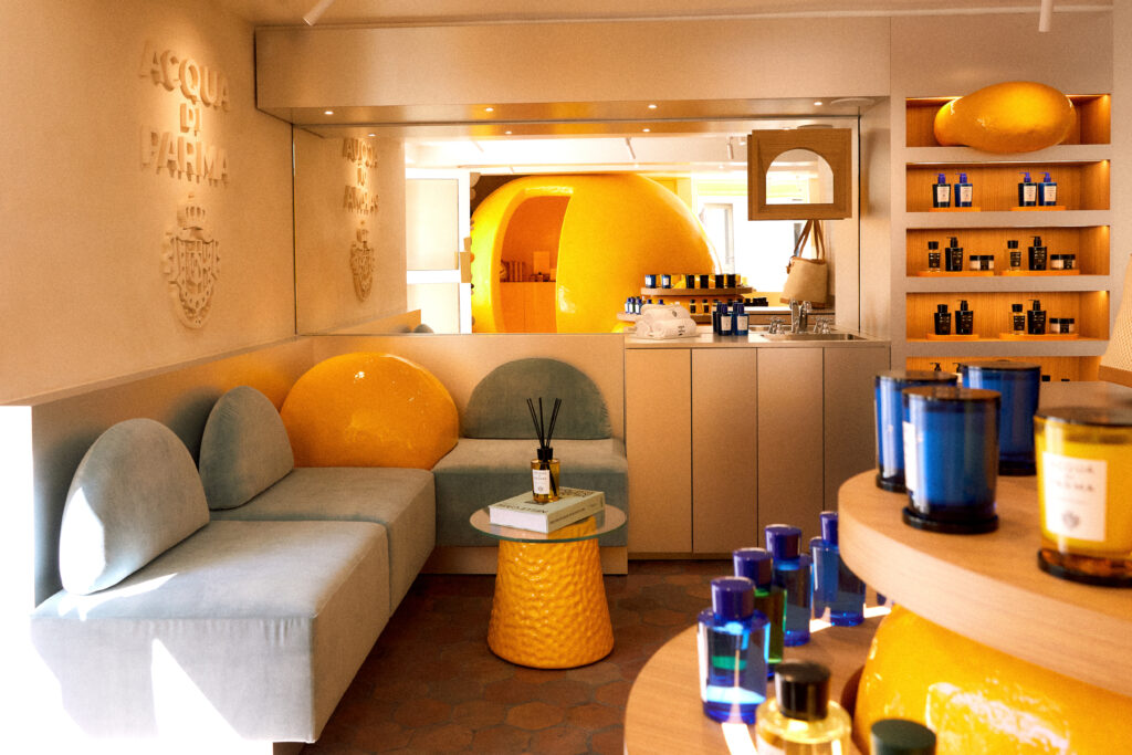 À l’intérieur, le voyage sensoriel se poursuit. Des formes audacieuses de fruits dorés parsèment l’espace, rendant un hommage esthétique aux agrumes italiens qui font la signature olfactive de la maison. Point d’orgue de cette mise en scène, une structure géante de fruit doré trône fièrement, invitant les visiteurs à plonger plus profondément dans l’univers Acqua di Parma. Cette scénographie dynamique met en valeur les collections de la maison, offrant aux clients une expérience d’achat unique et mémorable.
