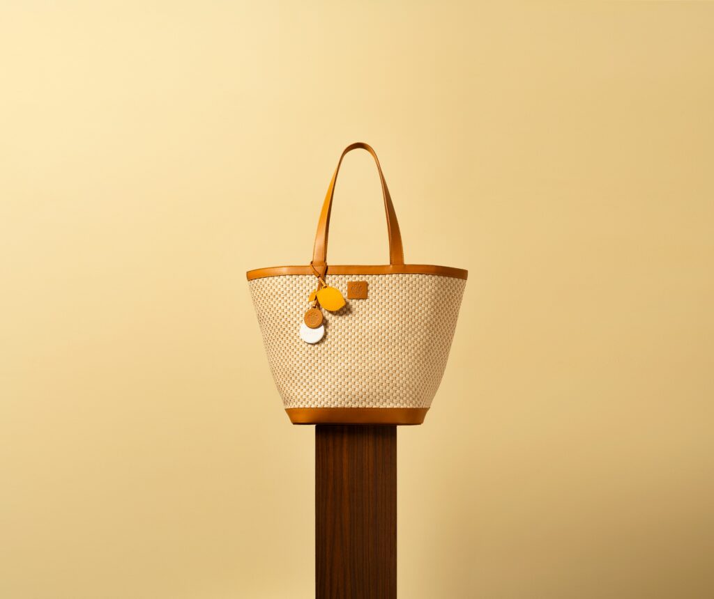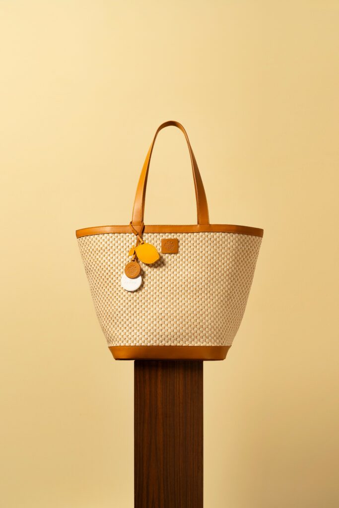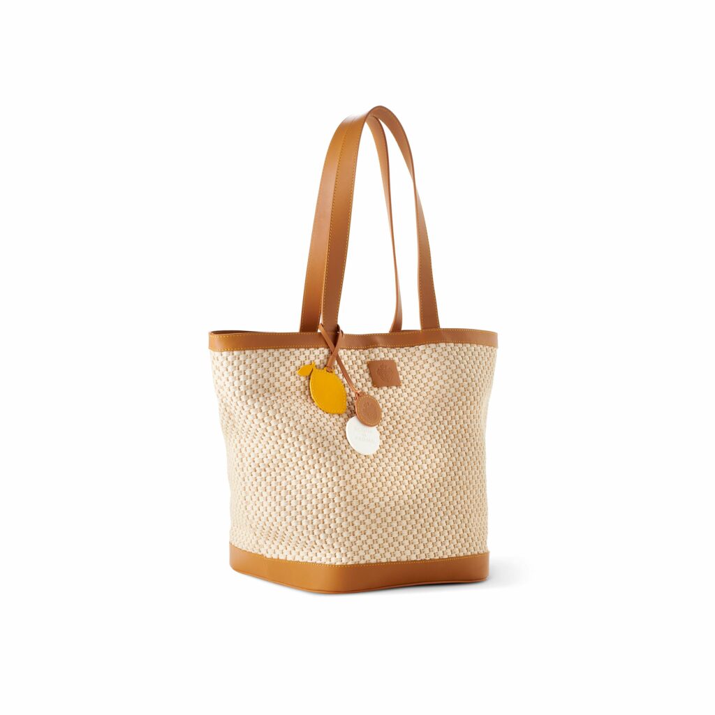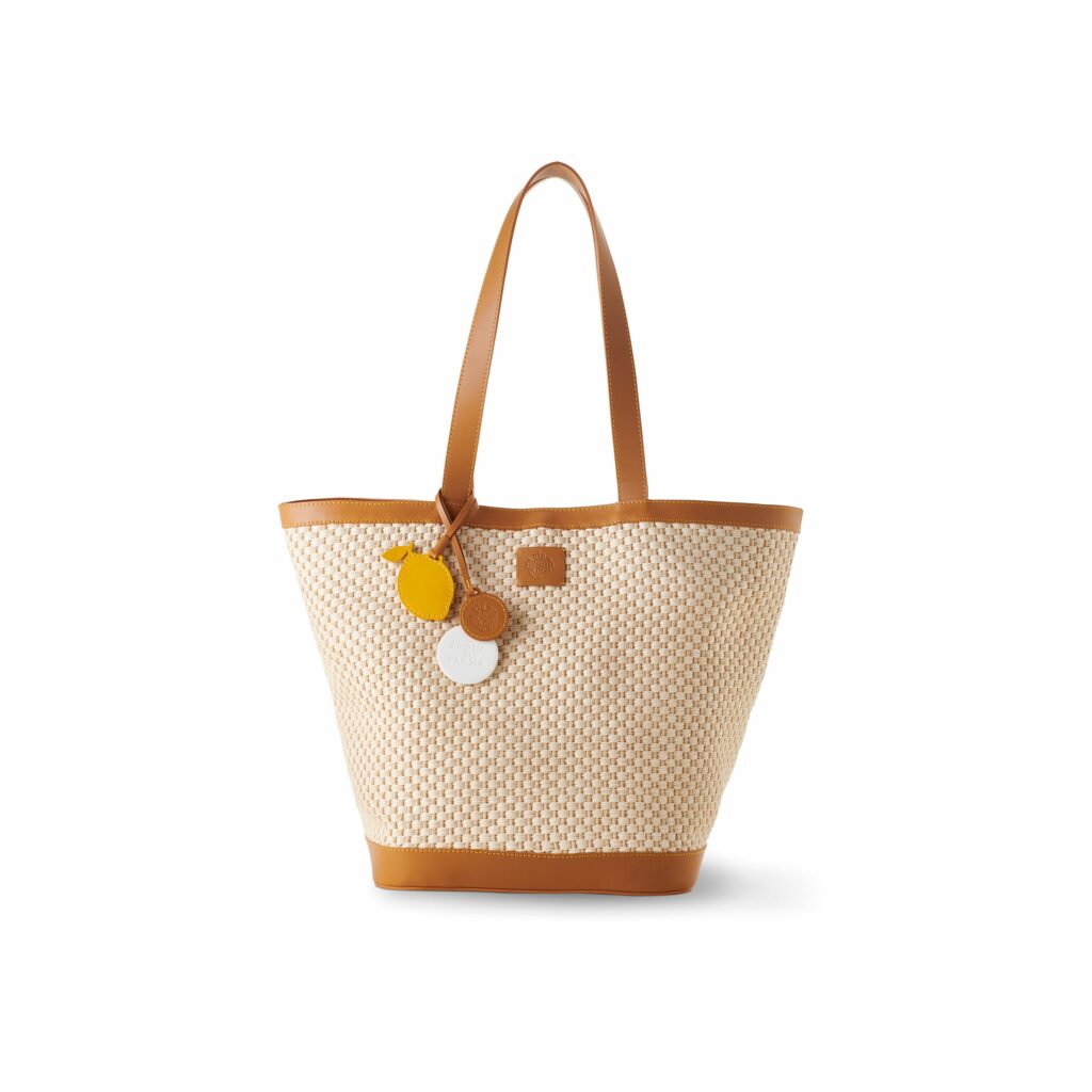 Pour ceux qui préfèrent les sorties en ville, le Sac Cabas offre une alliance parfaite entre style et praticité. Confectionné en raphia naturel avec une doublure en toile, il est rehaussé de bords en cuir de veau brun et de surpiqûres jaunes audacieuses, signature visuelle de la marque. Le sac est accompagné de trois breloques amovibles : une étiquette en cuir en forme de citron, une autre portant l’emblème gaufré d’Acqua di Parma, et une étiquette en céramique parfumée pour une expérience sensorielle complète.