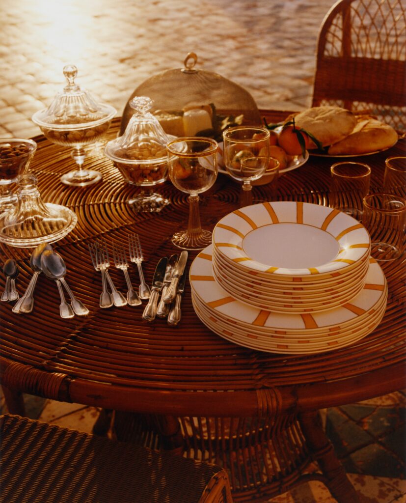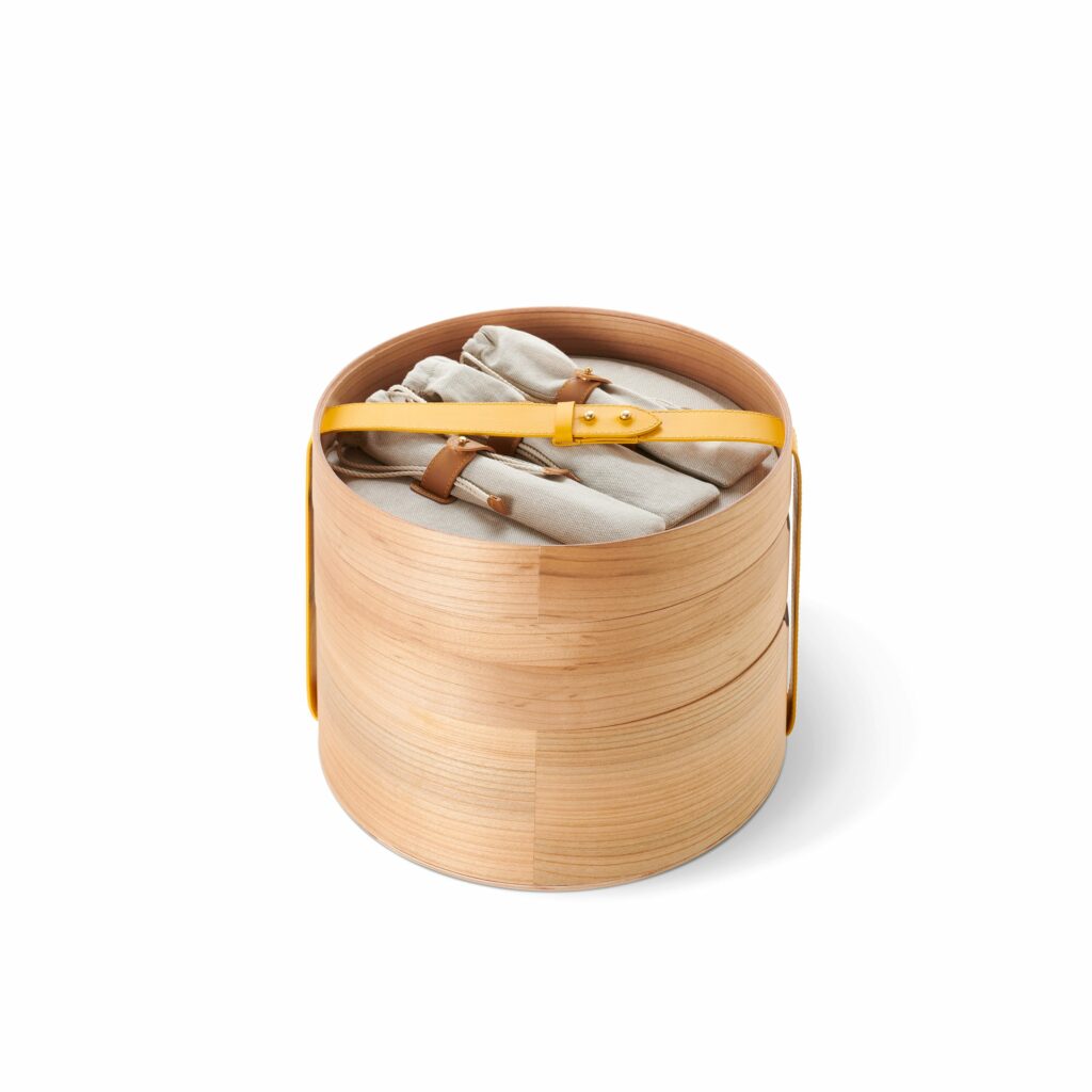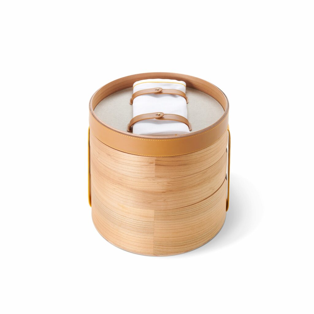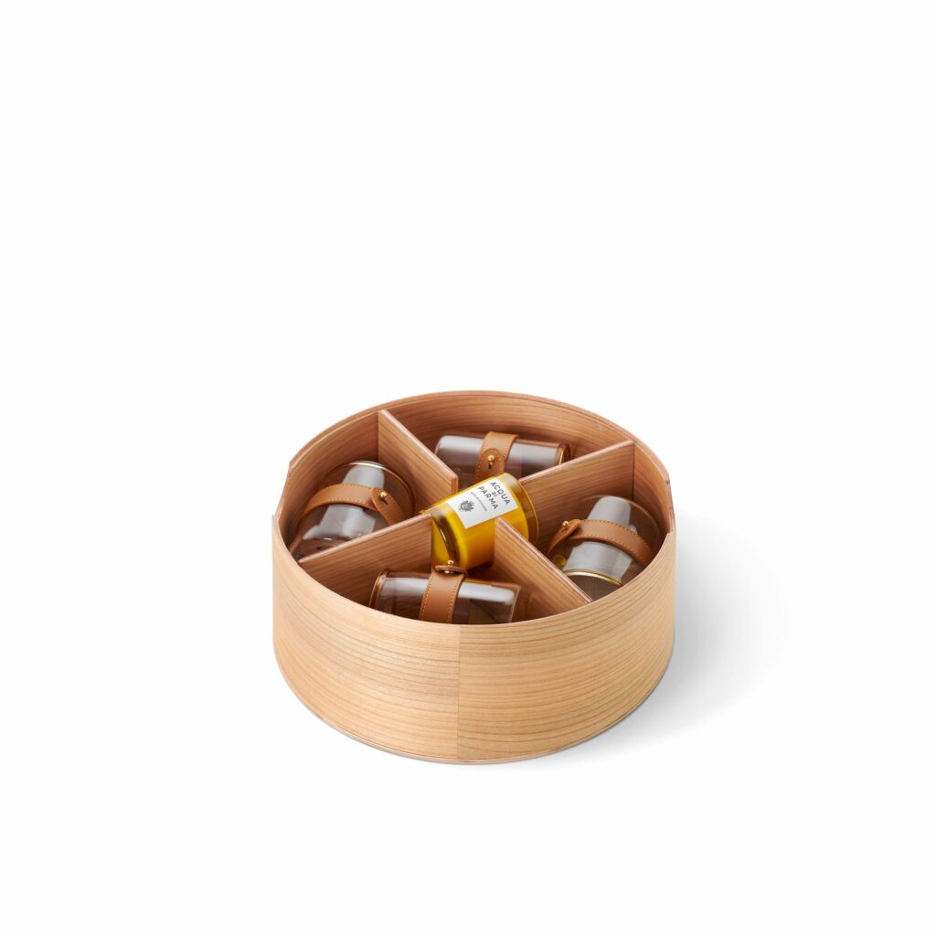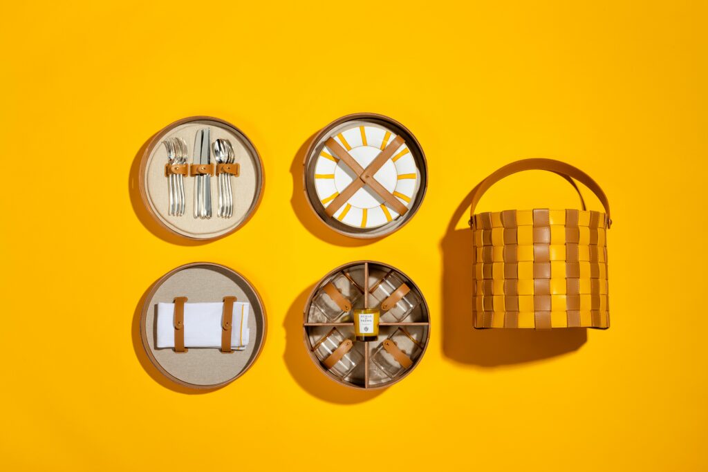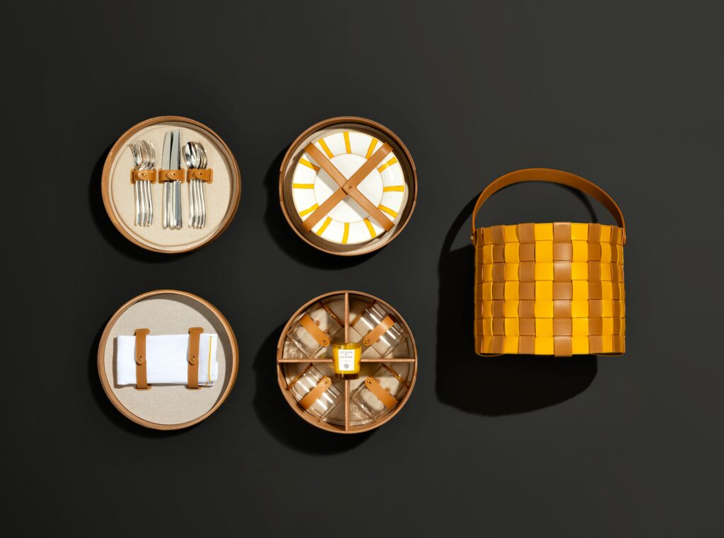 Parmi les pièces maîtresses de cette collection, le panier pique-nique « Buongiorno » se distingue par son attention aux détails et son luxe discret. Enveloppé dans un écrin de cuir aux couleurs emblématiques d’Acqua di Parma, ce panier renferme un véritable trésor : des assiettes et des verres signés par la maison, des couverts Christofle Mood et une bougie parfumée « Buongiorno ». Chaque élément, des séparateurs en bois de cerisier aux sangles en cuir de veau, respire la qualité et le raffinement.