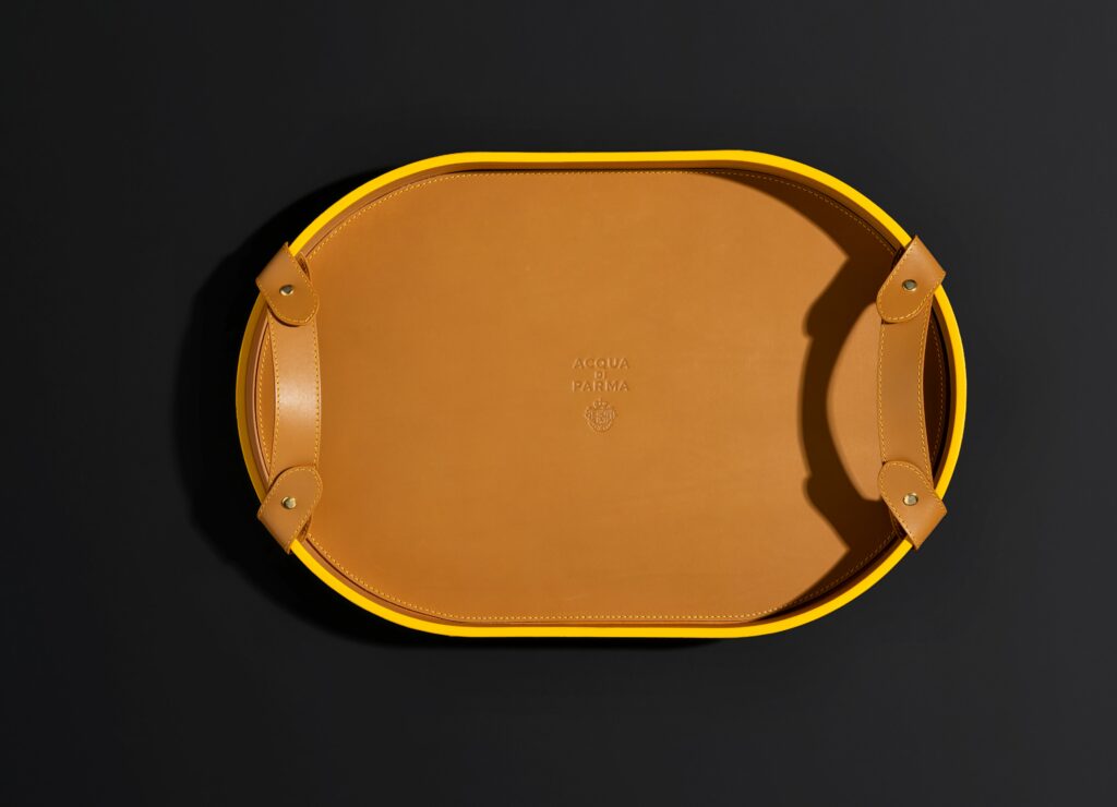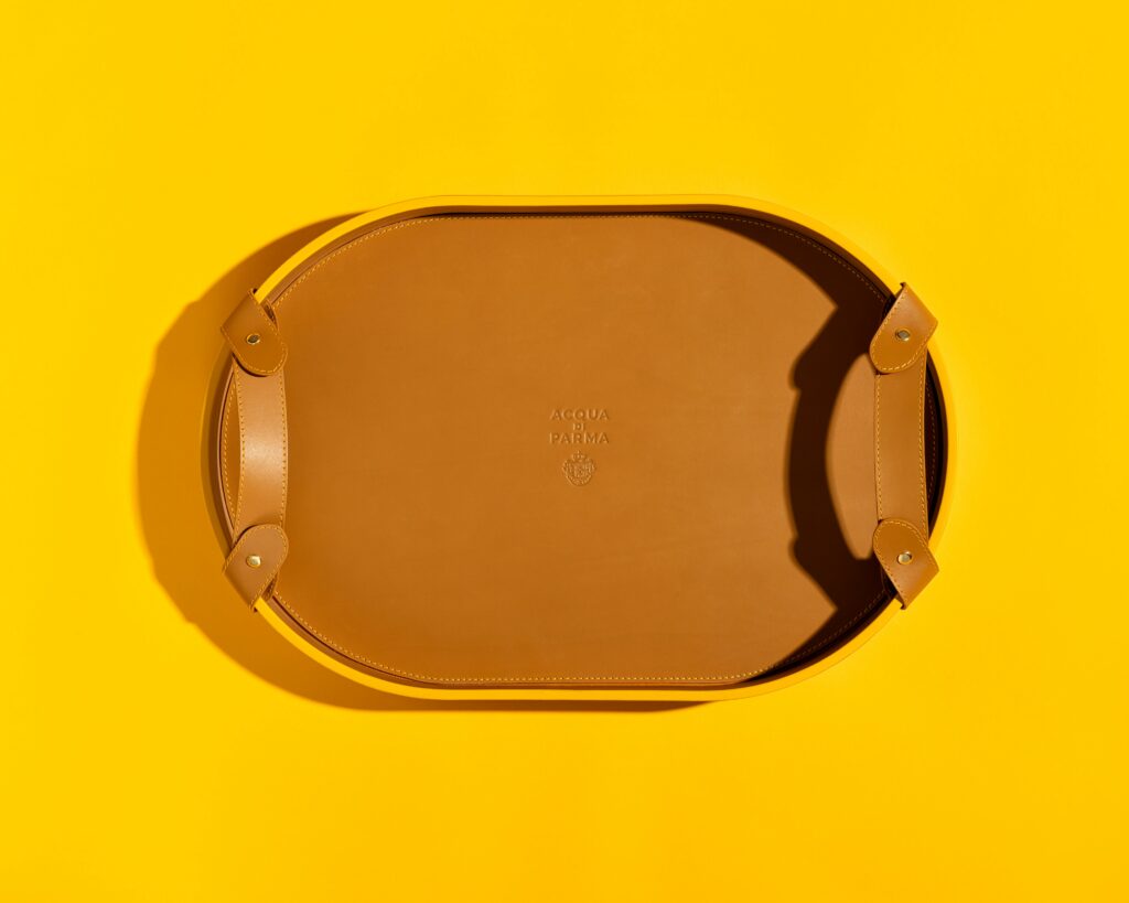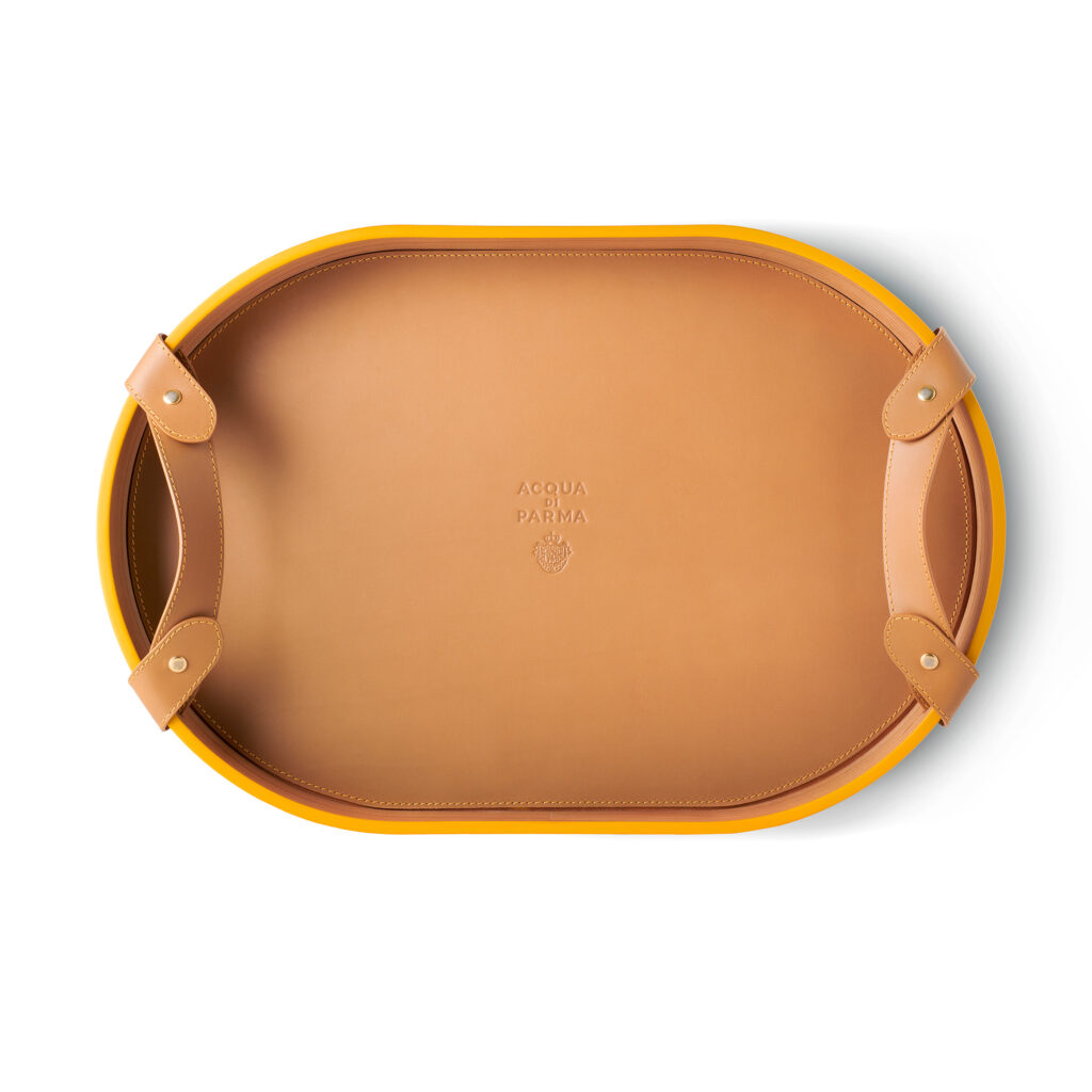 Complétant cette collection, le plateau en bois de cerisier s’impose comme un accessoire indispensable pour les amateurs de vie en plein air. Son grain fin, associé à des poignées et une base en cuir de veau brun, en fait un objet à la fois élégant et robuste. Le logo Acqua di Parma et les finitions jaunes ajoutent une touche de luxe discret à ce design classique.