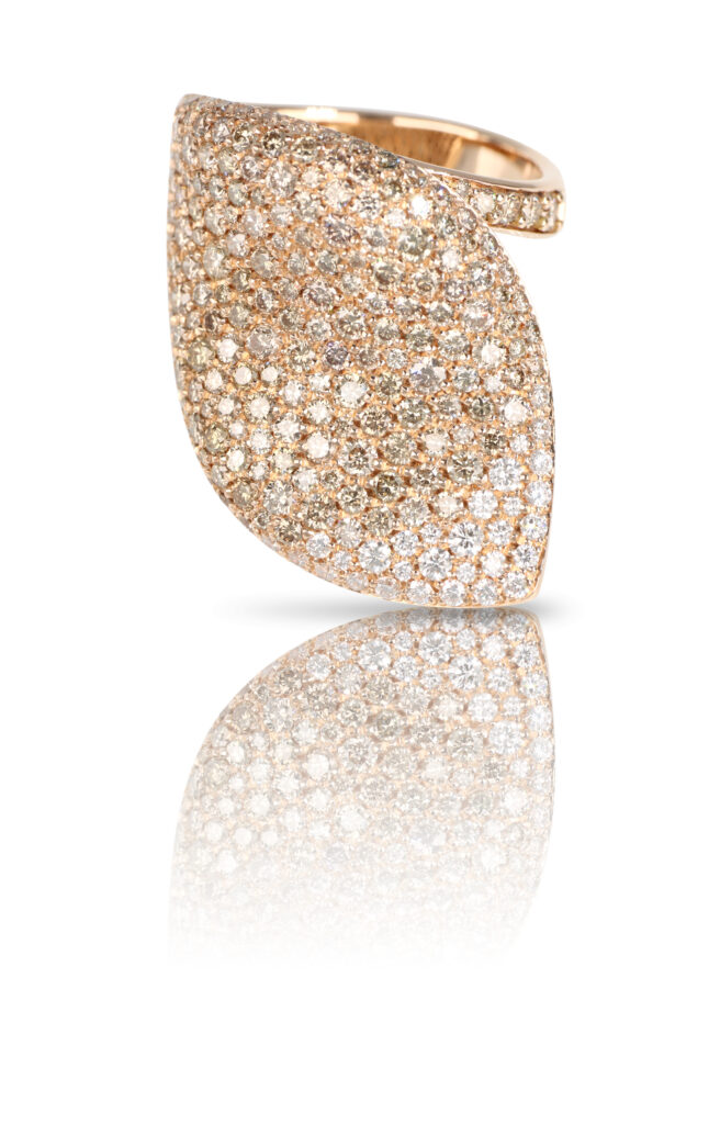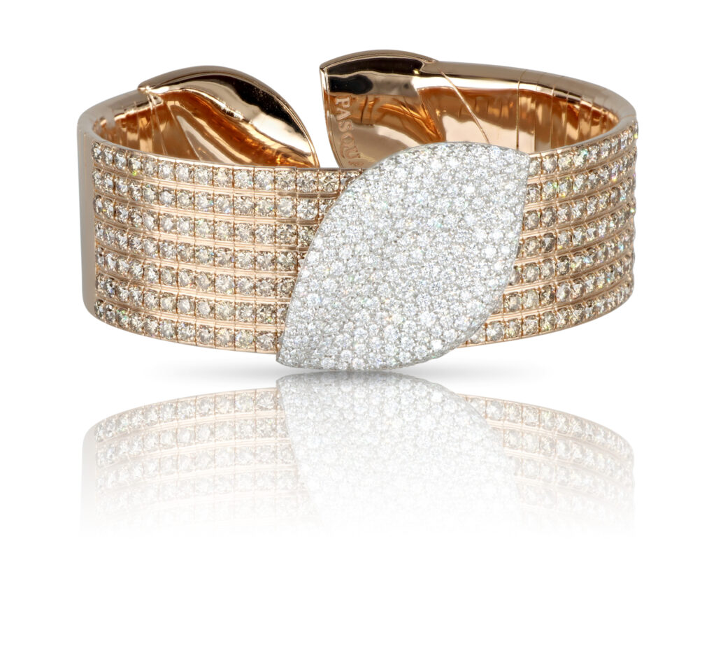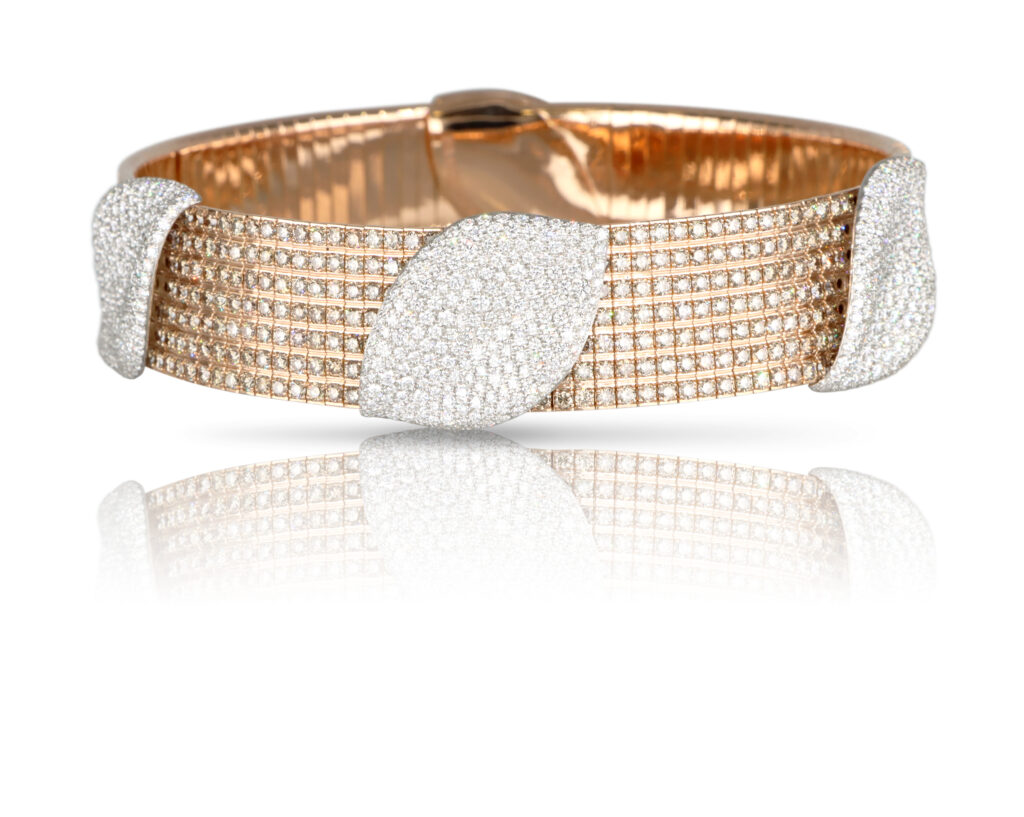 Au cœur de cette collection se trouvent deux pièces emblématiques : un chocker et un bracelet. Ces bijoux associent à la perfection l’or rose et blanc aux diamants champagne et blancs, créant ainsi une harmonie visuelle et une brillance captivante. Le chocker, avec sa forme délicate et sa texture raffinée, enveloppe le cou avec grâce, tandis que le bracelet, avec ses courbes élégantes, embellit le poignet de manière subtile mais remarquable.