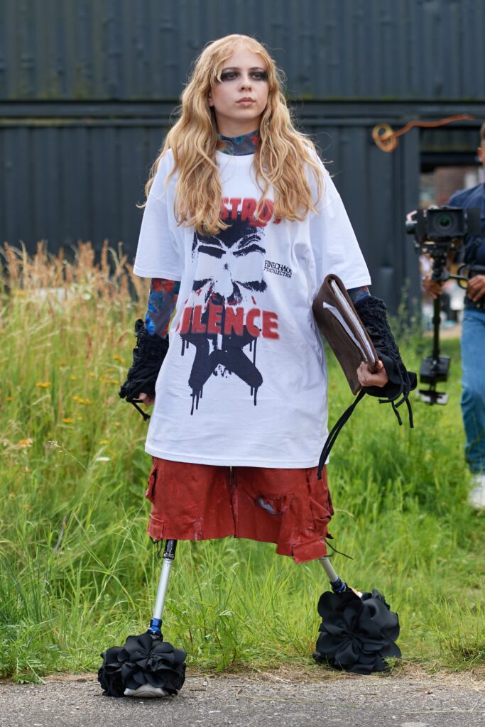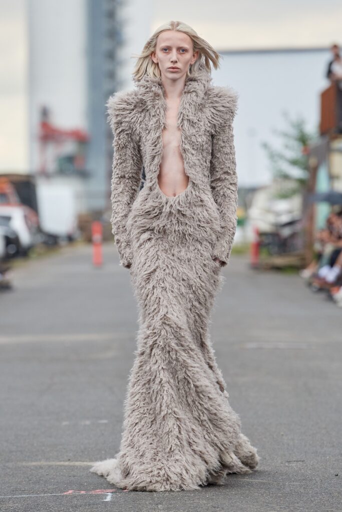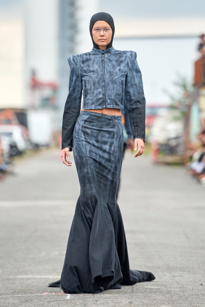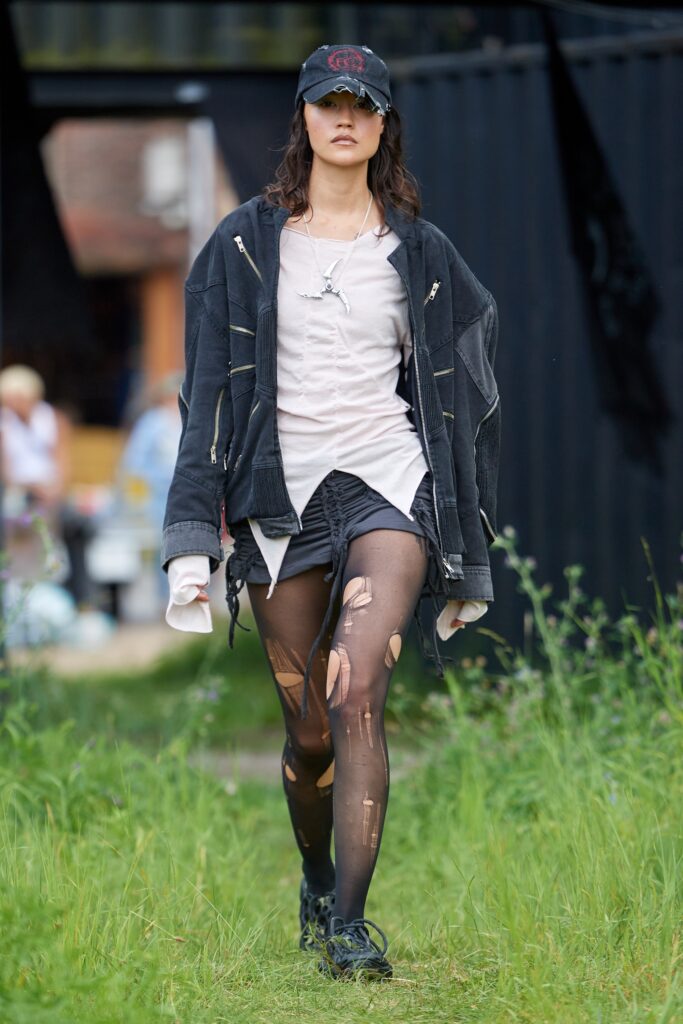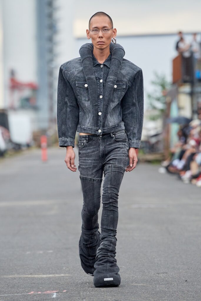 Han Kjøbenhavn présente une nouvelle collection qui offre une interprétation futuriste de la mode de rue, inspirée par les souvenirs d’enfance du designer. Les formes surréalistes et les silhouettes inhabituelles en denim et en cuir, telles que les épaules larges et les leggings superposés, reflètent le désir d’exprimer des émotions extrêmes à travers les vêtements. La collection se caractérise par une esthétique pratique, axée sur les besoins réels des gens plutôt que sur le podium. Le denim, associé à la fourrure artificielle et au cuir, crée une profondeur tactile et relie la collection aux premières années du designer. Cette saison a été l’occasion pour Han Kjøbenhavn d’exprimer la voix de sa famille et ses souvenirs d’enfance à travers la mode.