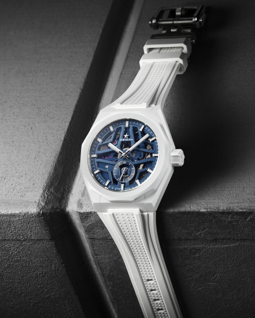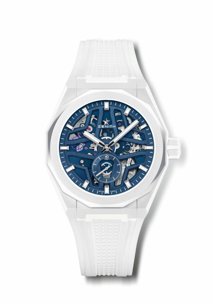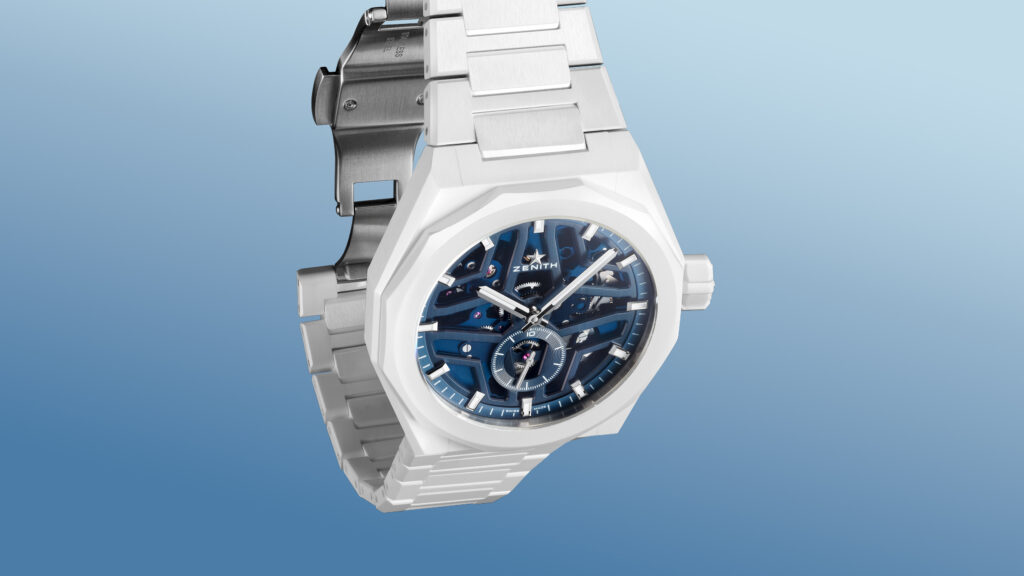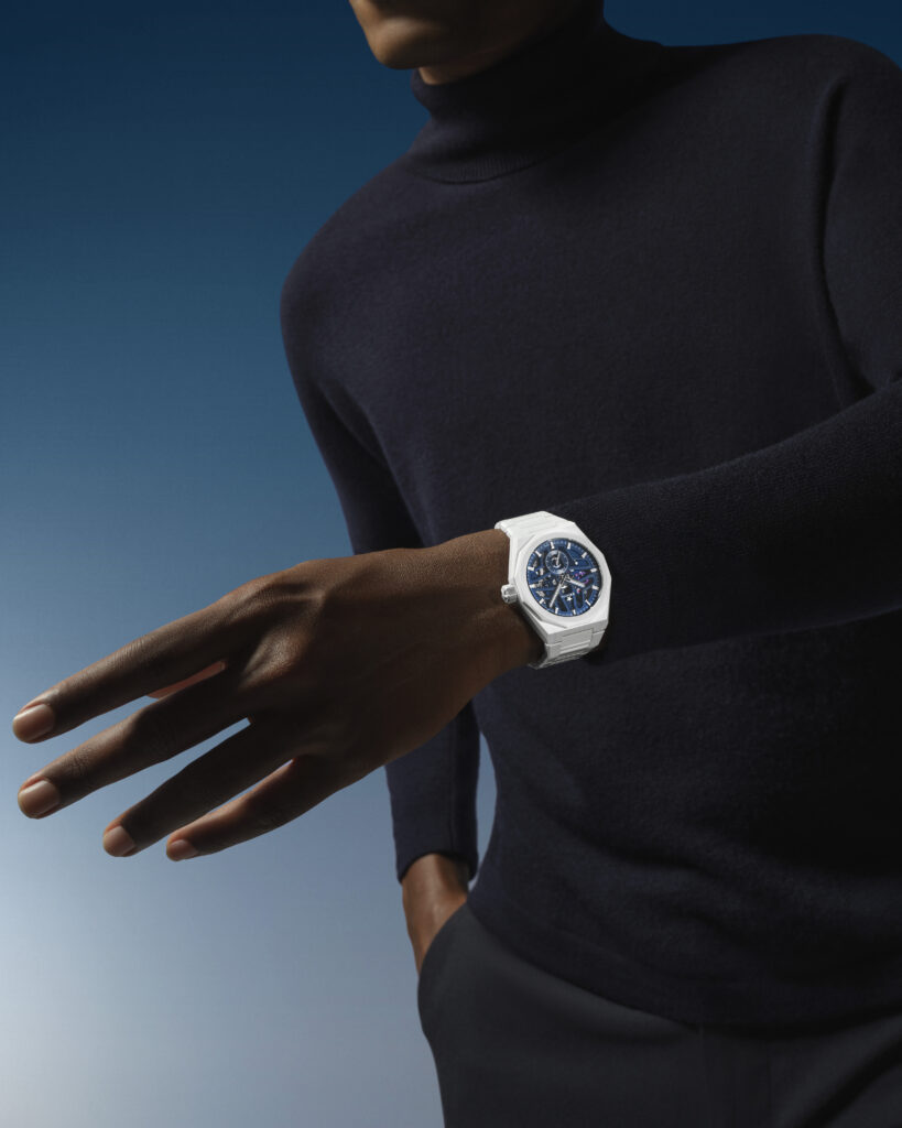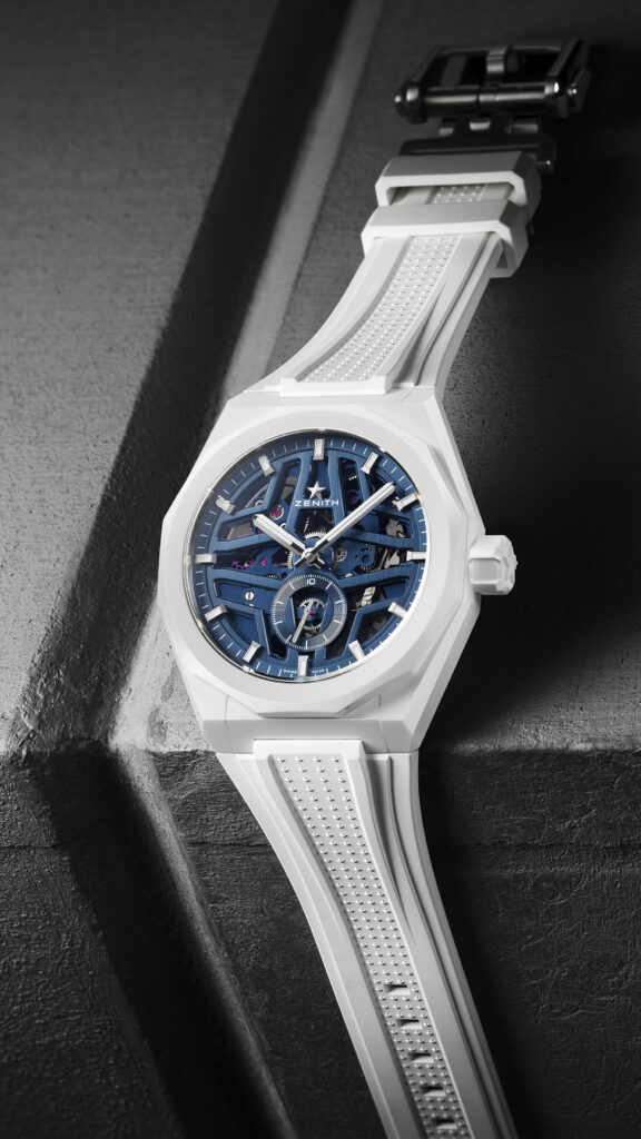 La DEFY Skyline Skeleton en céramique blanche se distingue par ses lignes architecturales audacieuses et sa robustesse, caractéristiques emblématiques de la collection DEFY. Le cadran ajouré, inspiré de l’étoile à quatre branches de Zenith datant de 1969, révèle un mouvement squelette d’un bleu profond, créant un jeu de lumière captivant qui varie selon l’angle de vue.